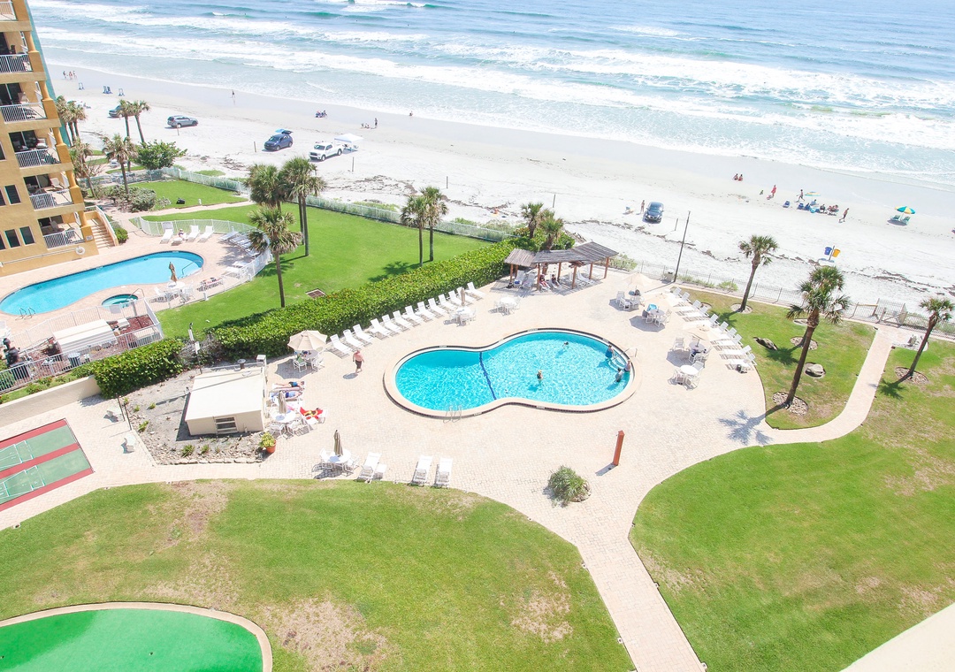 Golden Arms Condominiums is one of the premiere oceanfront complexes located along the northern shores of New Smyrna Beach. Along with its stunning direct ocean view and private beach access, guests love its prime location that's only steps away from local shopping and dining along the famous, historic Flagler Avenue. This 88-unit complex resides on the northern, driving section of New Smyrna Beach. In addition to its coveted location, all of Golden Arm's units are approximately 1,250 square feet and boast of full kitchens, large living areas, spacious bedrooms, half-moon balconies, and garage parking for your vehicle. Guests return year after year to enjoy the excellent on-site amenities which include direct beach access, a seasonally heated pool, shuffleboard courts, a putting green, and an on-site carwash.