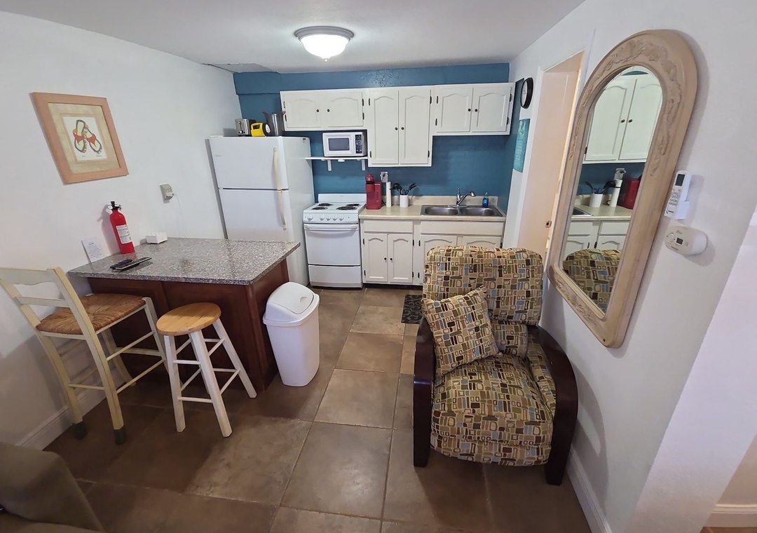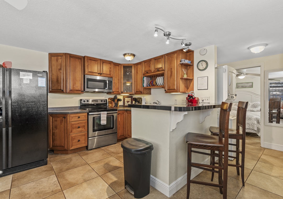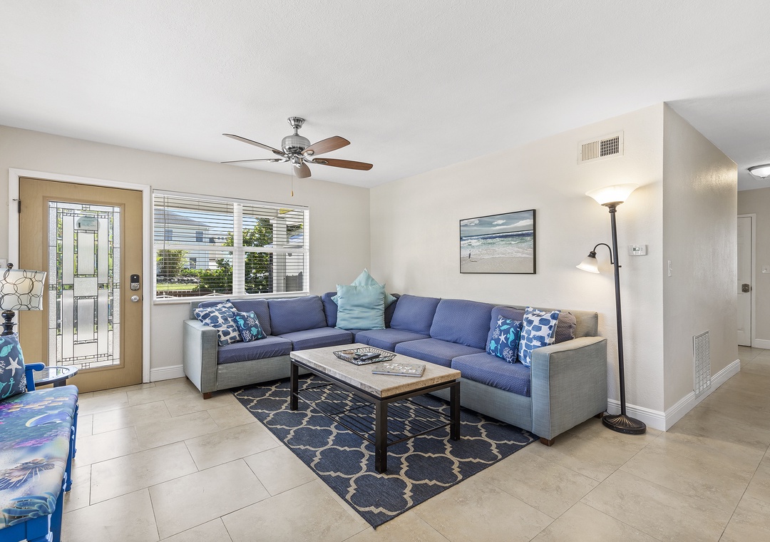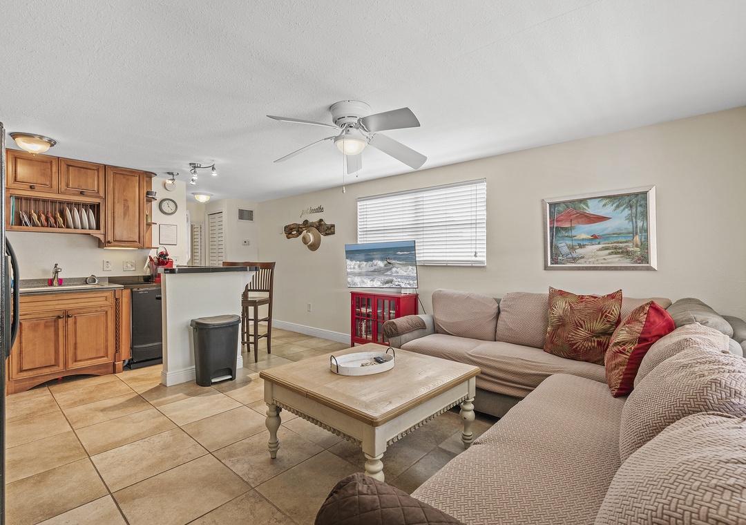 The rear unit in the triplex is Poolside Oasis, an adorable two-bedroom, one bath retreat that also comfortably sleeps six. Warm décor and large ceramic tile flooring can be found throughout. The open floor plan includes an updated kitchen and comfortable living space. The living room boosts a large sleeper sectional, colorful artwork and flat-screen TV, perfect for watching your favorite shows after a fun day at the beach or lounging poolside. The well-equipped kitchen has been beautifully updated with granite tile countertops, rich wood cabinetry and new appliances. There is a breakfast bar with high-top chairs to enjoy a delicious meal or quick bite.