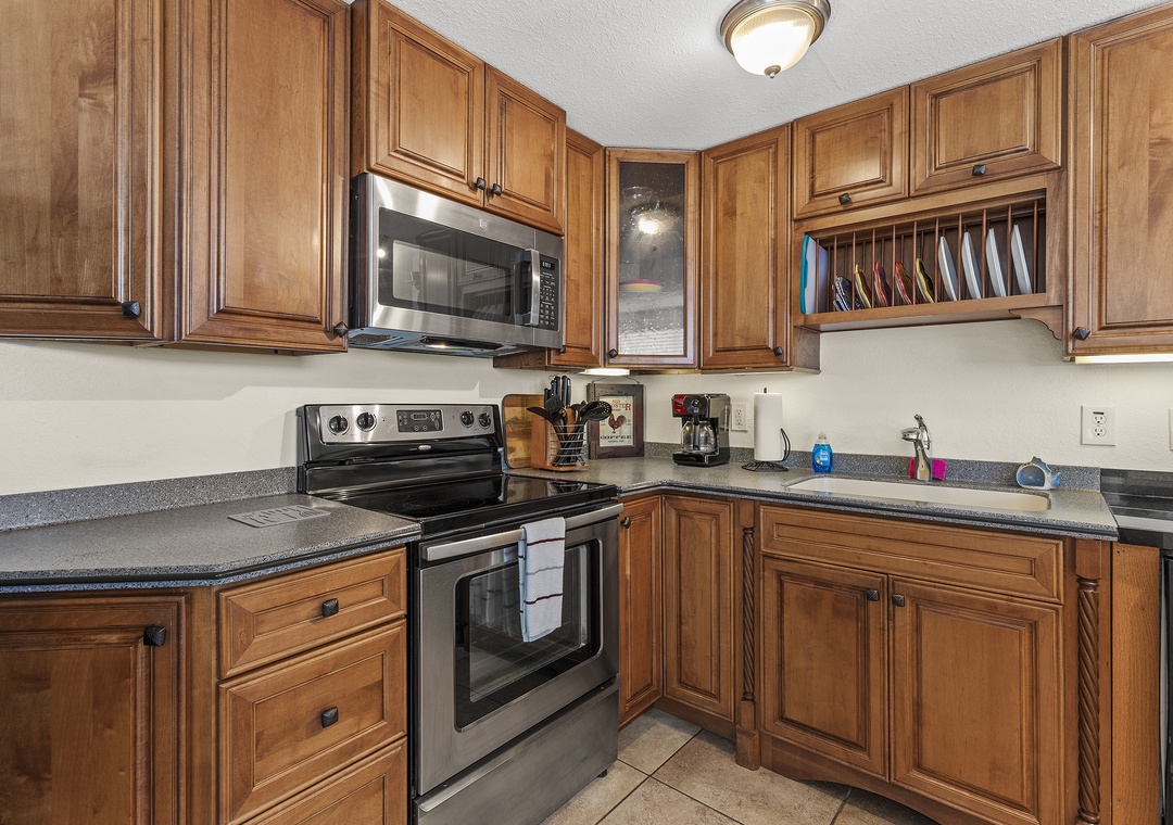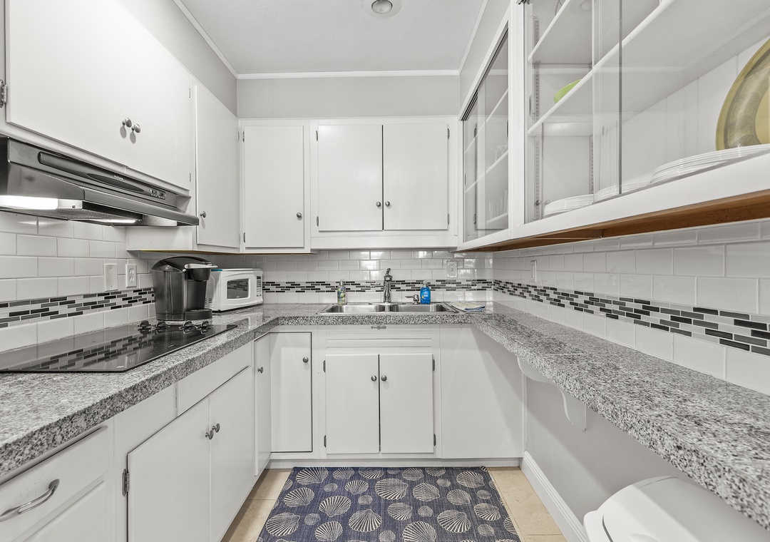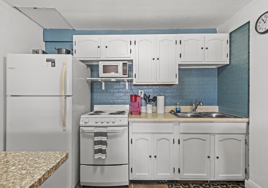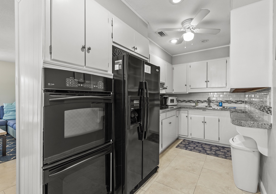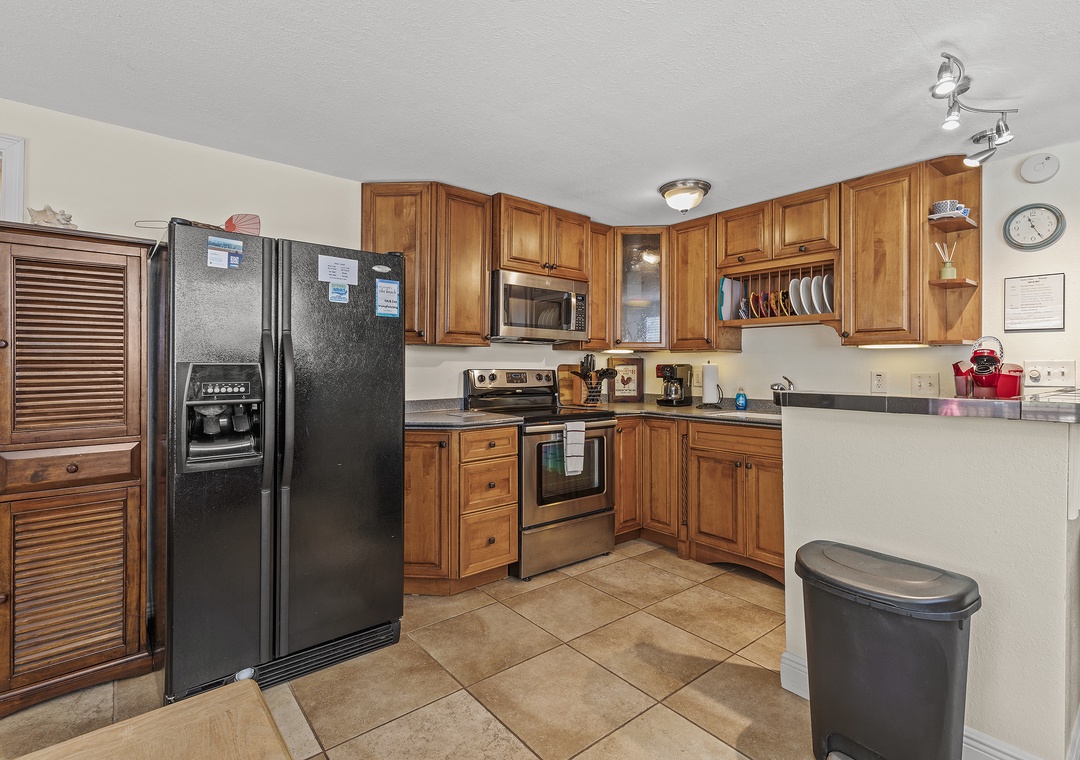 The rear unit in the triplex is Poolside Oasis, an adorable two-bedroom, one bath retreat that also comfortably sleeps six. Warm décor and large ceramic tile flooring can be found throughout. The open floor plan includes an updated kitchen and comfortable living space. The living room boosts a large sleeper sectional, colorful artwork and flat-screen TV, perfect for watching your favorite shows after a fun day at the beach or lounging poolside. The well-equipped kitchen has been beautifully updated with granite tile countertops, rich wood cabinetry and new appliances. There is a breakfast bar with high-top chairs to enjoy a delicious meal or quick bite.
