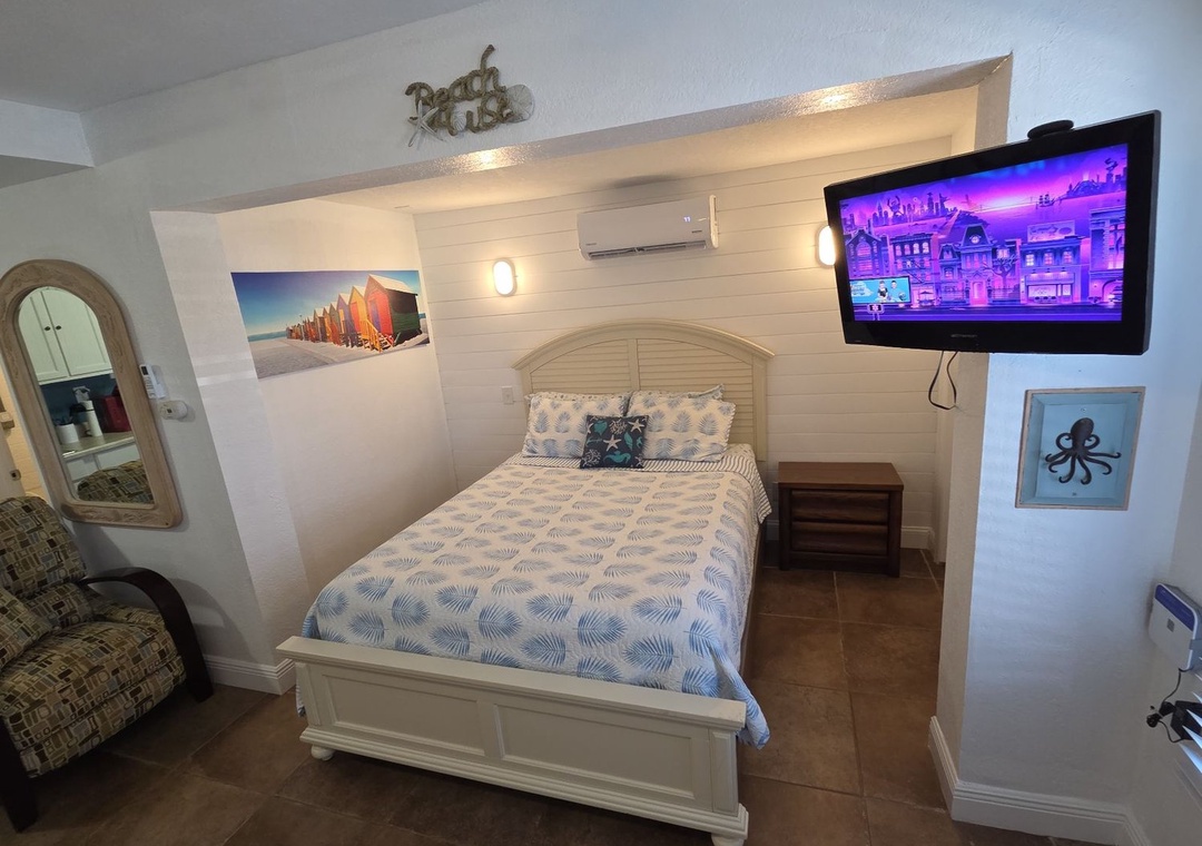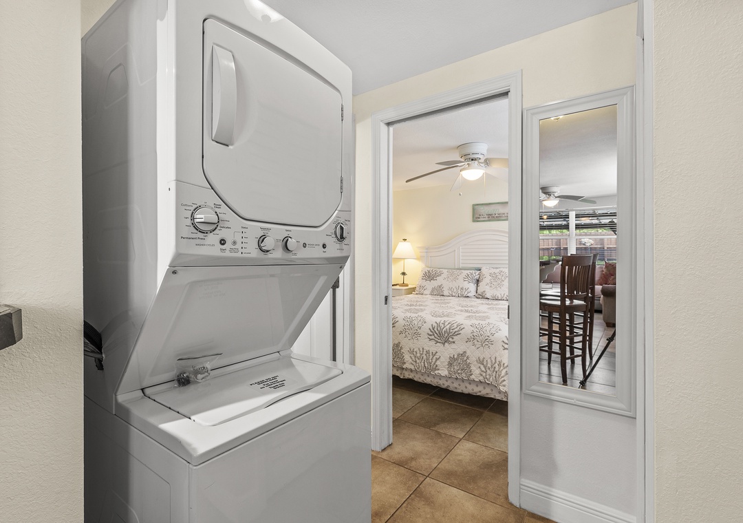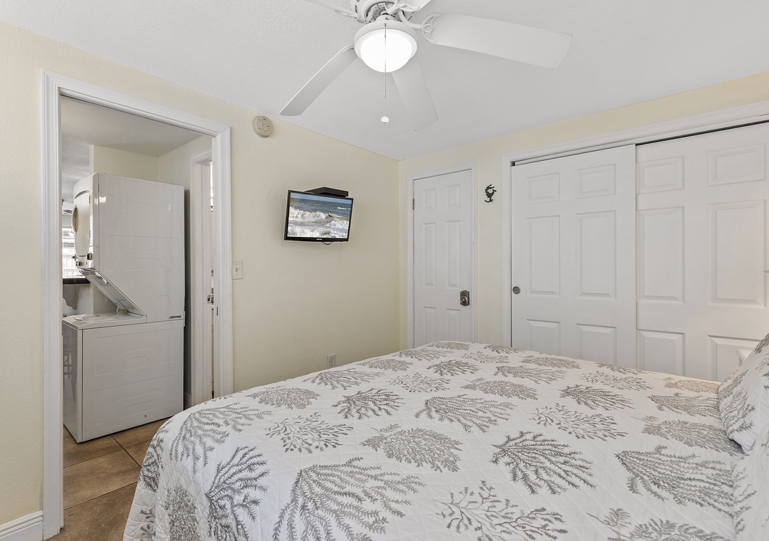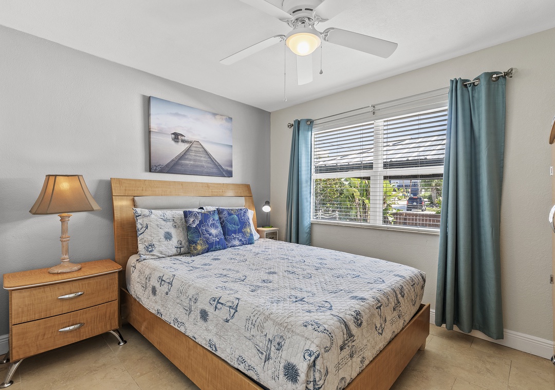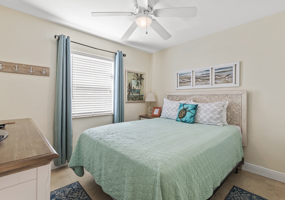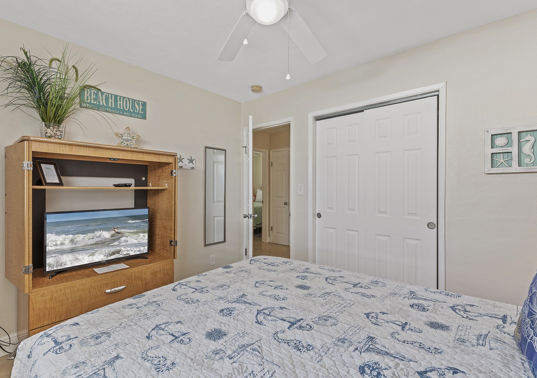 When it's time to retire, the primary bedroom hosts a comfy queen size bed, nicely appointed bedding, tall dresser and flat-screen TV. The second bedroom offers a twin-size trundle bed which comfortably sleeps two. The completely updated bathroom is conveniently located between both bedrooms and included a standard bathtub, shower, vanity, mirror and plenty of towels.