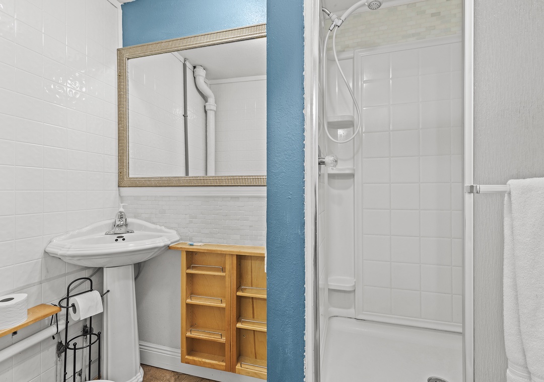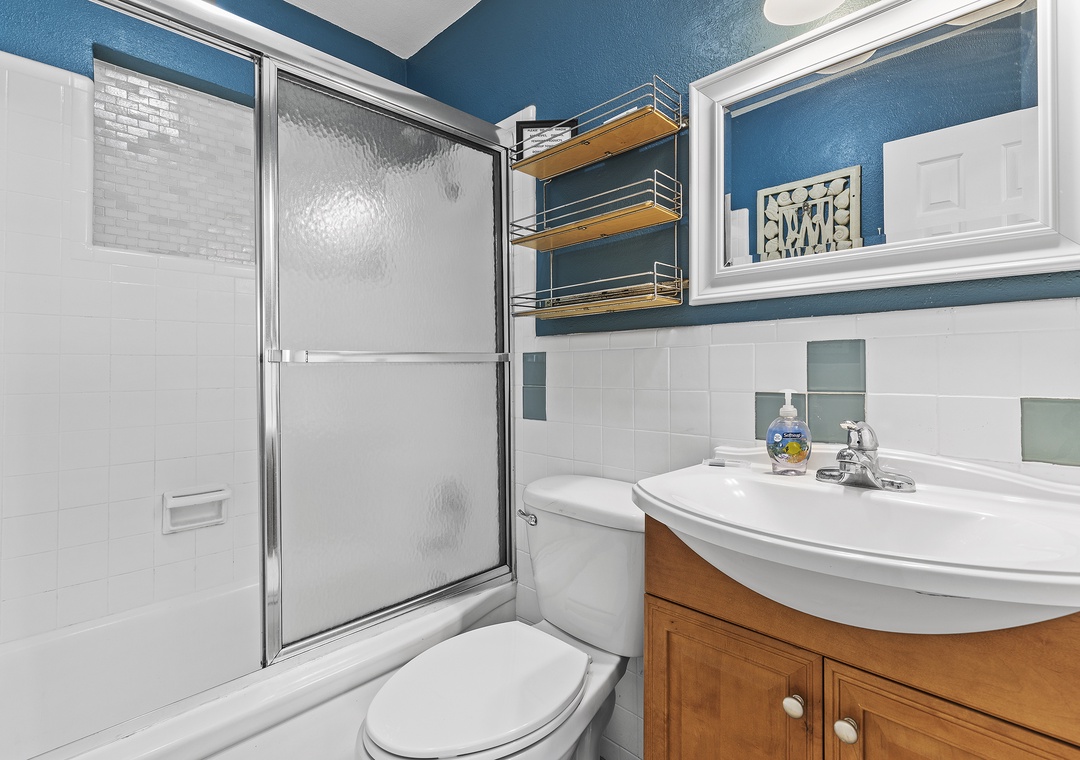 In each of the bedrooms you will find colorful and soft bedding, flat-screen TV's and ample dresser space. There is a queen size bed, full-size bed and two twins, making sleeping for six a breeze. All the bedrooms share a common bathroom which has been nicely updated. It includes a standard size bathtub, shower with glass enclosure, vanity and plenty of towels.