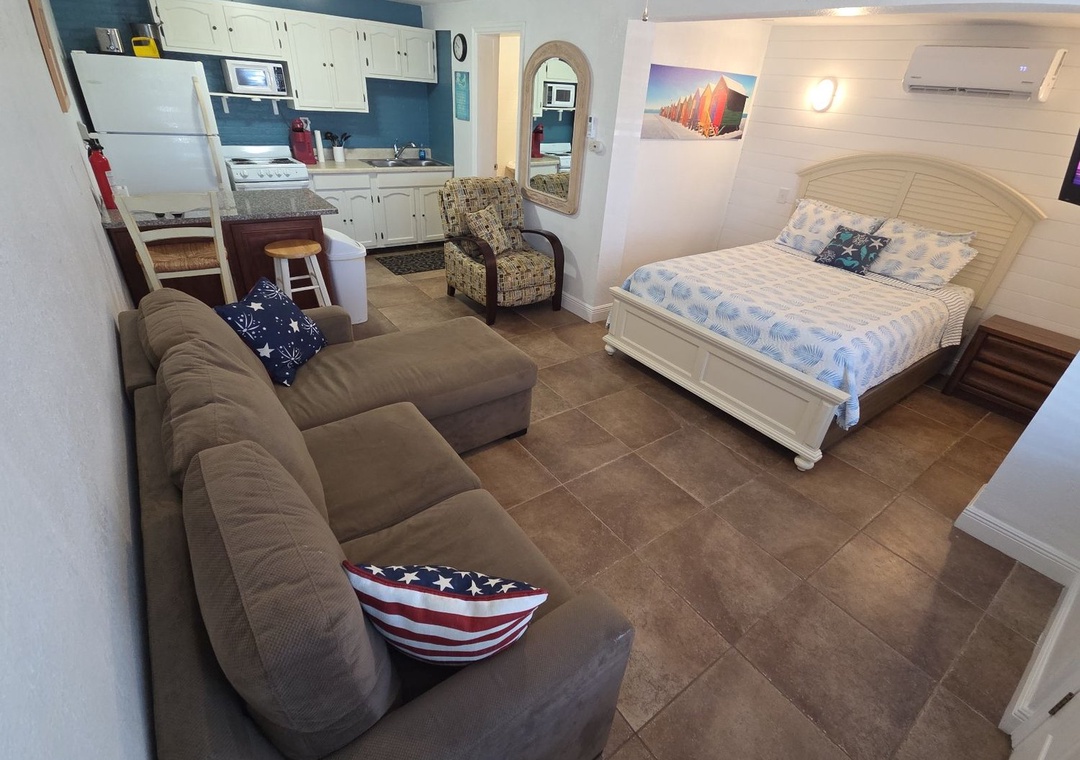 As part of the Grand Oasis there is also a separate studio apartment (between Beachside and Poolside Oasis) which includes a kitchenette with stove and fridge, breakfast bar and all the essentials needed to cook a great meal. The living space has a comfy couch with chaise, flat-screen TV and queen-size bed. The renovated bathroom has a walk-in shower with glass enclosure, pedestal sink, mirror and plush linens.