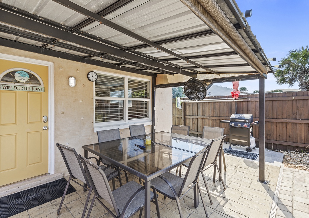 The entire triplex includes a private pool with large, covered patio, hot tub, fire pit, grill, screened side patio with outdoor furnishings; Free WIFI and cable TV; beach towels, beach cart, beach chairs and much more.