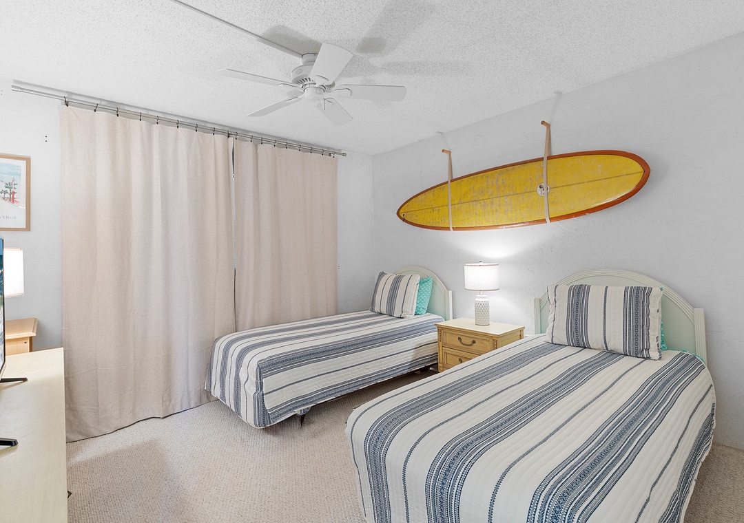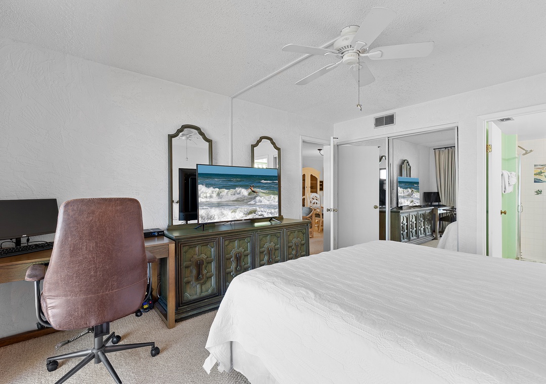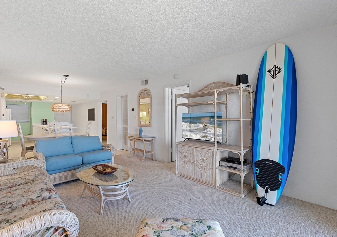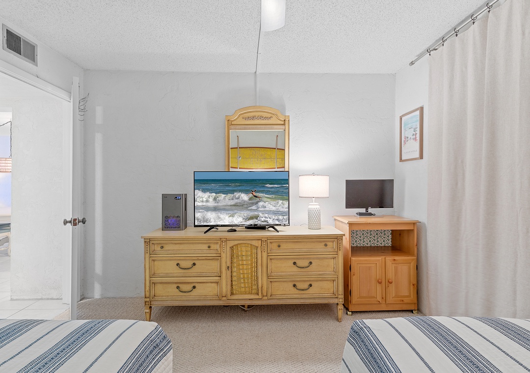 The primary bedroom features a King bed, balcony access, and a flat-screen TV. The guest bedroom offers two twin beds and its own TV—perfect for families or friends. The living room also has a TV and opens directly onto the balcony, making indoor-outdoor living a breeze.