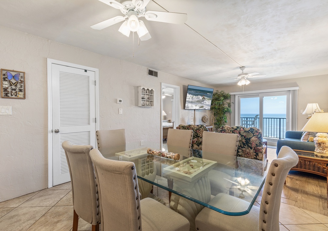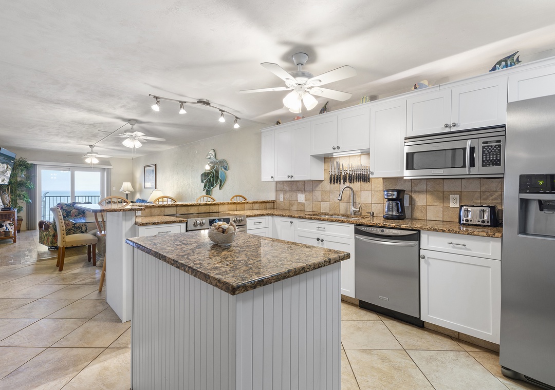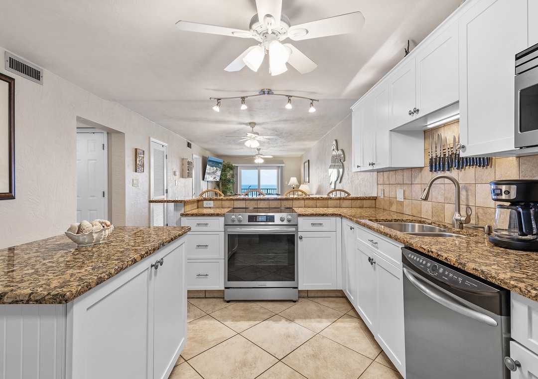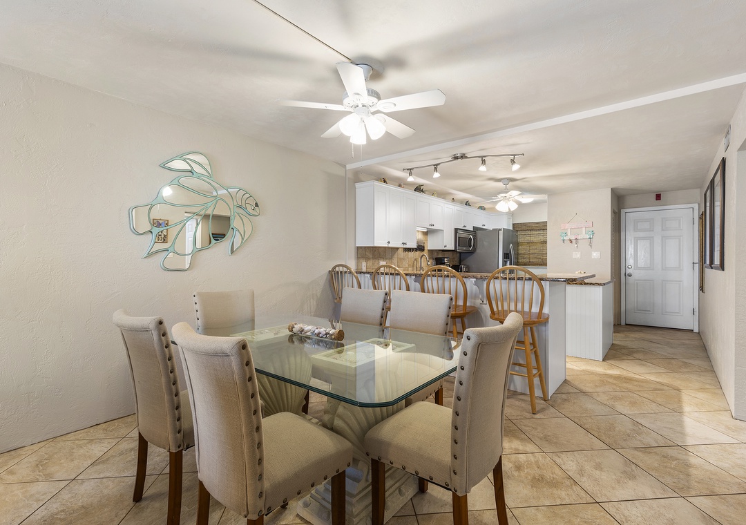 Inside, sandy-toned walls and tile floors lead to an updated, fully stocked kitchen with granite countertops, stainless steel appliances (including a new oven), white cabinetry, and seating for five at the breakfast bar. A glass-top dining table seats six just beyond.