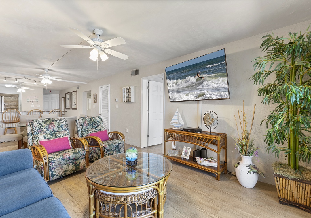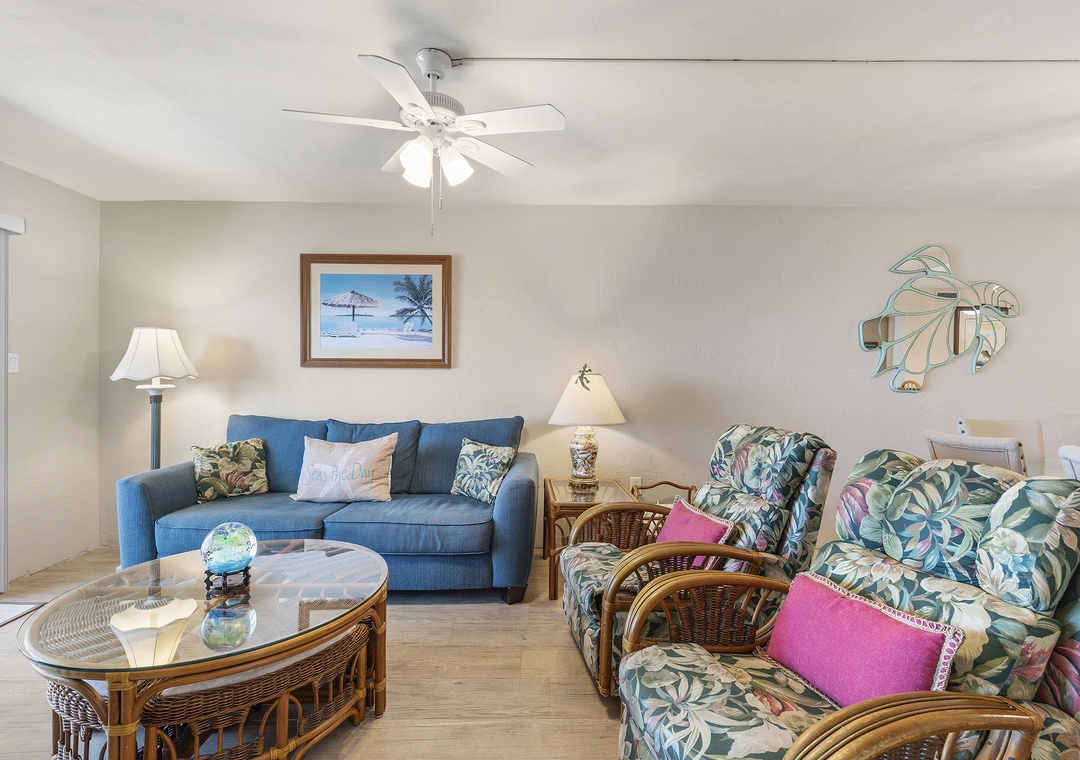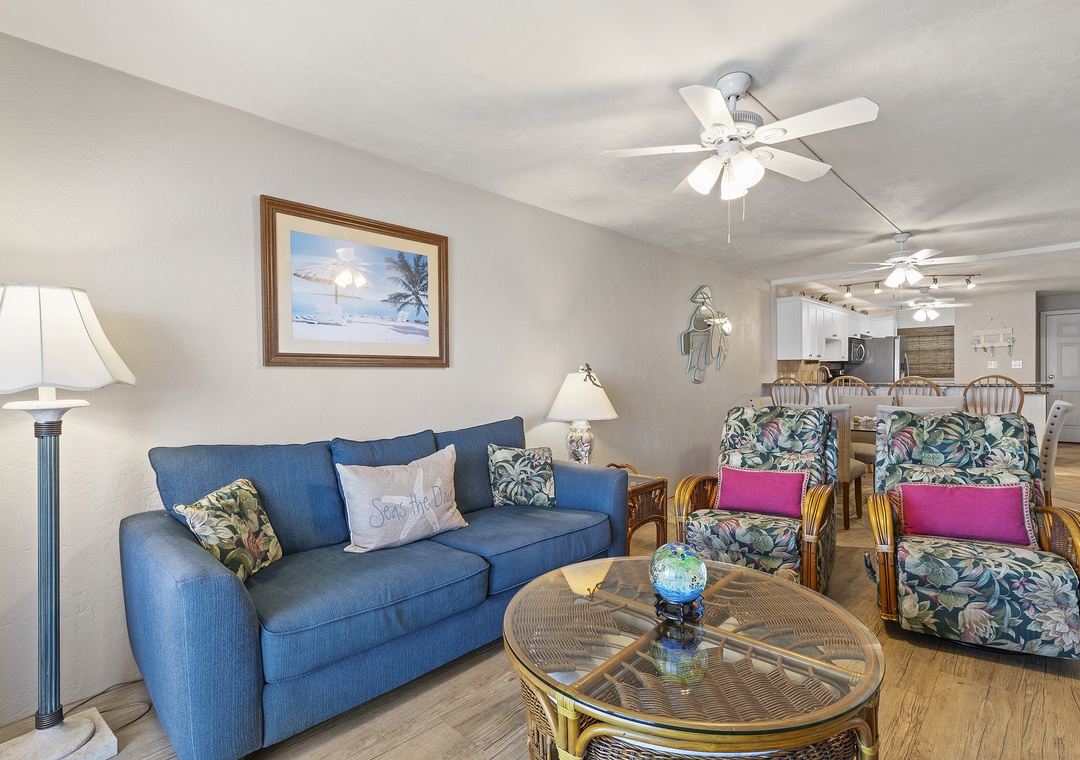 Hello Penny, Thank you so much for the review! We are so happy to hear you could enjoy the great location, beach access, and well cleaned unit! We are sorry that the living room could use updating, but all of our units at GreatOceanCondos.com are furnished and decorated to the owners personal taste. We try our best to show how the unit will look like on our website. Please come back again soon to utilize your return guest discount! -The Great Ocean TeamGreat Ocean Condos staff