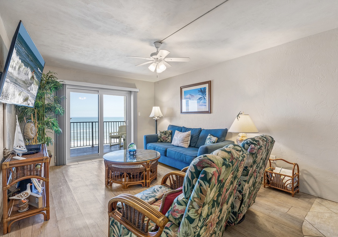 The living room offers a pull-out sofa, two armchairs, a coffee table with hidden stools, and a 65" Smart TV. New sliding glass doors open to the balcony and bring in natural light and ocean views.