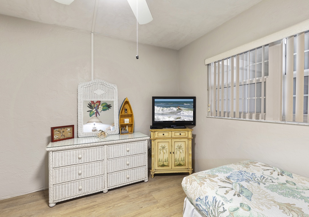 The primary bedroom features a king bed, flat-screen TV, ample storage, a private bath with walk-in shower, and new sliding glass doors with balcony access. The guest bedroom includes two twin beds and a flat-screen TV, with a second full bath offering a tub/shower combo.