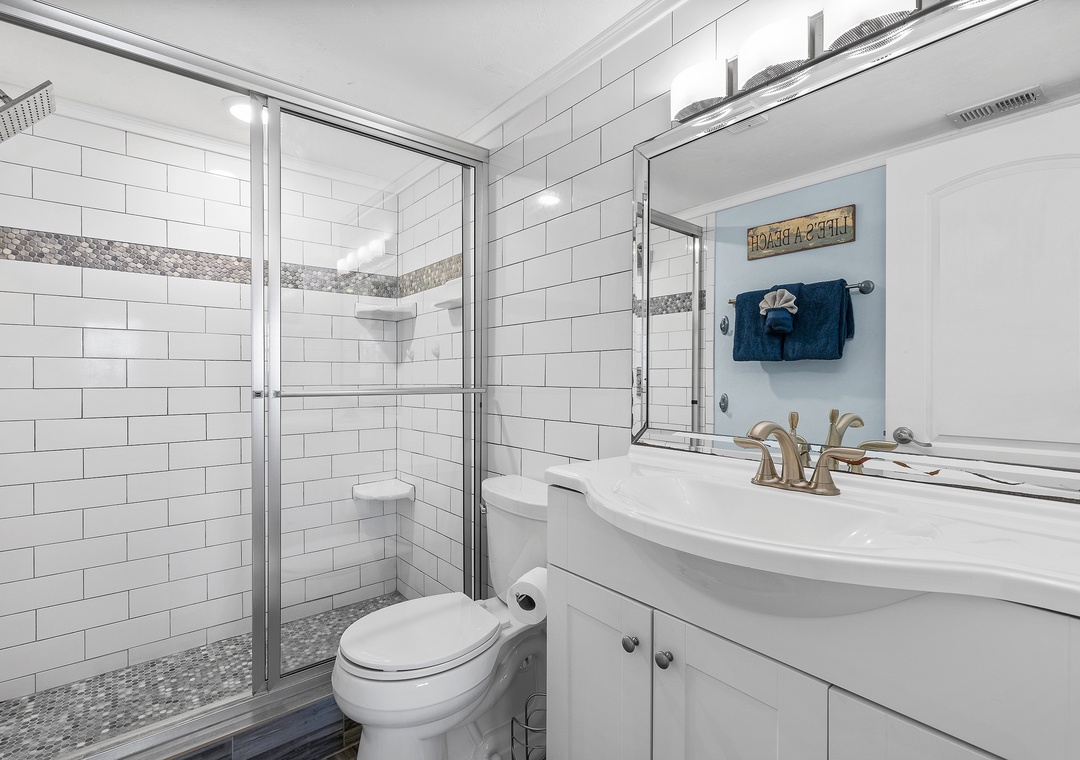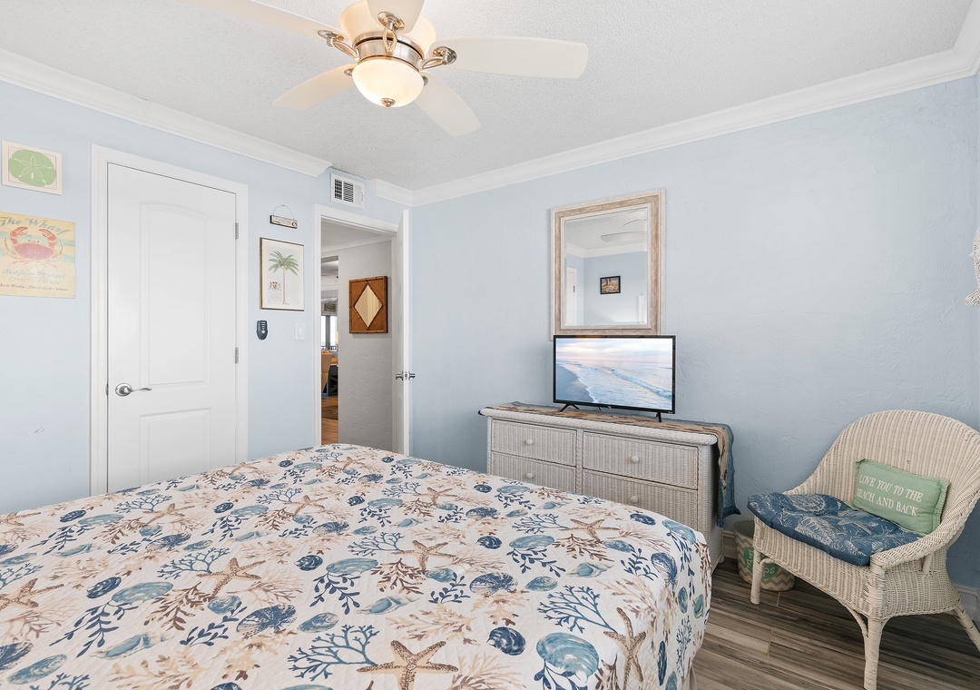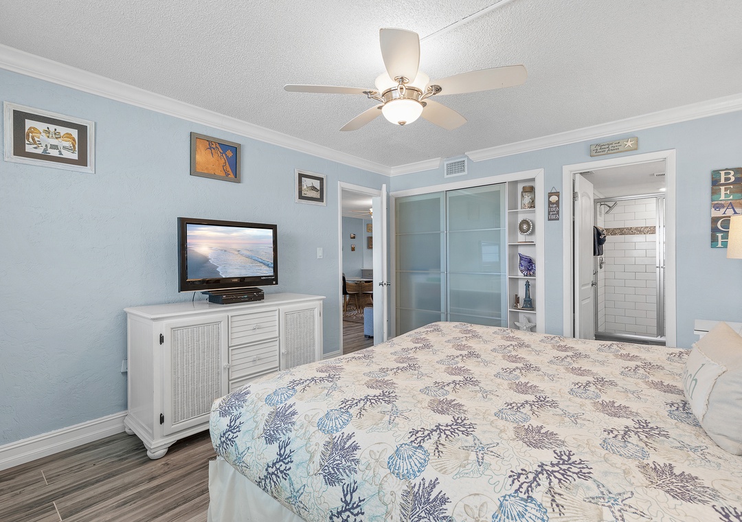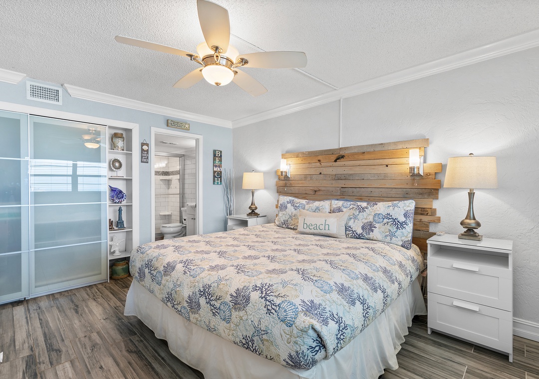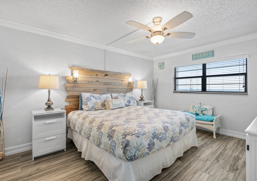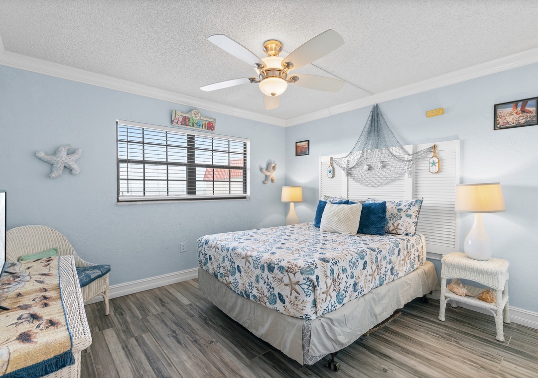 The beachy primary bedroom features a king bed, chic décor, and an adjoining bathroom with a walk-in shower. The guest bedroom offers a queen bed, perfect for friends. Enjoy ocean breezes and pool views from the private balcony.