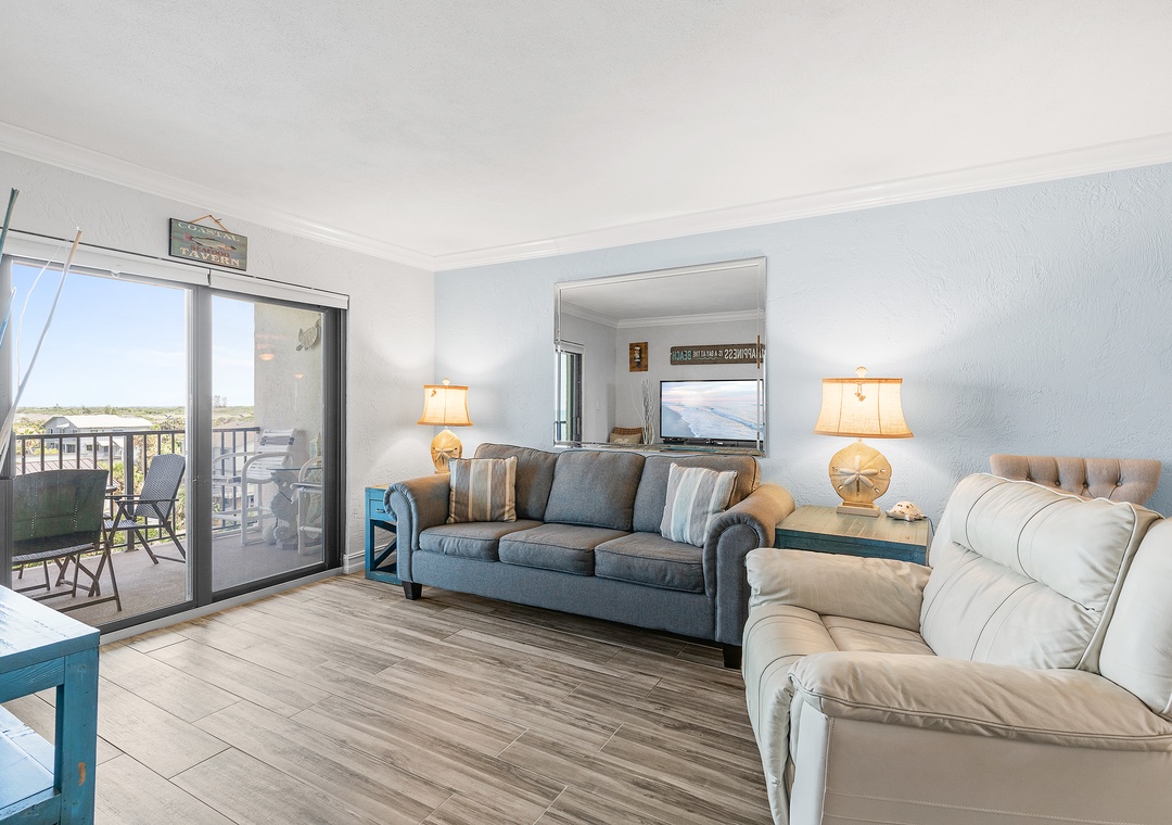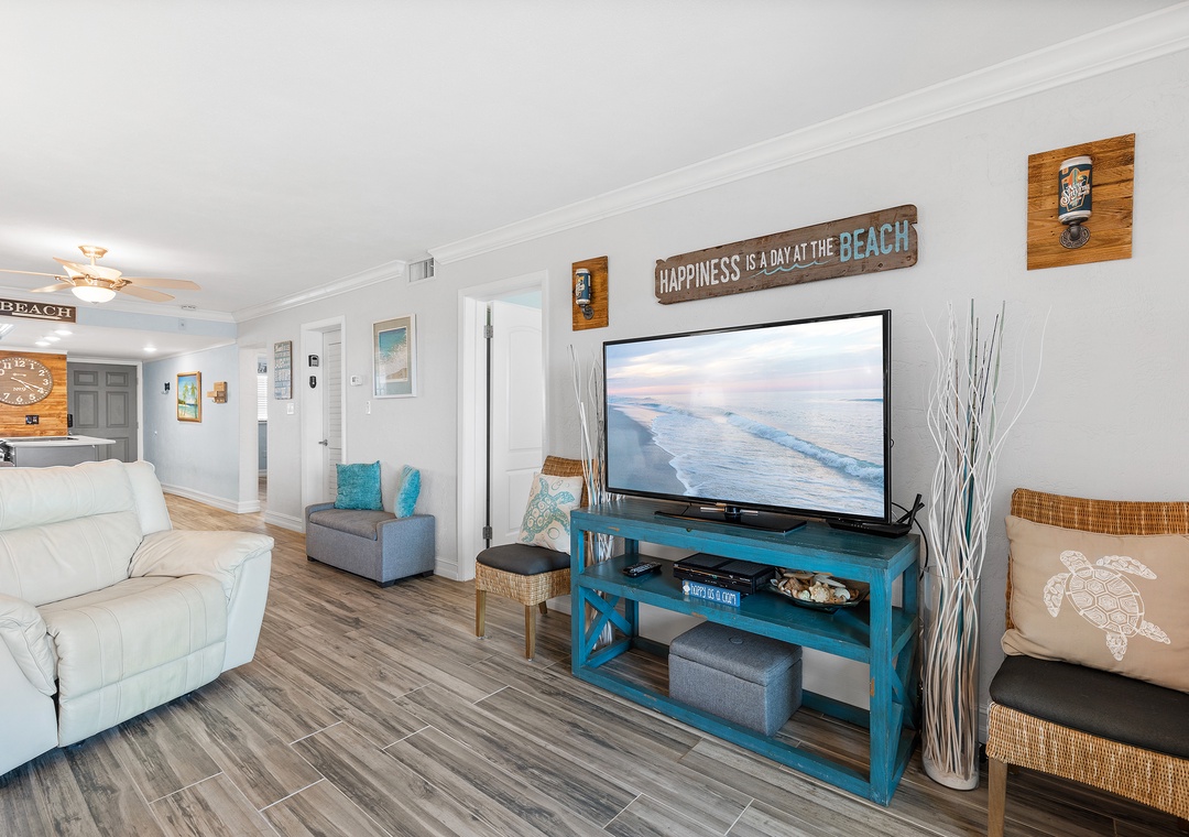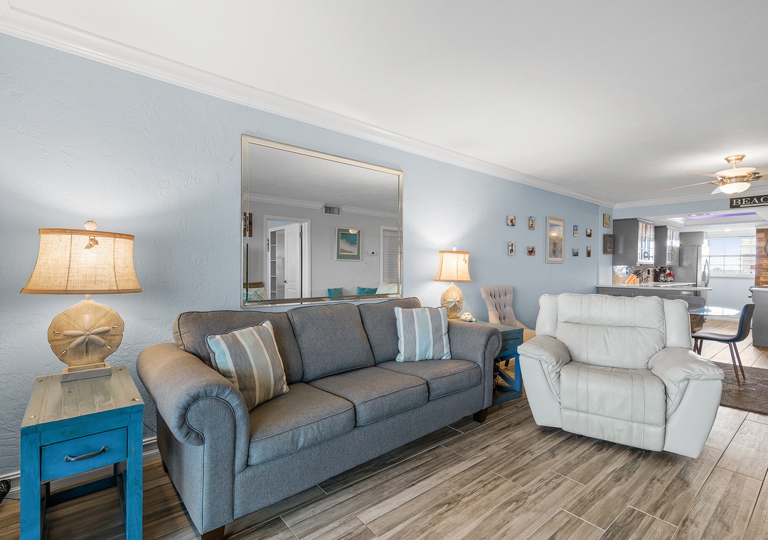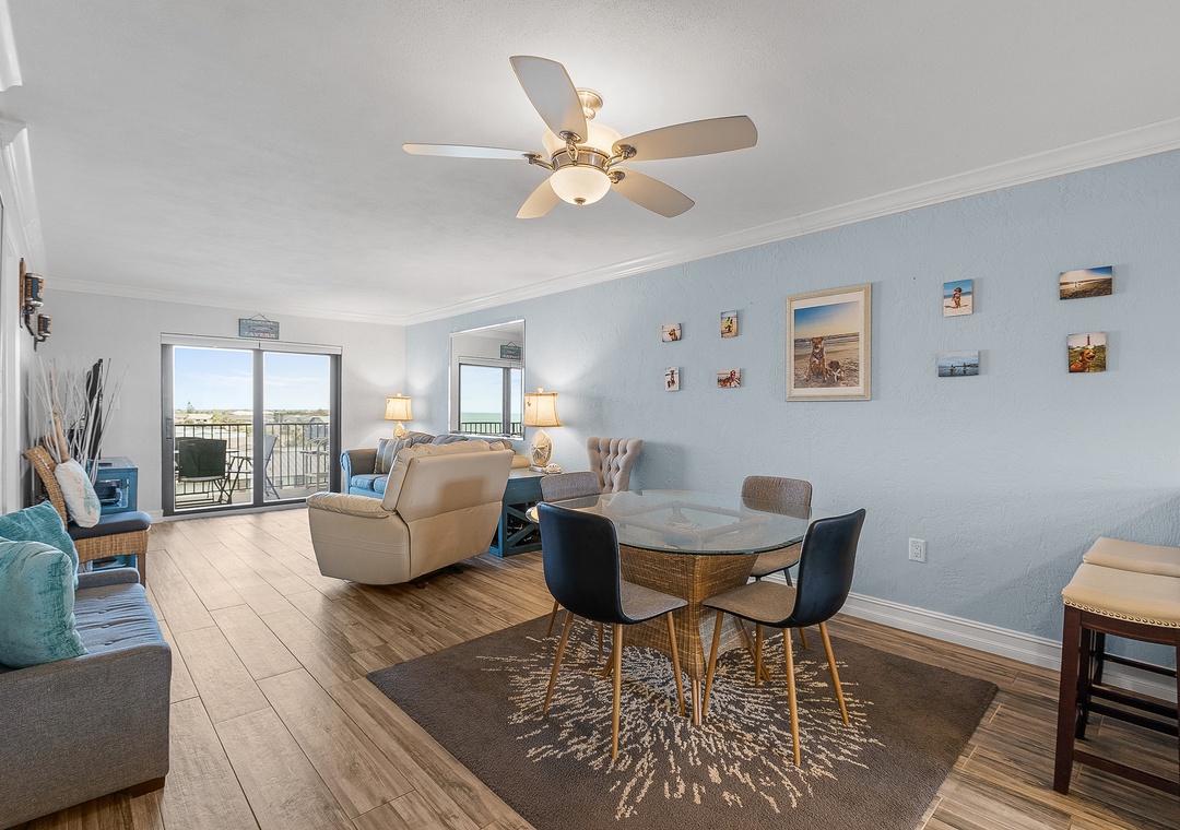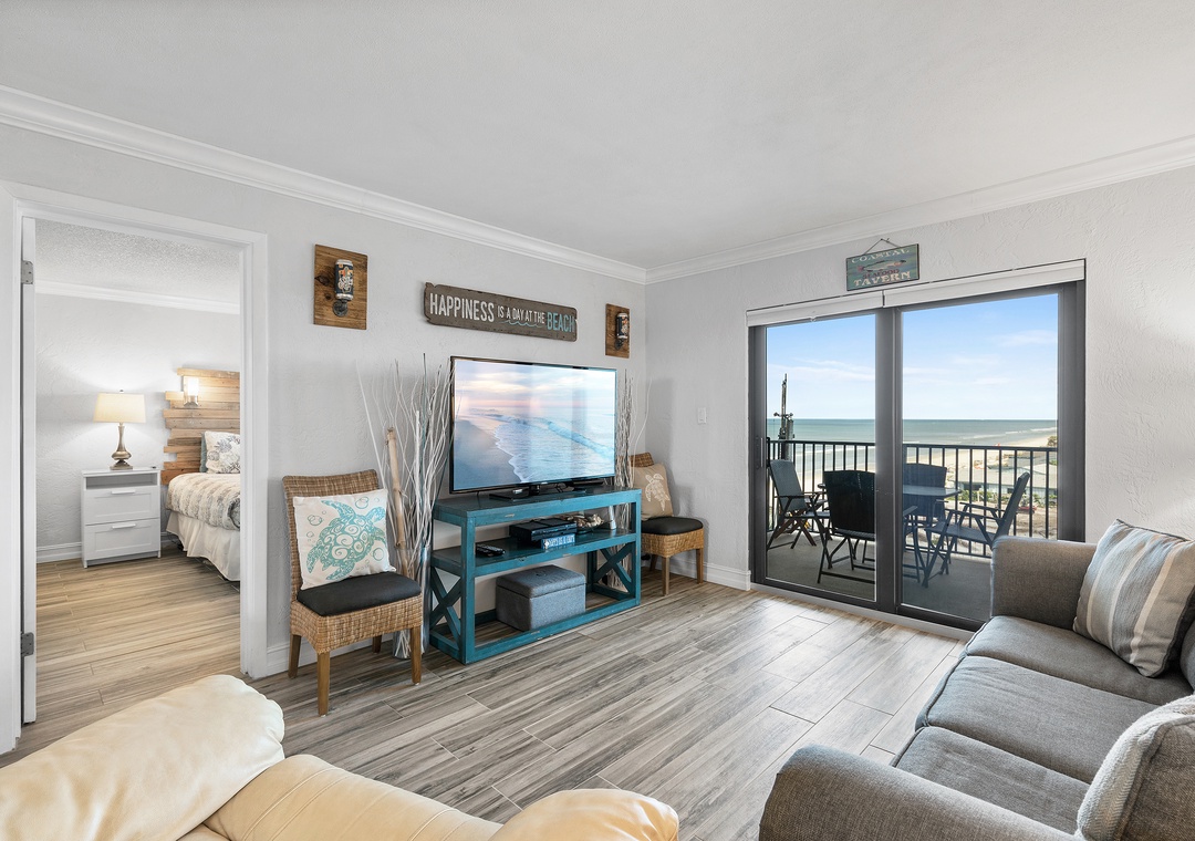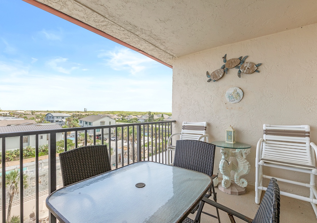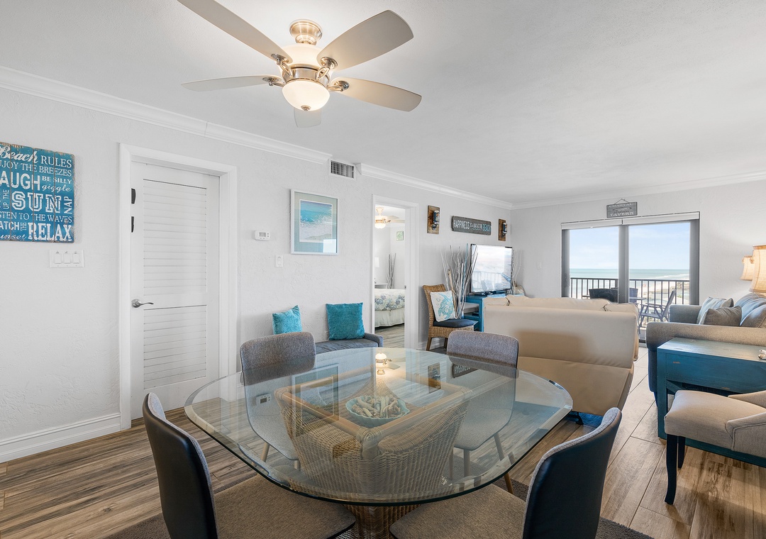 Wake up to stunning ocean views at Hacienda Del Sol II 509, a 2-bedroom, 2-bath condo in New Smyrna Beach. This beachy 5th-floor condo offers remarkable views of blue pools, manicured lawns, and crashing blue waters. With a fully equipped kitchen featuring stainless steel appliances and granite countertops, you can easily prepare meals before heading out to the sandy shores. The open living area invites hanging out and chilling for hours with its comfy furnishings, TV, dining table for eating and games, perfect for hosting friends or enjoying quiet evenings.