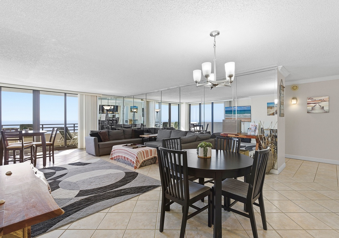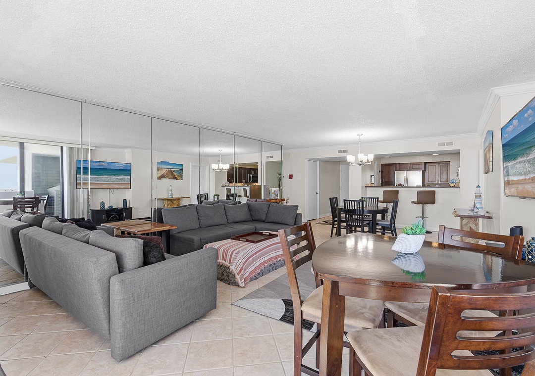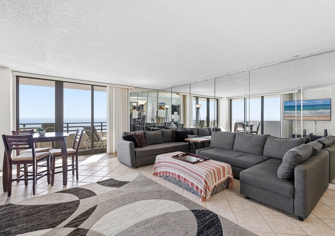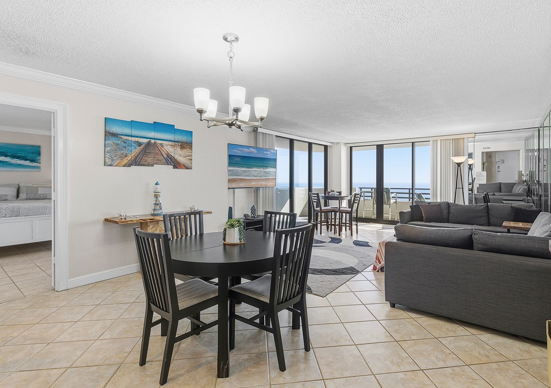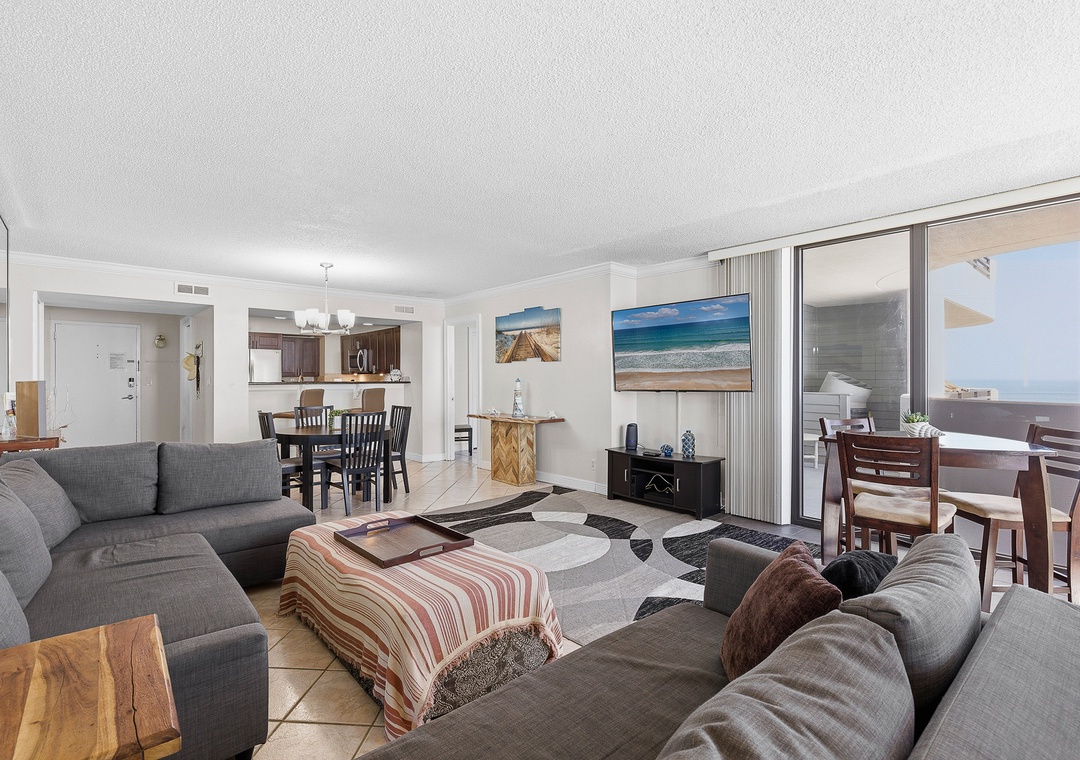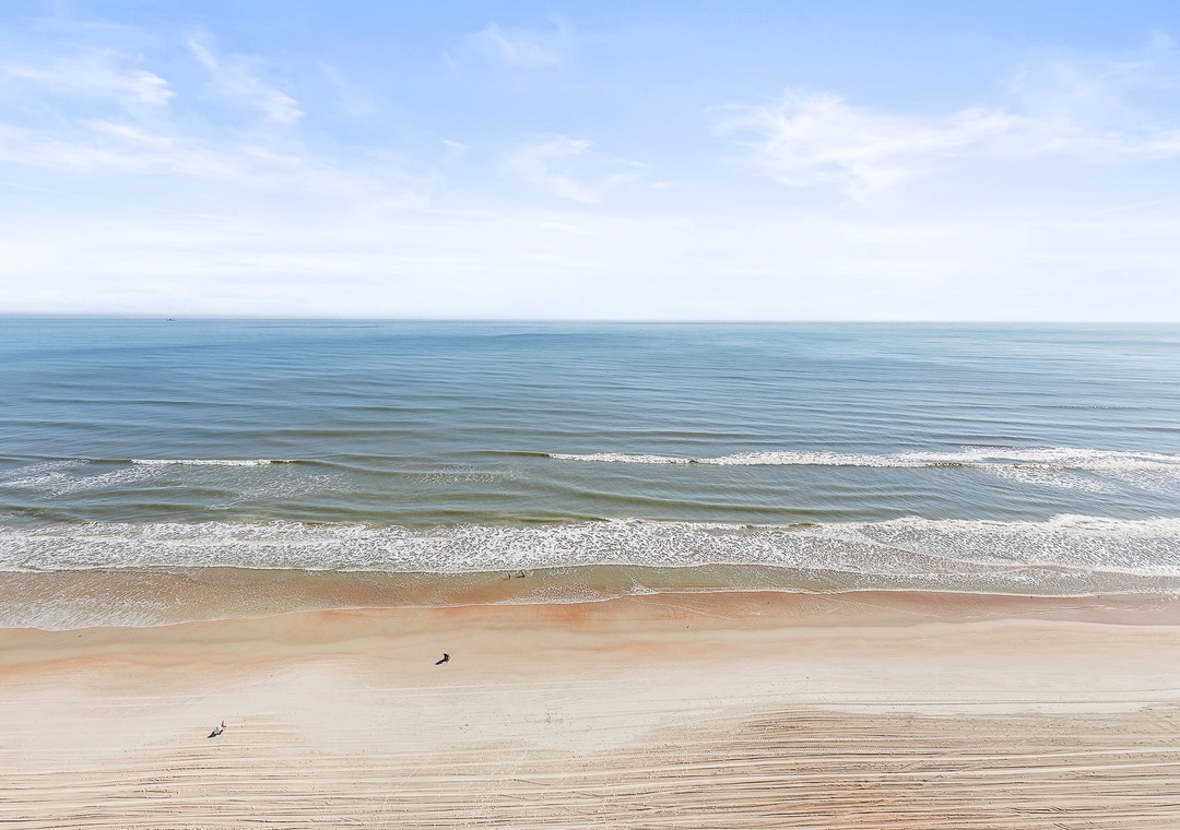 Welcome to your oceanfront getaway in Daytona Beach. Located on the 15th floor, this spacious 1,350 sq. ft. corner condo offers sweeping views of the Atlantic Ocean from nearly every room. The split-bedroom layout provides privacy and comfortably sleeps up to six guests. Both bedrooms and the living room open to a large wraparound balcony, creating the perfect place to enjoy fresh ocean breezes, morning coffee, or peaceful evenings listening to the waves. The primary suite features a king bed, private ensuite bath, and balcony access, while the guest bedroom includes a queen bed and its own access to the balcony.