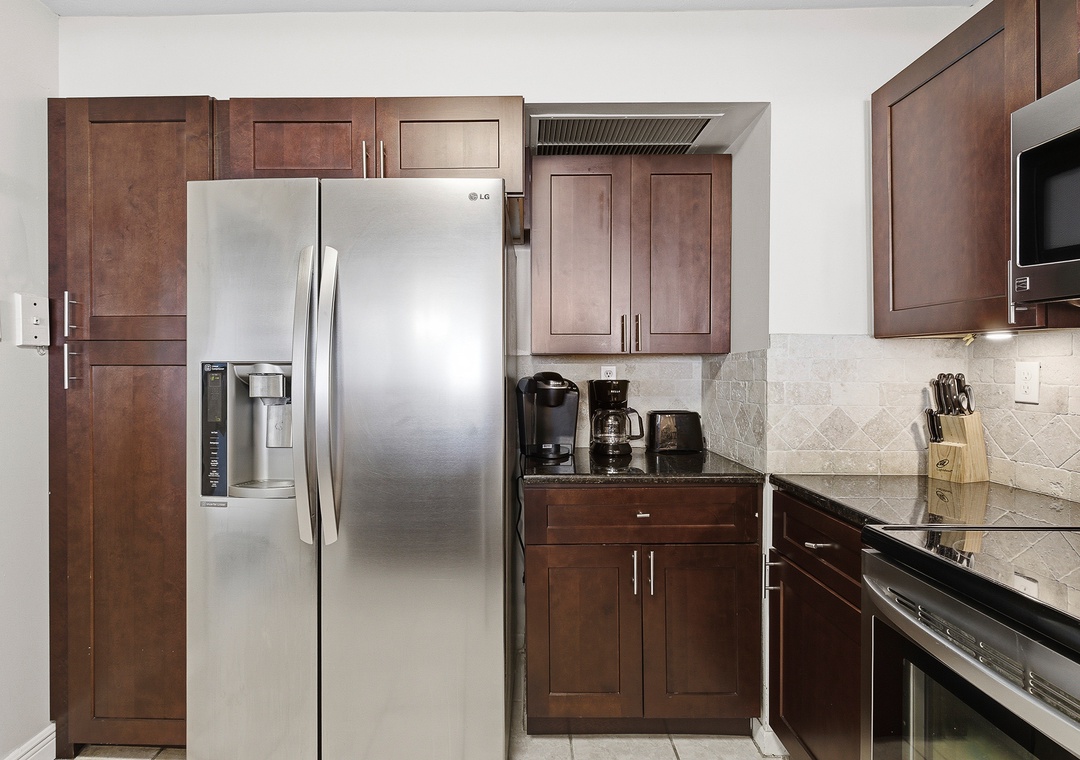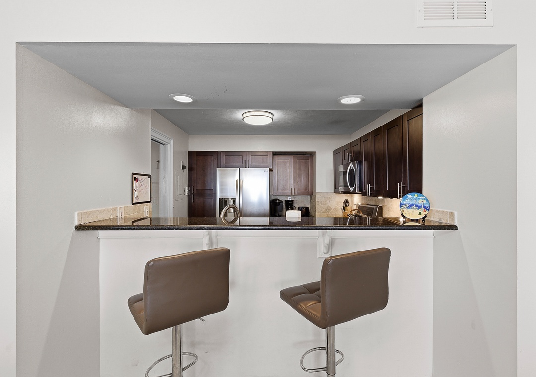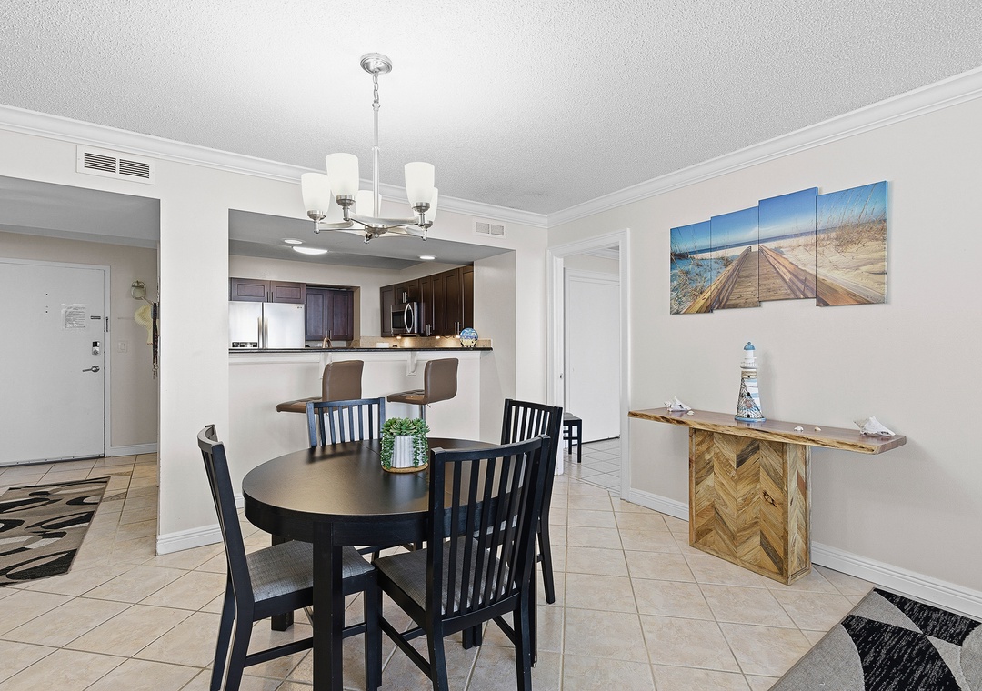 The bright living room offers comfortable seating and a sofa that converts into two twin sleepers, with large sliding doors framing the ocean views. The fully equipped kitchen includes stainless steel appliances, a dining table for four, bar seating for two, and an additional bar-height table near the balcony for meals with a view. A second full bathroom, in-unit conveniences, and one assigned underground parking space add to the comfort of your stay, making this beachfront condo a relaxing place to unwind and enjoy the beauty of Daytona Beach.