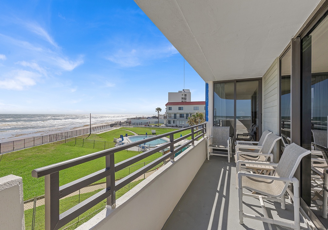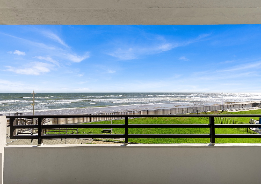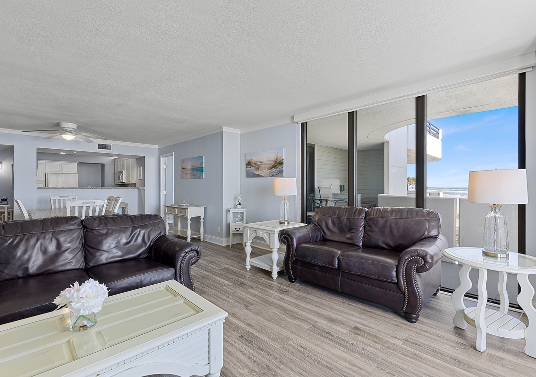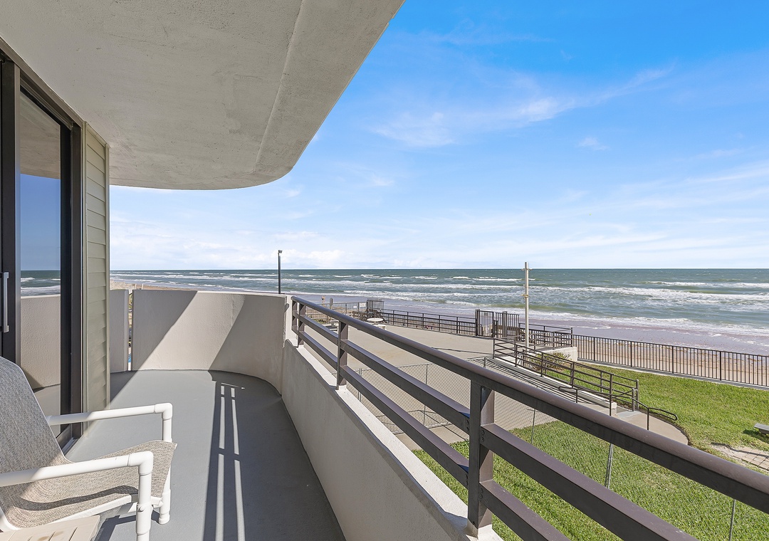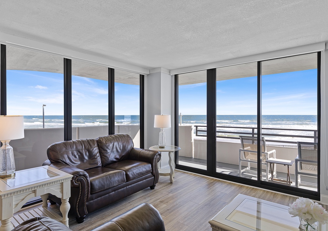 Inside, the crisp all-white kitchen is fully equipped and opens to a dining area for six, plus bar seating for two. The living room offers cozy leather sofas and corner ocean views—perfect for relaxing after a day in the sun. Step onto the expansive wraparound balcony connecting both bedrooms and the living area, where solid half-walls provide privacy while still letting in salty breezes and endless views. With serene coastal décor and every comfort considered, this oceanfront retreat is the perfect spot to unwind, recharge, and fall asleep to the sound of the waves.
