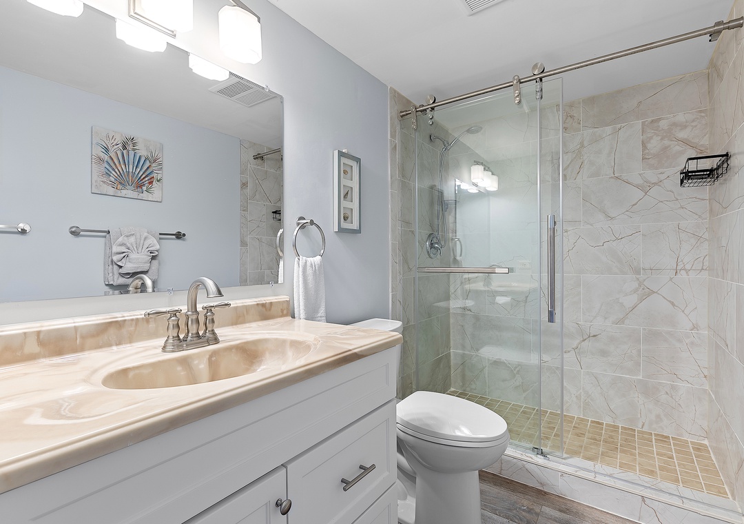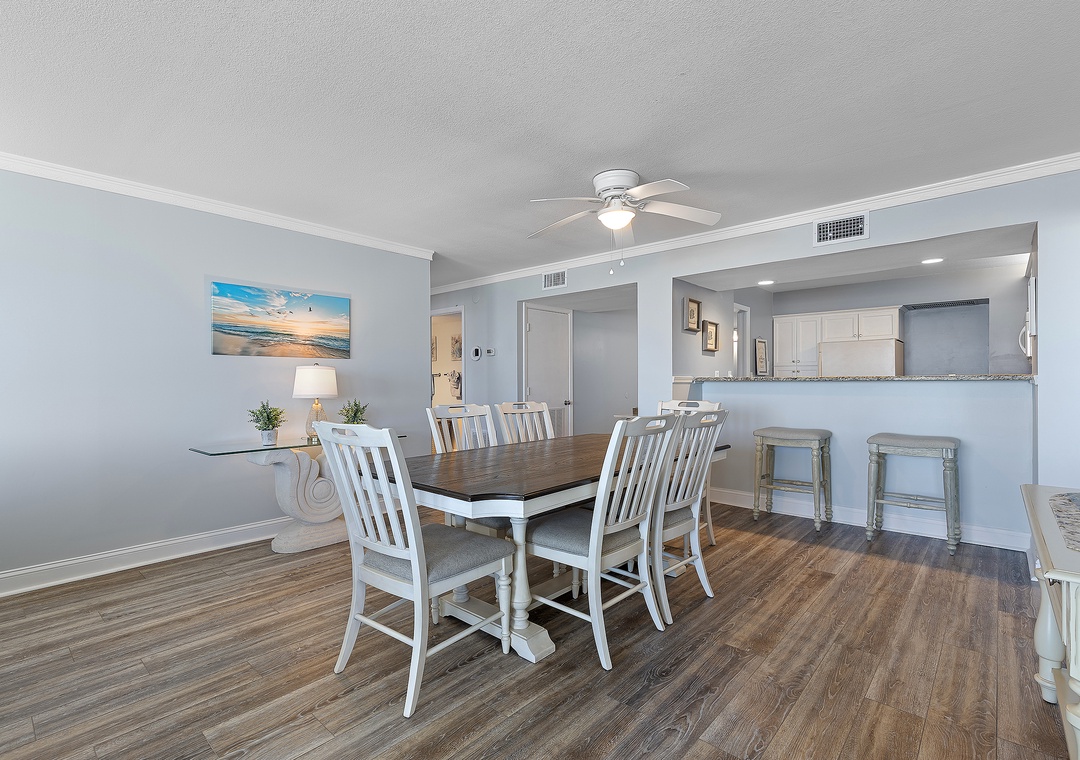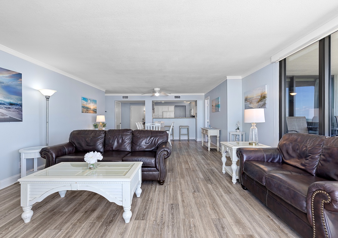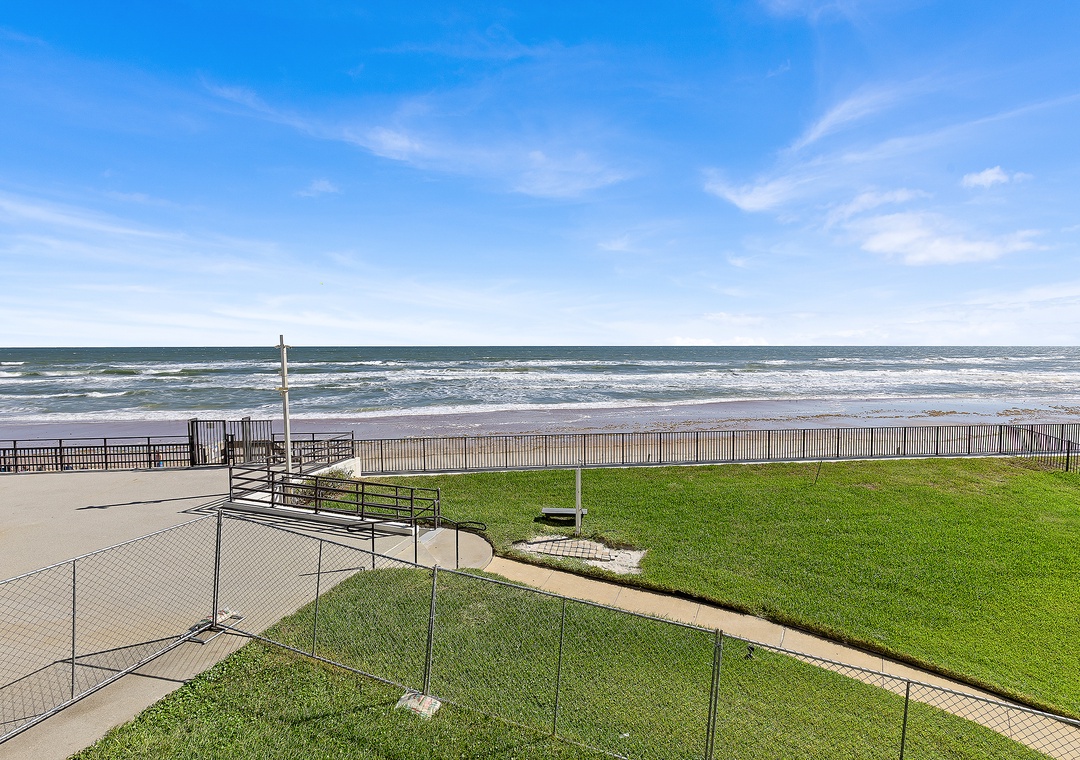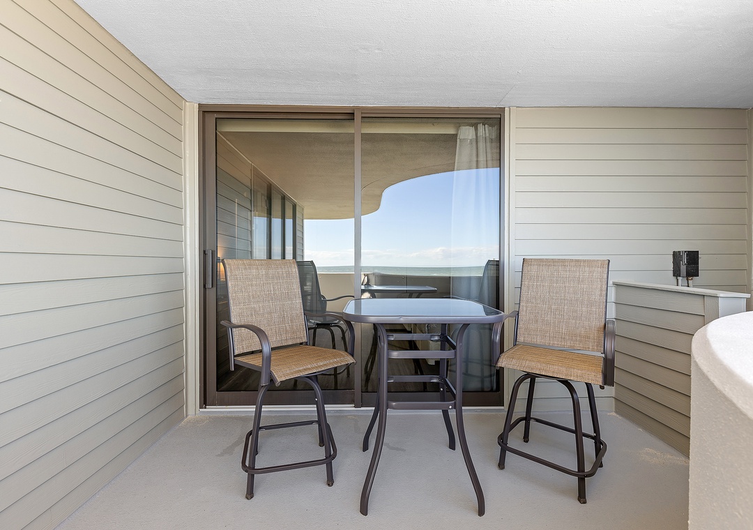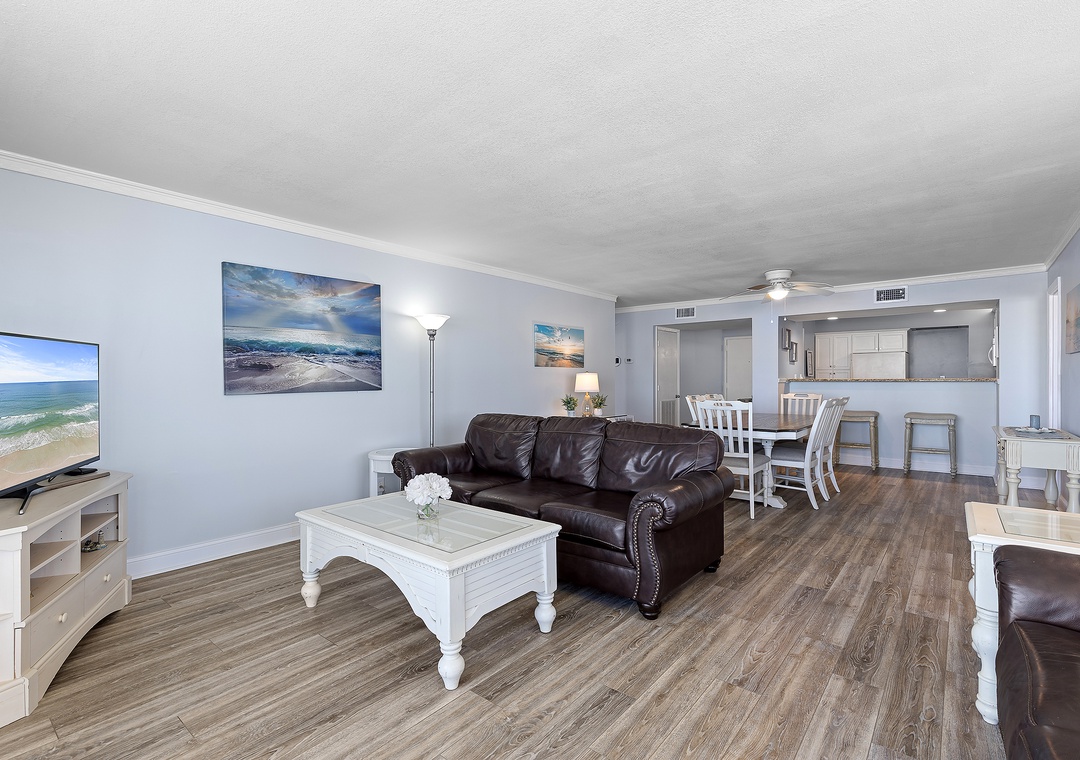 Inside, the crisp all-white kitchen is fully equipped and opens to a dining area for six, plus bar seating for two. The living room offers cozy leather sofas and corner ocean views—perfect for relaxing after a day in the sun. Step onto the expansive wraparound balcony connecting both bedrooms and the living area, where solid half-walls provide privacy while still letting in salty breezes and endless views. With serene coastal décor and every comfort considered, this oceanfront retreat is the perfect spot to unwind, recharge, and fall asleep to the sound of the waves.