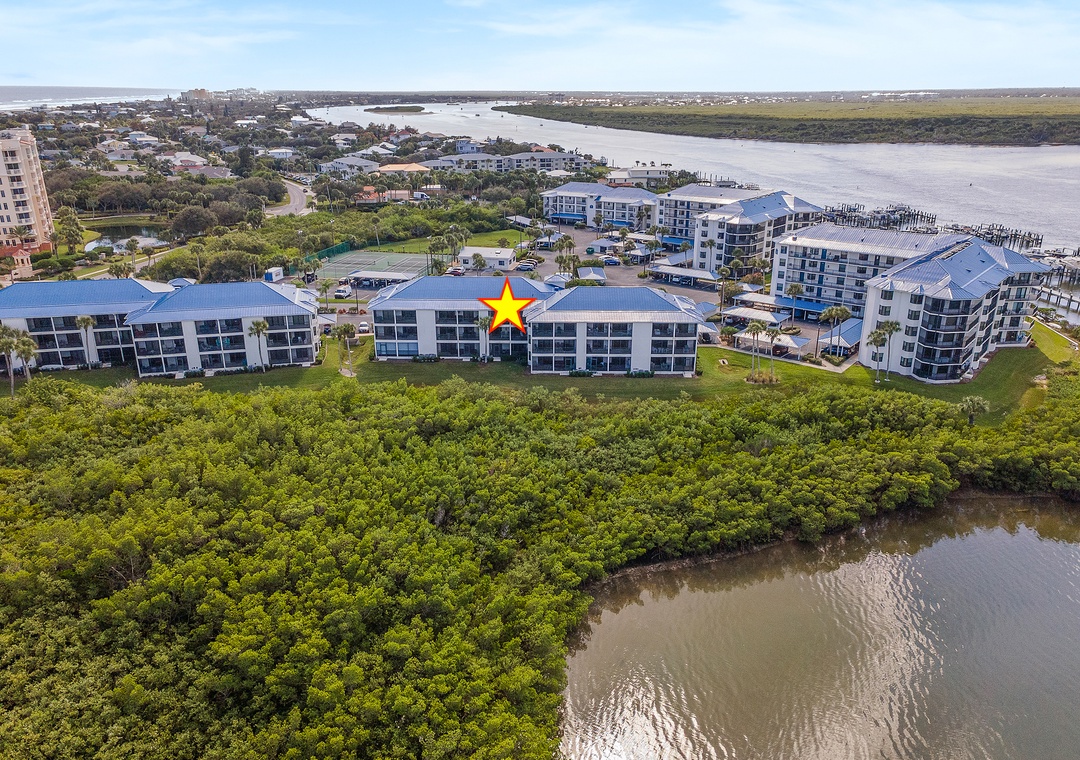 Experience coastal living at its finest in this beautifully appointed 2-bedroom, 2-bath condo located within the pristine, gated waterfront community of Inlet Marina Villas on the quiet, unspoiled northern point of New Smyrna Beach. This serene retreat features a spacious primary suite with a king bed, ensuite bath, and private balcony access, perfect for enjoying your morning coffee or evening sunsets. The guest bedroom includes a comfortable double bed and a private ensuite with hall access for added convenience. The open living area boasts a comfy sectional sofa, creating a relaxed, inviting atmosphere that truly feels like your own little world. Step out onto the balcony from the living room to take in the peaceful surroundings and refreshing coastal breeze. Additional features include an in-unit washer and dryer for ultimate convenience