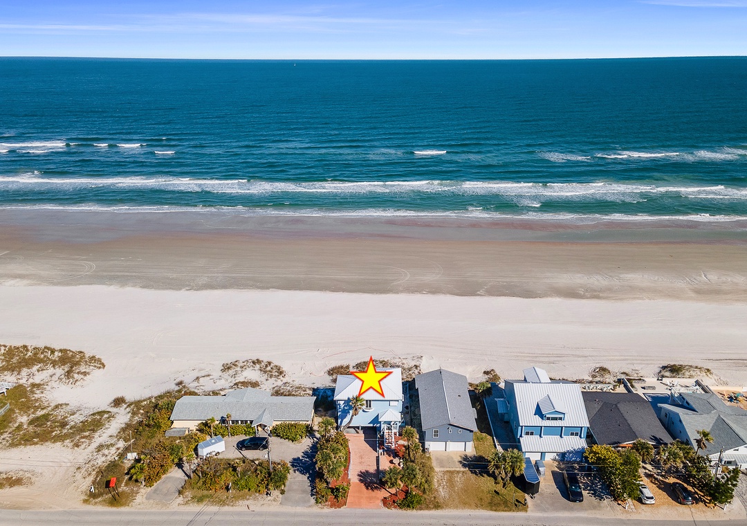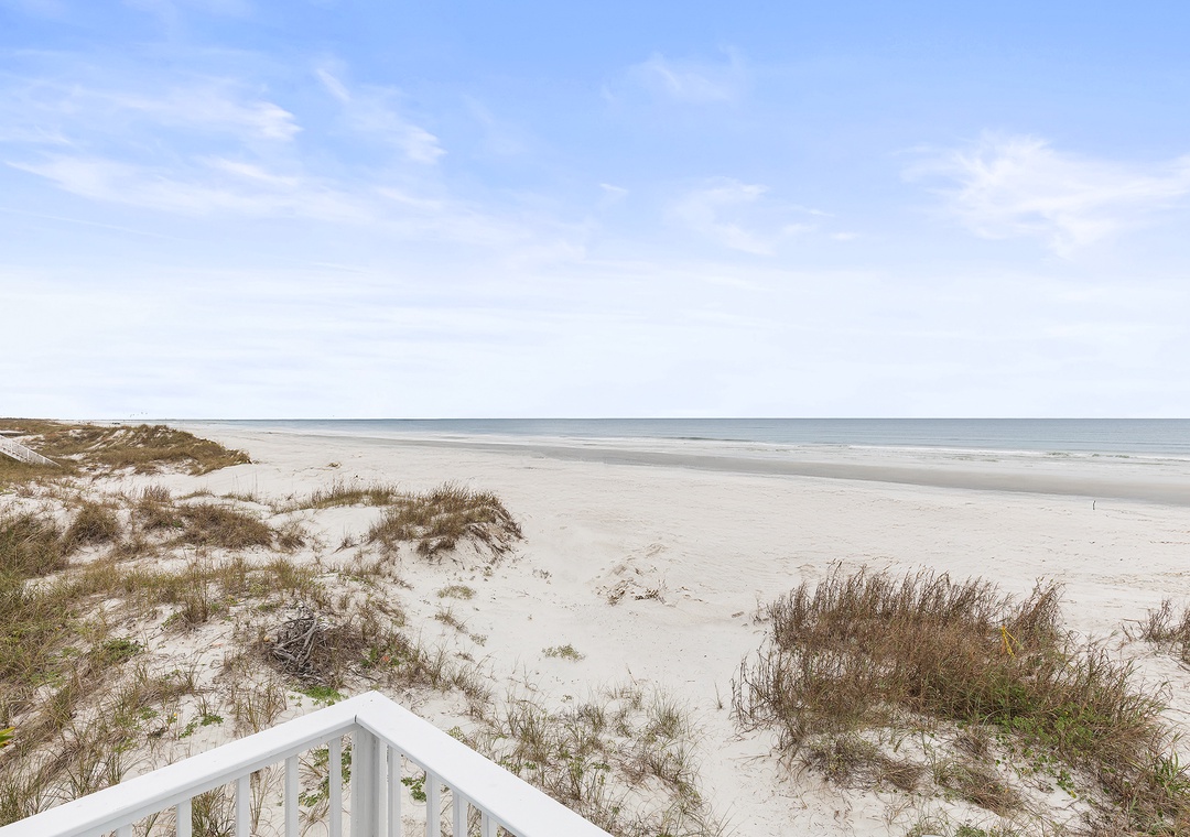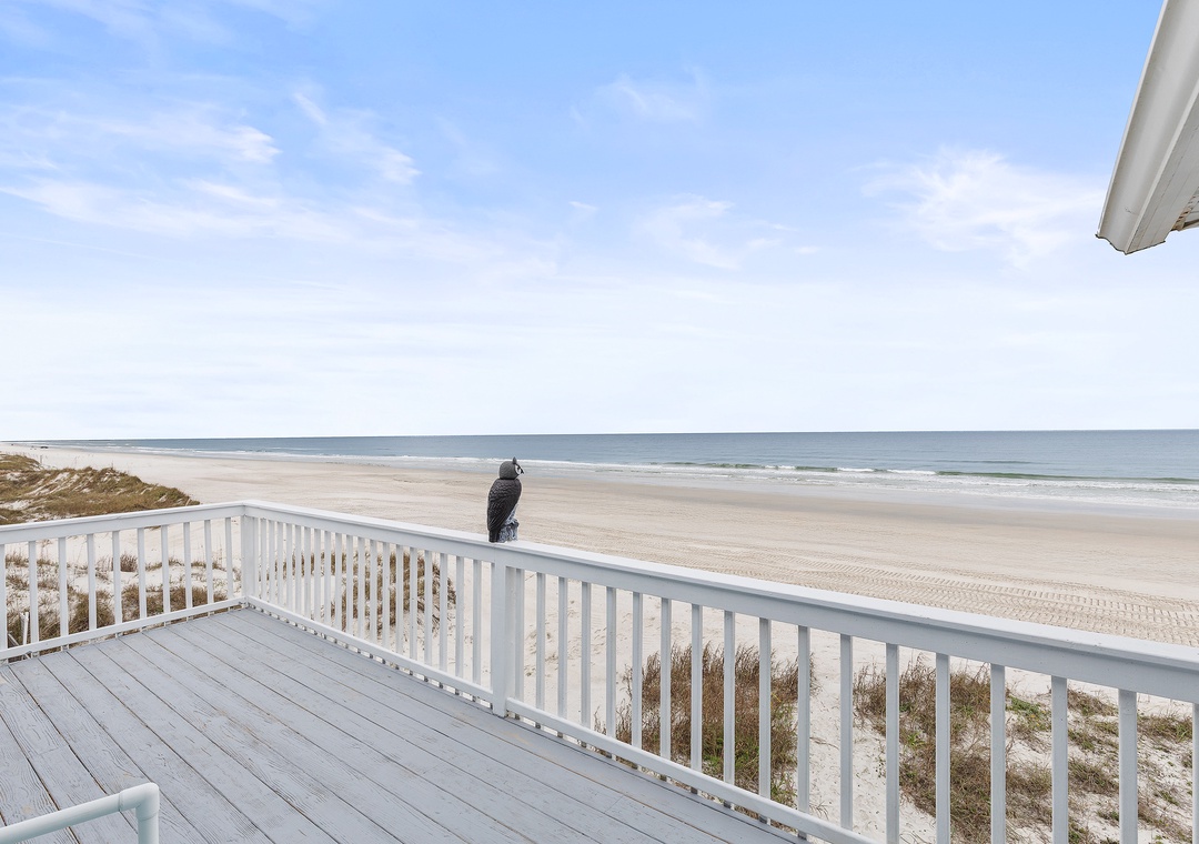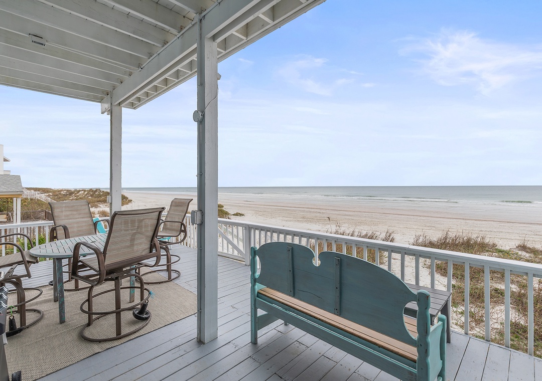 This well-loved four-bedroom, three-bath oceanfront home sits directly on the sand of the Atlantic Ocean and comfortably accommodates a maximum of eight guests, making it perfect for one large family or two small families. The home is a two-story residence built above a ground-level carport, giving it the feel of a three-level beach house and offering elevated, unobstructed ocean views.