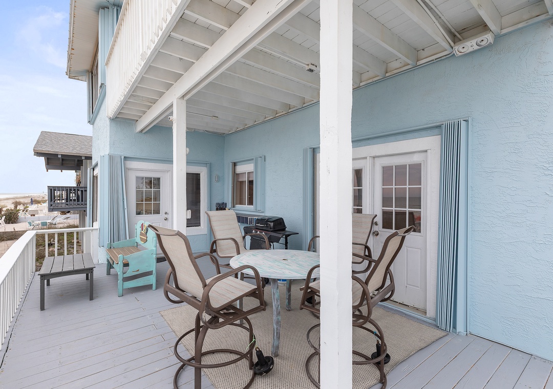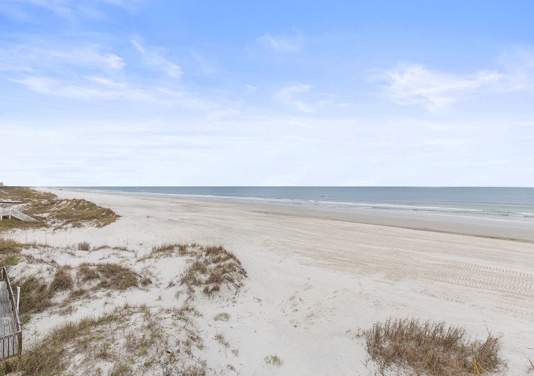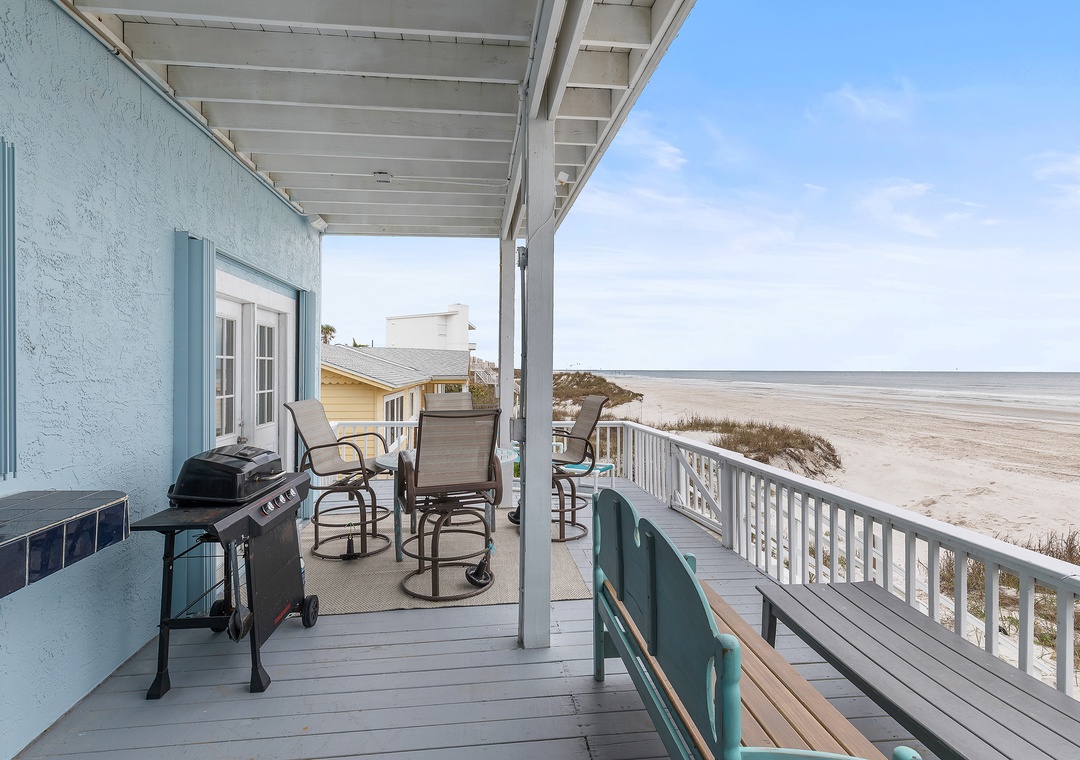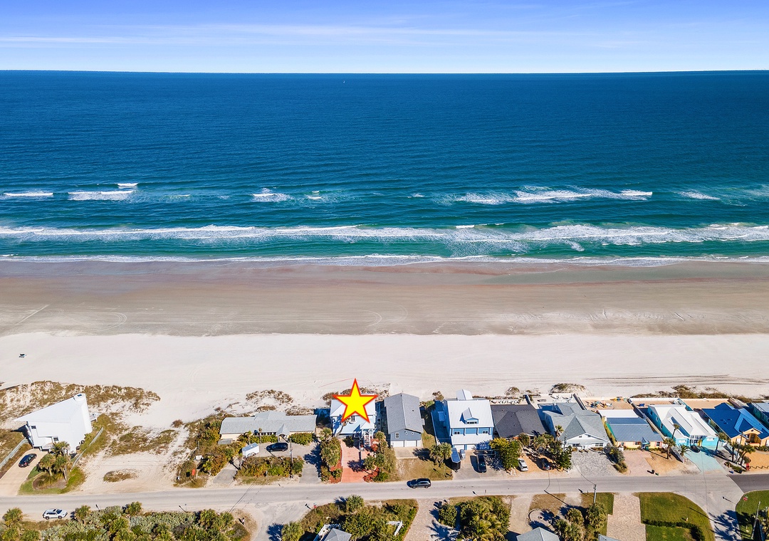 This well-loved four-bedroom, three-bath oceanfront home sits directly on the sand of the Atlantic Ocean and comfortably accommodates a maximum of eight guests, making it perfect for one large family or two small families. The home is a two-story residence built above a ground-level carport, giving it the feel of a three-level beach house and offering elevated, unobstructed ocean views.