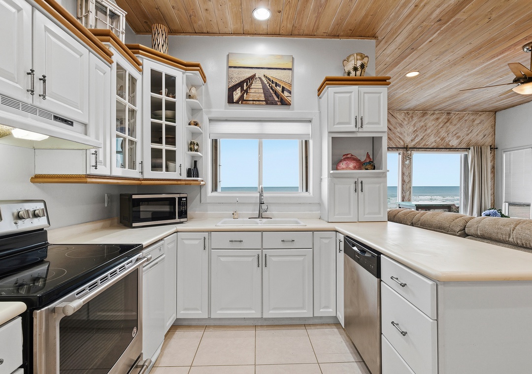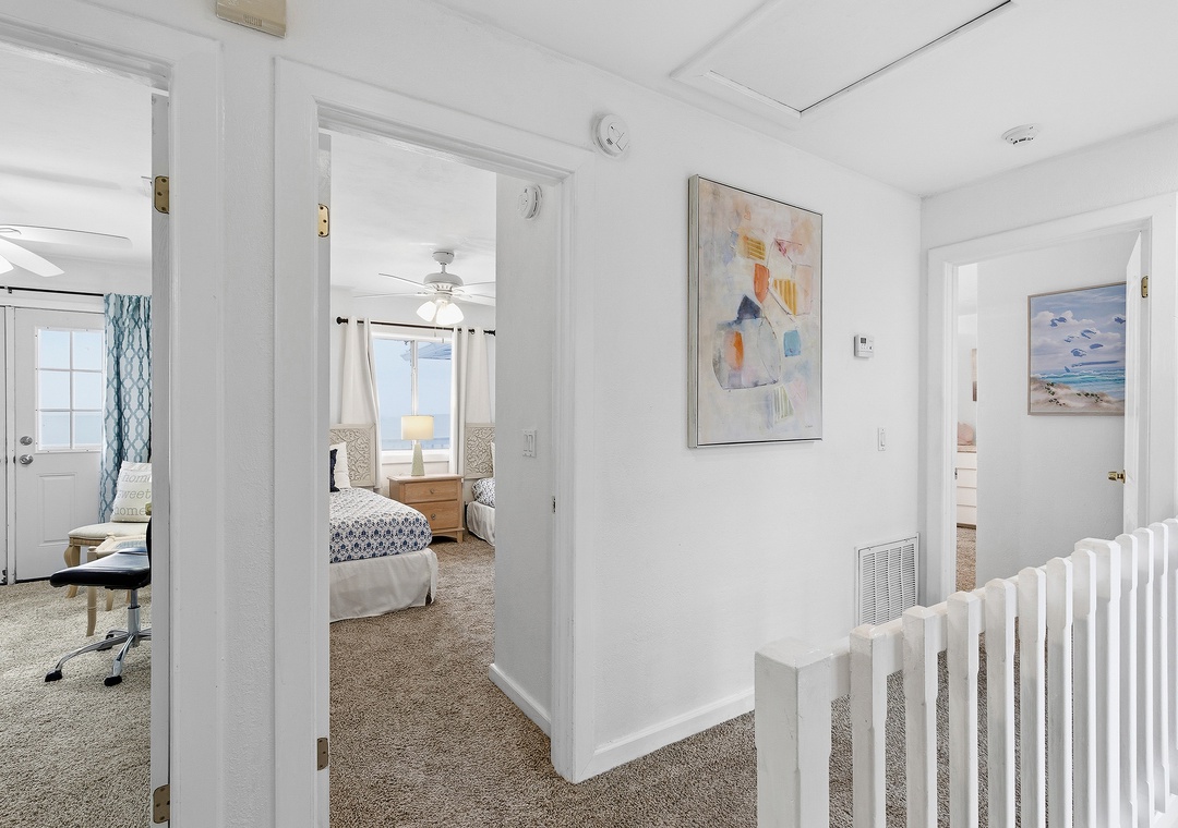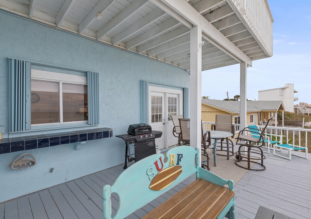 Upstairs, the two additional bedrooms include one with two twin beds and another with a double futon, which also features deck access to enjoy the ocean breeze. Every room in the house boasts breathtaking ocean views. The main living level welcomes you into a bright, open living area overlooking the Atlantic, complete with a flat-screen TV and sitting area with bar, a dining space that seats six comfortably, a fully equipped kitchen, and a laundry room with washer and dryer. Step outside to grill, relax on the deck, and watch the waves roll in.