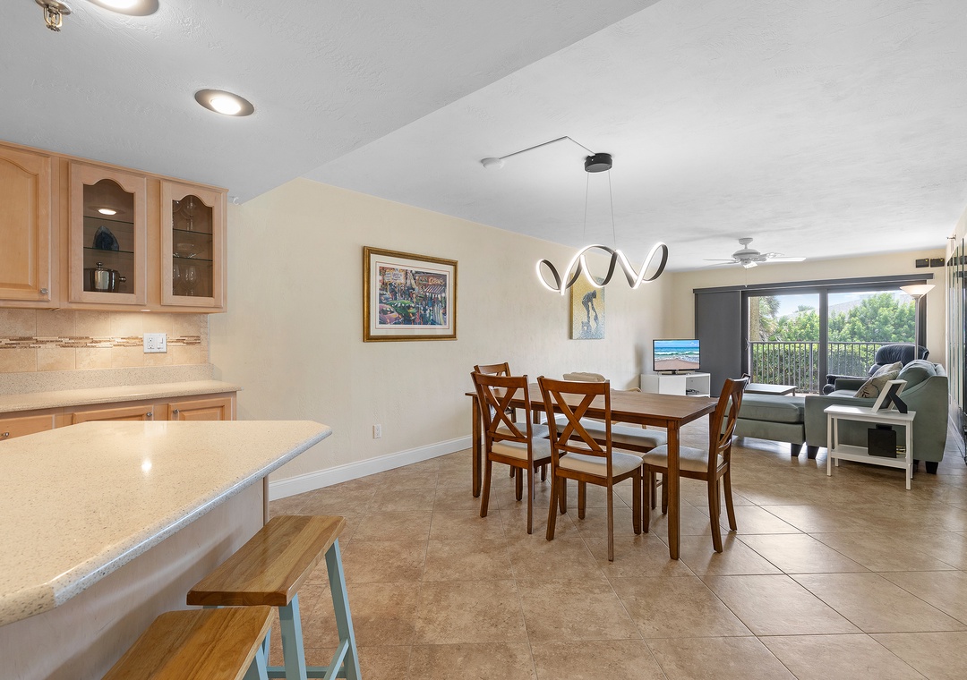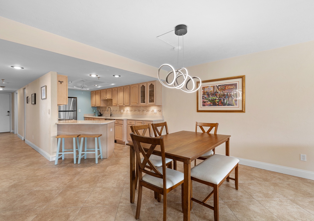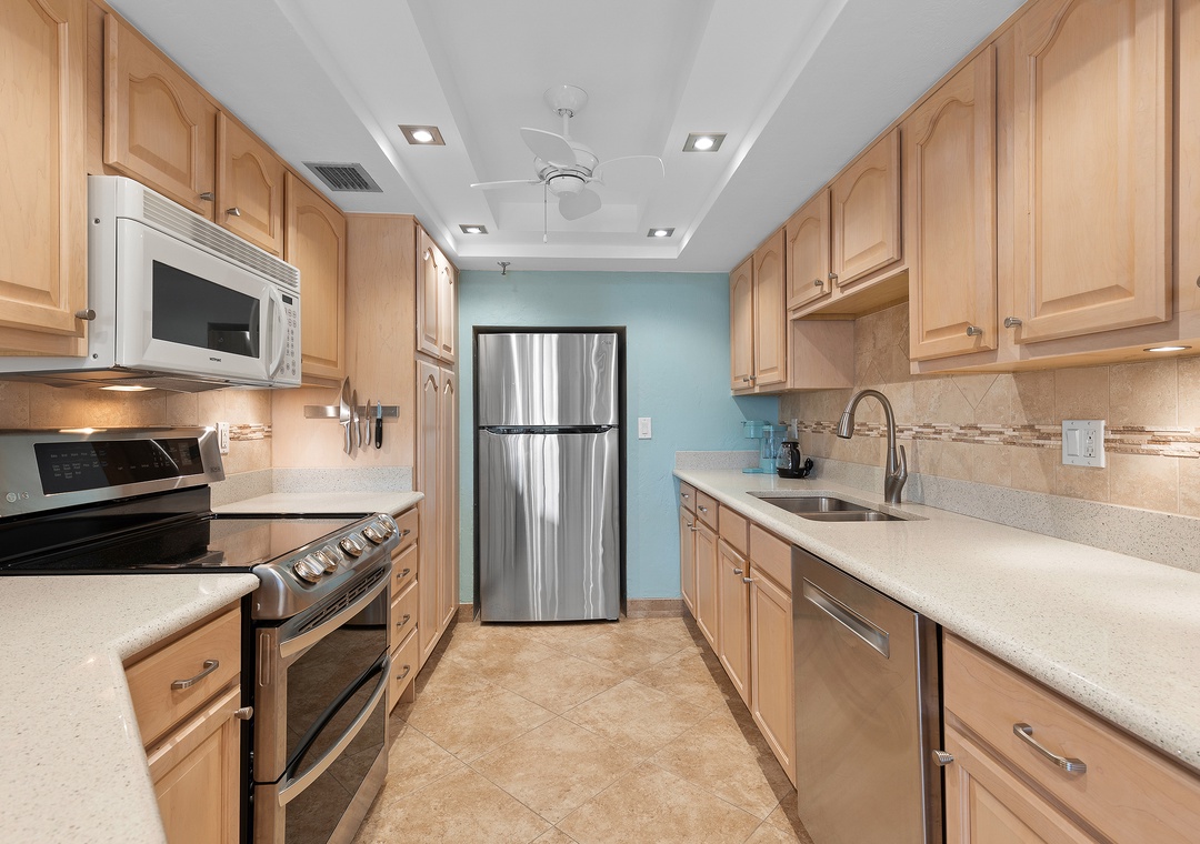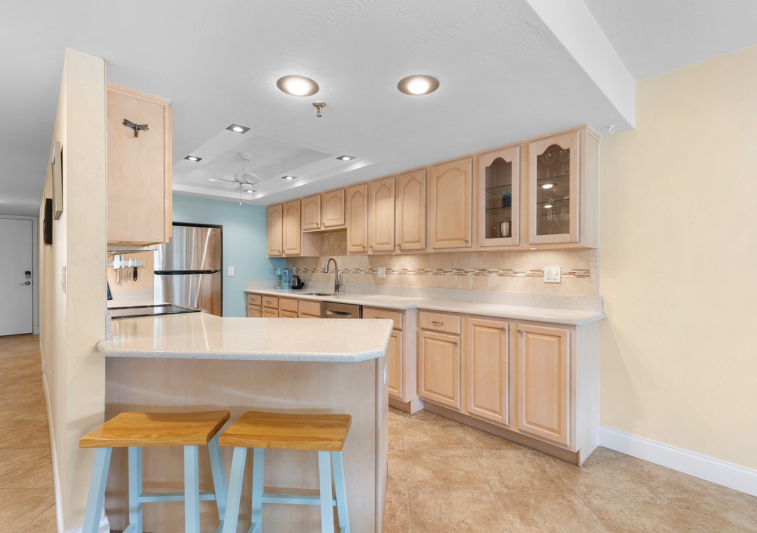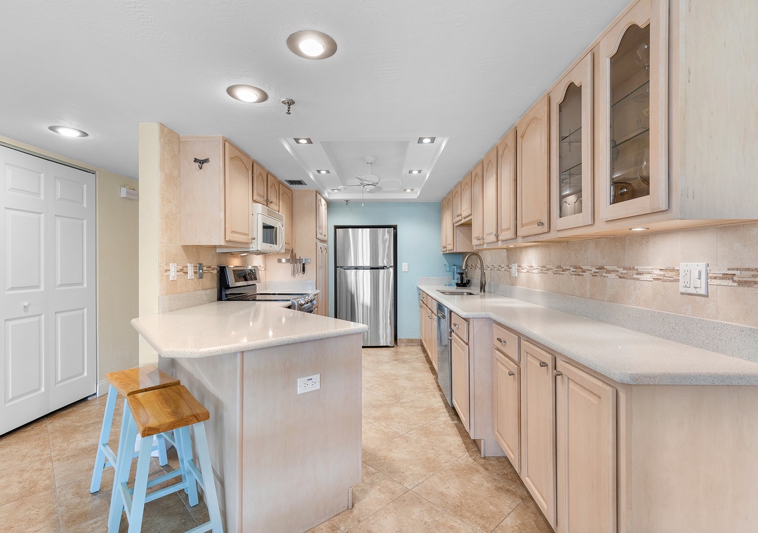 Inside, the condo offers a spacious and light-filled layout with a true 3-bedroom configuration. The primary suite boasts ocean views, balcony access, a walk-in closet, and a newly updated en-suite bathroom with stylish tile and fixtures. A second bedroom features a built-in Murphy bed and desk, making it ideal for guests or remote work. The kitchen is fully updated with quartz countertops, stainless steel appliances, light wood cabinetry, under-cabinet lighting, and a tray ceiling with recessed lights. The open-concept living and dining area flows seamlessly onto a 24-foot ocean view balcony with desirable southeast exposure—perfect for sipping coffee at sunrise or unwinding in the evening.