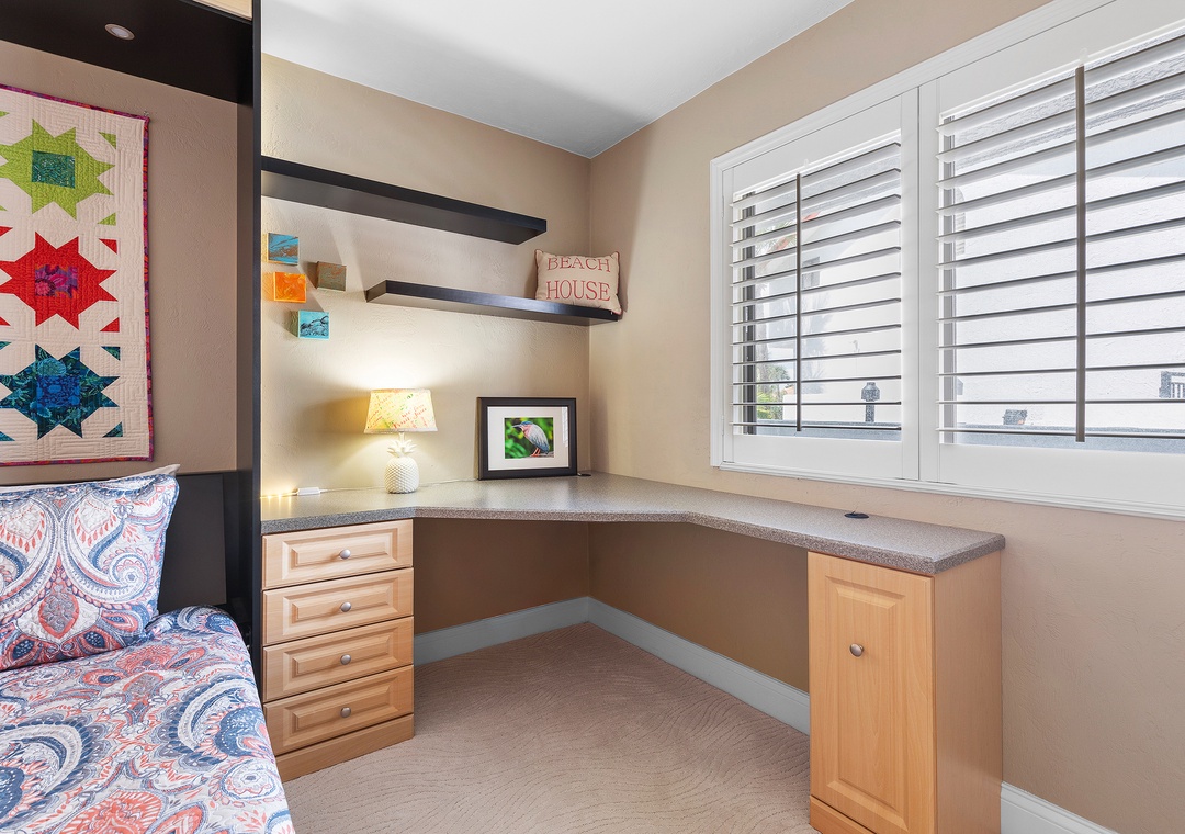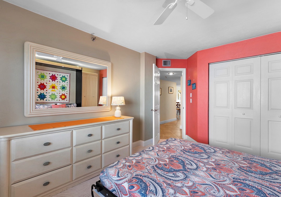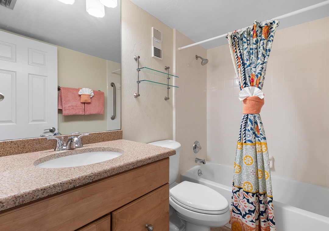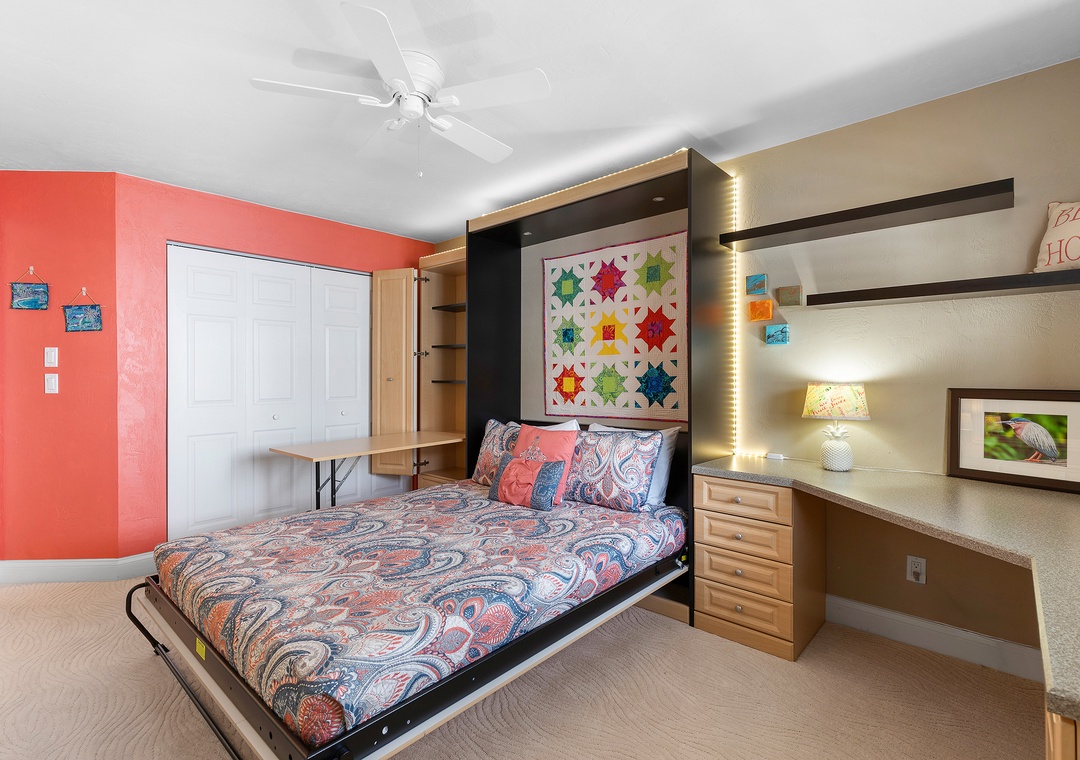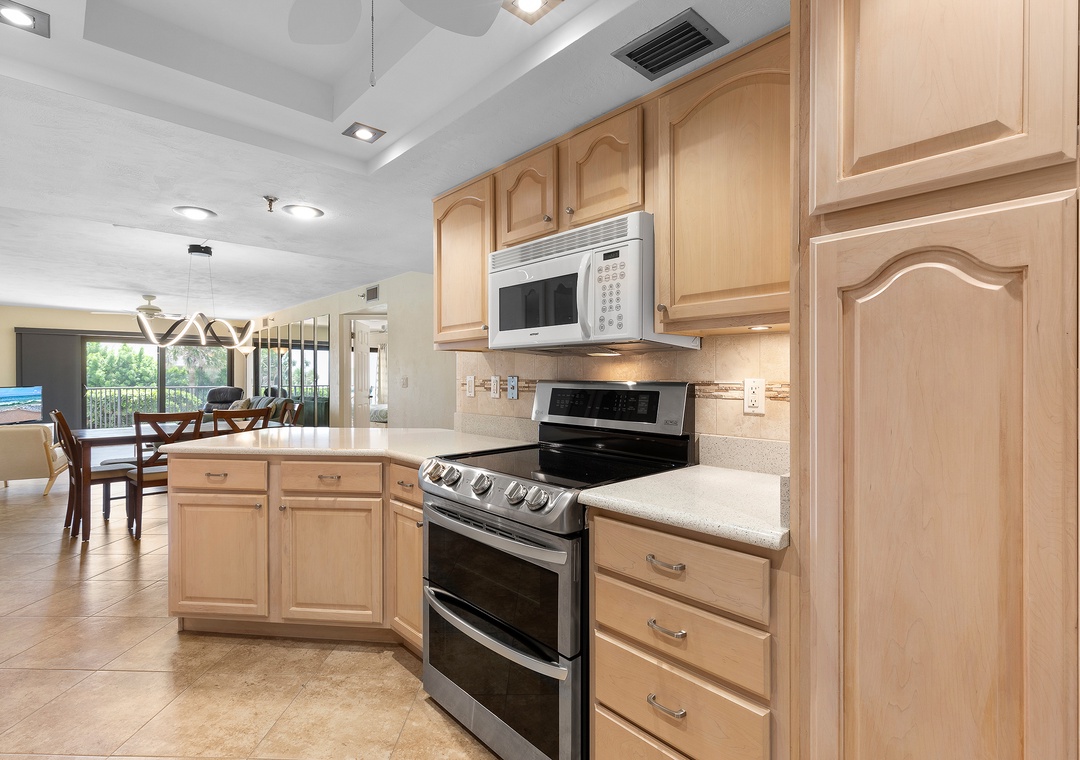 Inside, the condo offers a spacious and light-filled layout with a true 3-bedroom configuration. The primary suite boasts ocean views, balcony access, a walk-in closet, and a newly updated en-suite bathroom with stylish tile and fixtures. A second bedroom features a built-in Murphy bed and desk, making it ideal for guests or remote work. The kitchen is fully updated with quartz countertops, stainless steel appliances, light wood cabinetry, under-cabinet lighting, and a tray ceiling with recessed lights. The open-concept living and dining area flows seamlessly onto a 24-foot ocean view balcony with desirable southeast exposure—perfect for sipping coffee at sunrise or unwinding in the evening.