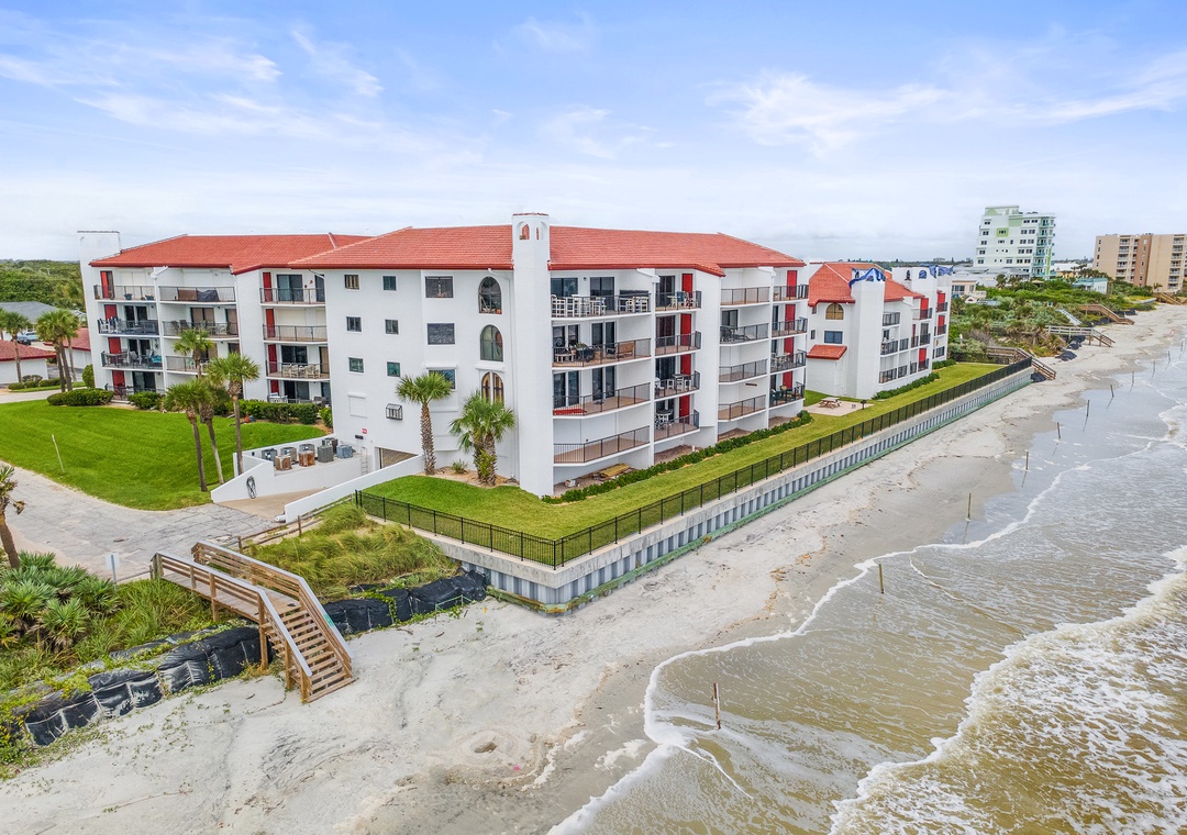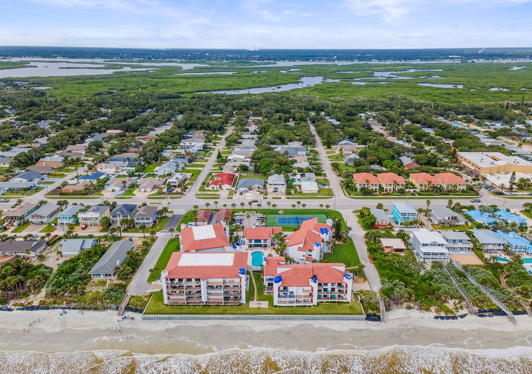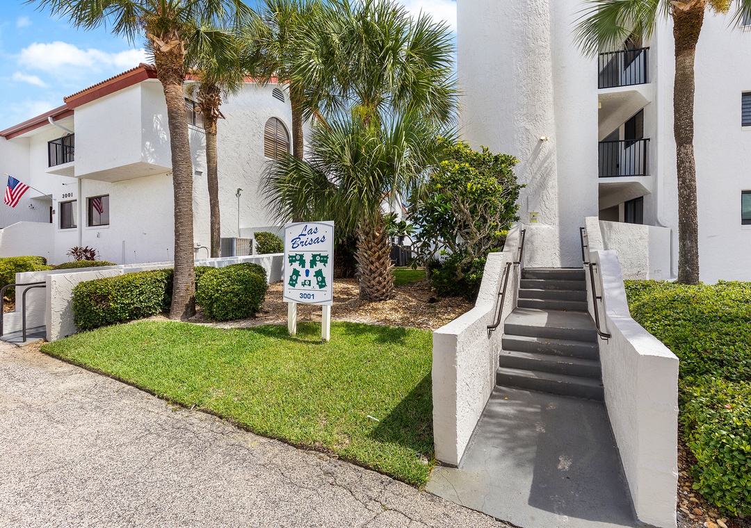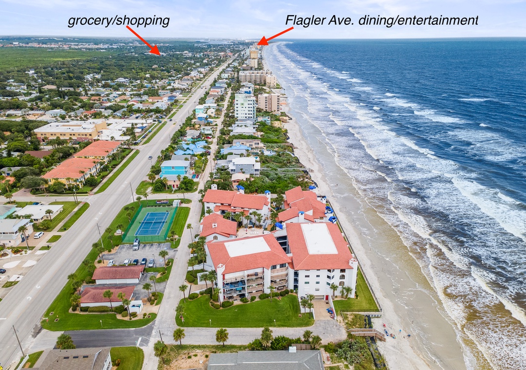 Nestled in a golf cart-friendly community and just steps away from several restaurants, this condo is ideally located only half a mile from the Publix shopping plaza and less than 2 miles from the famous Flagler Avenue, where you'll find an abundance of shopping, dining, and live entertainment options. With two beach walkovers flanking the complex, morning strolls, swimming, surfing, and making coastal memories with friends and family are just moments away. The Las Brisas complex boasts a charming Spanish theme with white stucco and red clay tile roofs, creating an intimate midrise development boasting 200 feet of ocean frontage and lush gardens. Residents of Las Brisas enjoy access to top-notch amenities, including tennis courts, a clubhouse with sauna, a heated swimming pool and a spa.