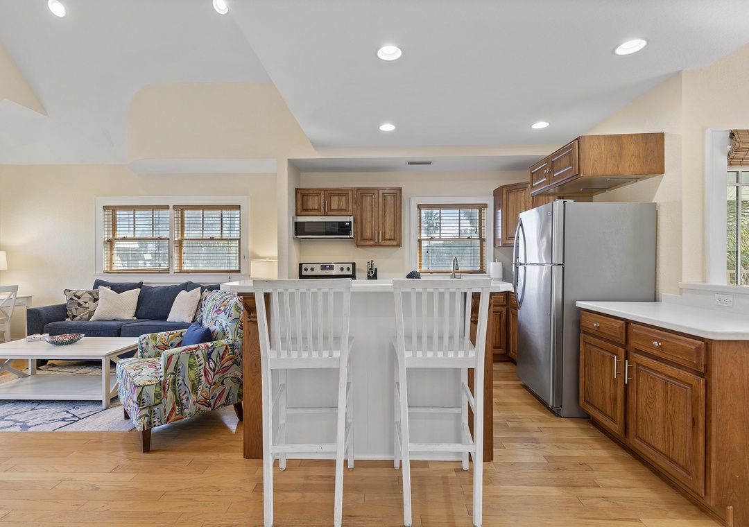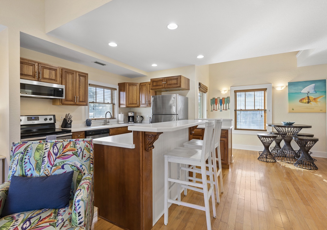 As you make your way to the kitchen, you will be astonished by its striking appearance and open layout design. Upscale cherry cabinets, stainless steel appliances, and bright white solid-surface countertops exude an inviting atmosphere. This fully equipped kitchen comes supplied with a drip coffee maker, toaster, blender, dishes, silverware, dishwasher, and microwave. The kitchen island offers seating for two and allows for company while you cook an exquisite meal.