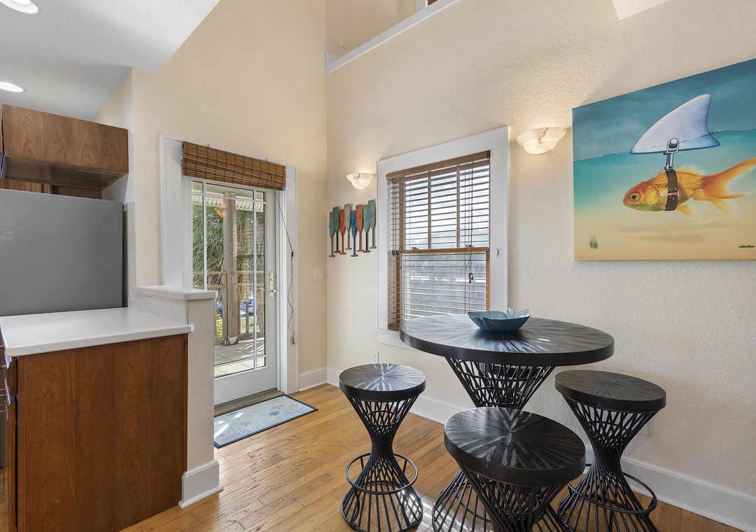 The entrance is located in the back of the property where a staircase will guide you to the front door. As you enter the cottage, you will be charmed by the hardwood floors that span the interior of the property and the endlessly high ceilings with a lofted upper level. You first see the dining area with unique embellishments and a modern dining table set when you walk in. You and two others can gather around the table for breakfast each morning before setting off to explore New Smyrna Beach.