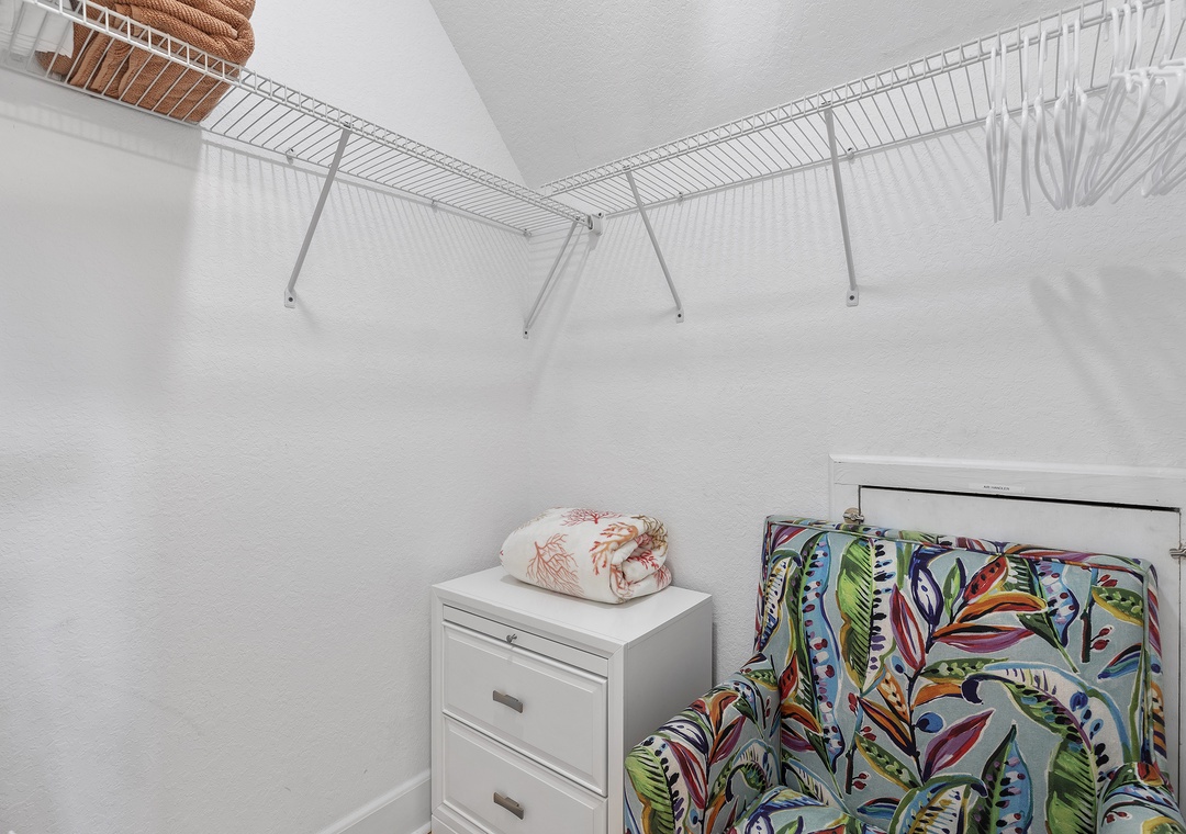 Head up the stairs to discover the loft. Furnished with a queen bed and accent chair, this room has a double-sided view of the lower level. On the right side, you will see the living area, and on the left side the dining area. This space also offers plenty of space in the walk-in closet. The bright coastal bedding brings the space to life.