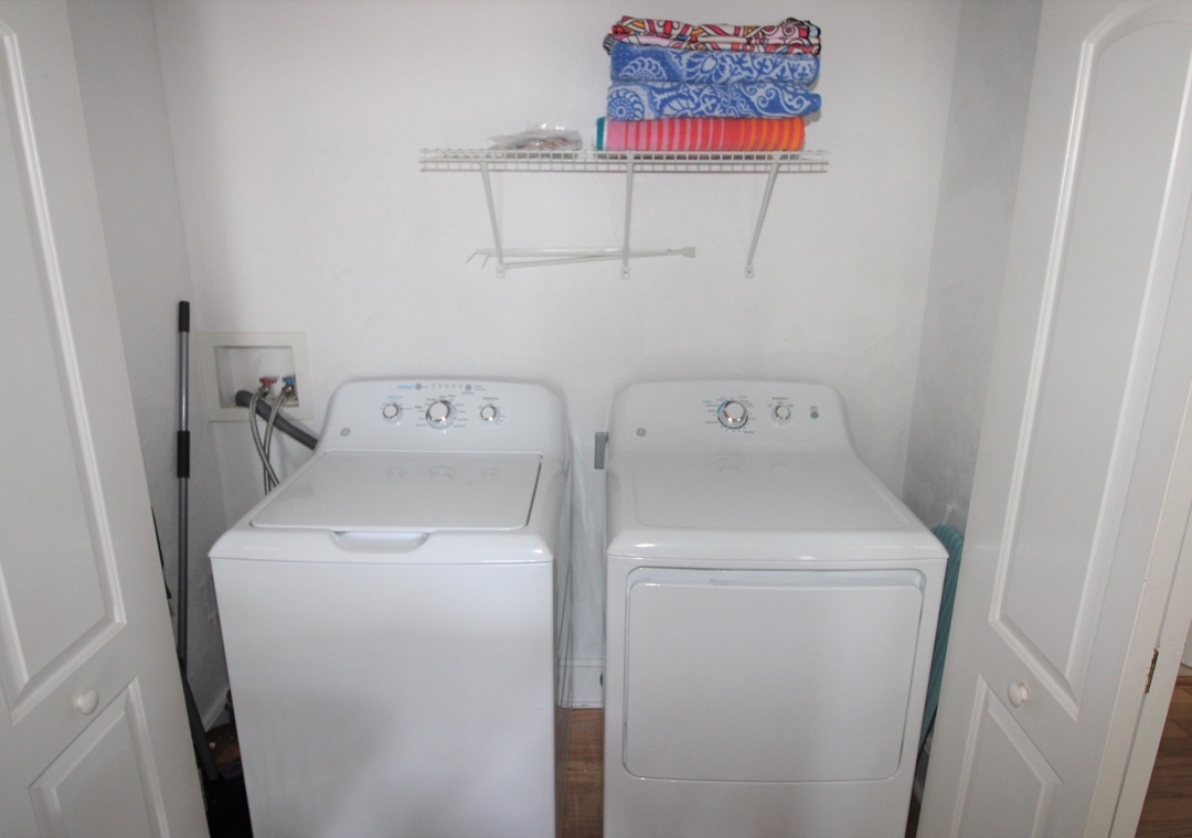 This condo is equipped with a full washer and dryer, plenty of linens, towels, and all the conveniences of home to make your stay comfortable. There is WiFi, cable, Smart TVs, a hair dryer, an iron and ironing board, a drip coffee maker, games, and beach chairs.