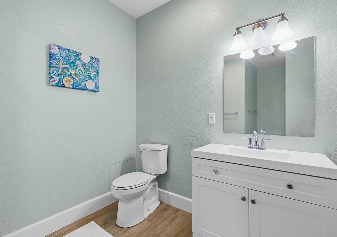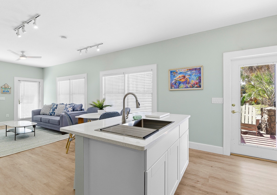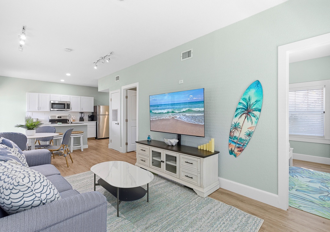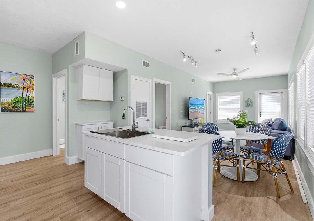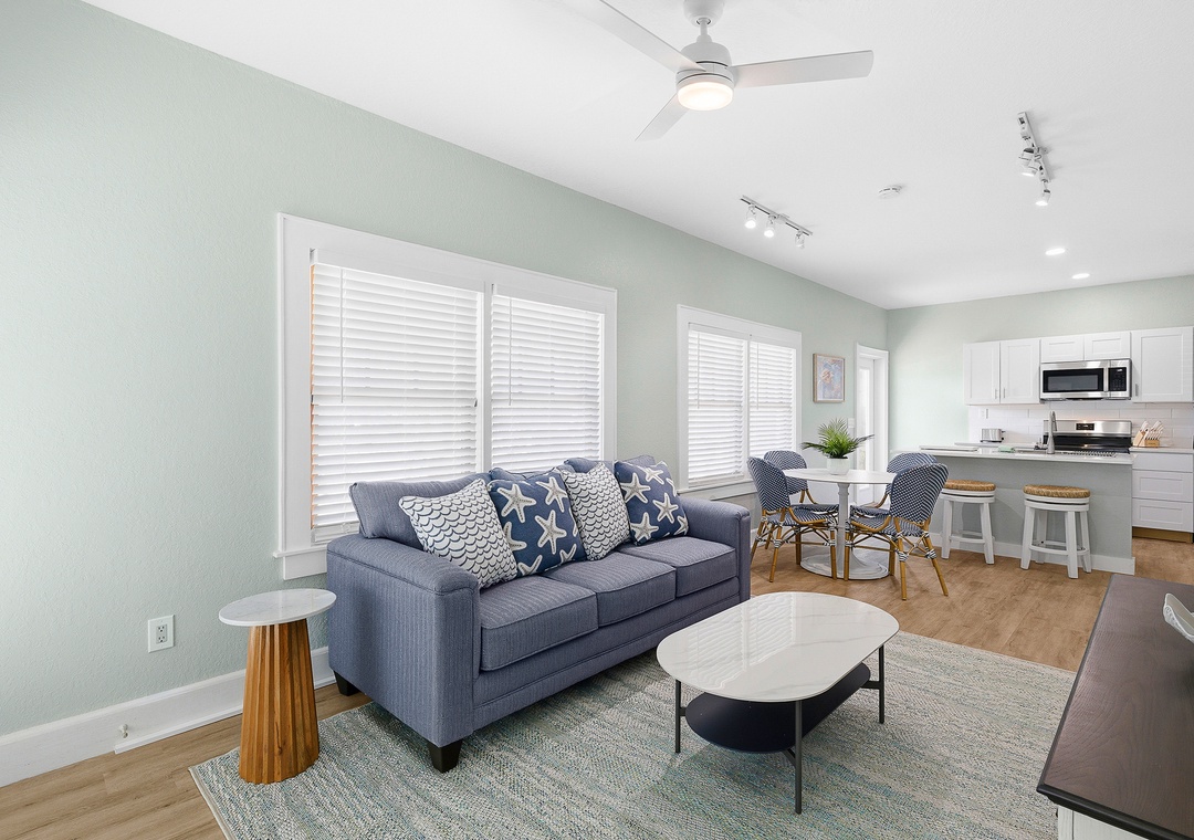 Welcome to Lofty Suites—a brand-new, fully renovated ground-floor coastal retreat nestled on the corner of N Pine and Flagler Avenue in the heart of New Smyrna Beach! This bright and stylish 2-bedroom, 1-bath unit sleeps up to four guests and is designed for comfort and ease, with fresh modern finishes, coastal-inspired décor, and abundant natural light throughout. Both bedrooms are generously sized—one with a queen bed and one with a full bed—each with wardrobe storage. The open living area features a smart TV, dining table for four, and island seating for two, while the fully stocked kitchen has everything you need for easy meals in. An all-in-one washer and dryer and ceiling fans throughout round out the thoughtful amenities. Step outside through the front entrance or private side door onto a charming brick paver patio—the perfect spot for morning coffee or evening drinks while soaking in the lively Flagler Avenue atmosphere.
