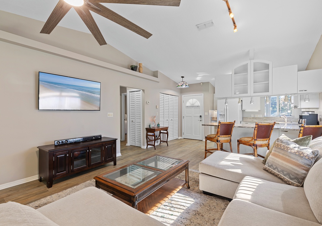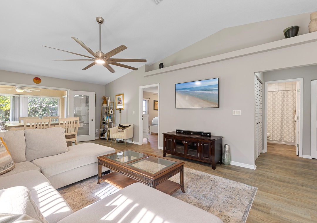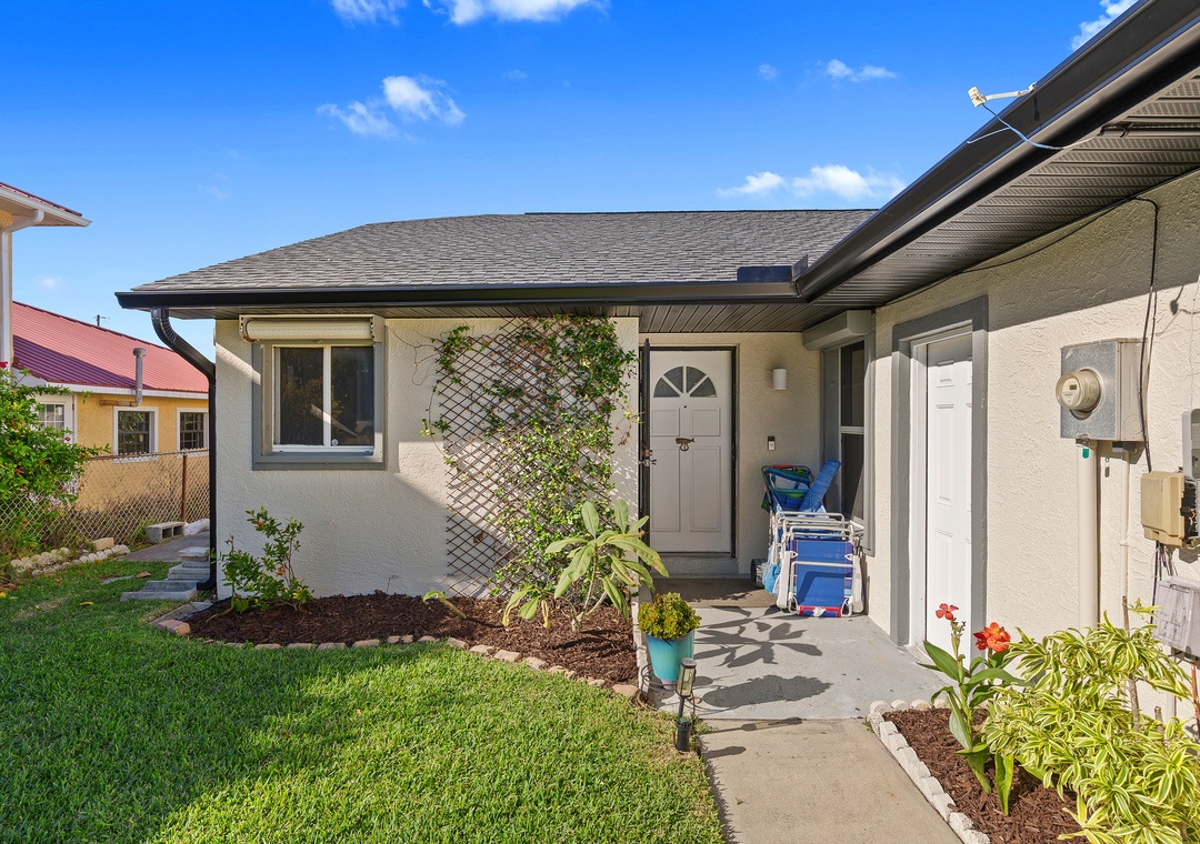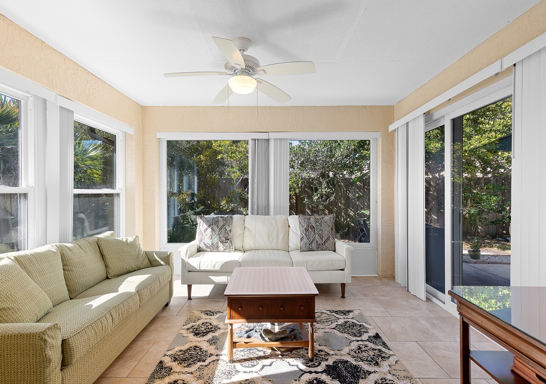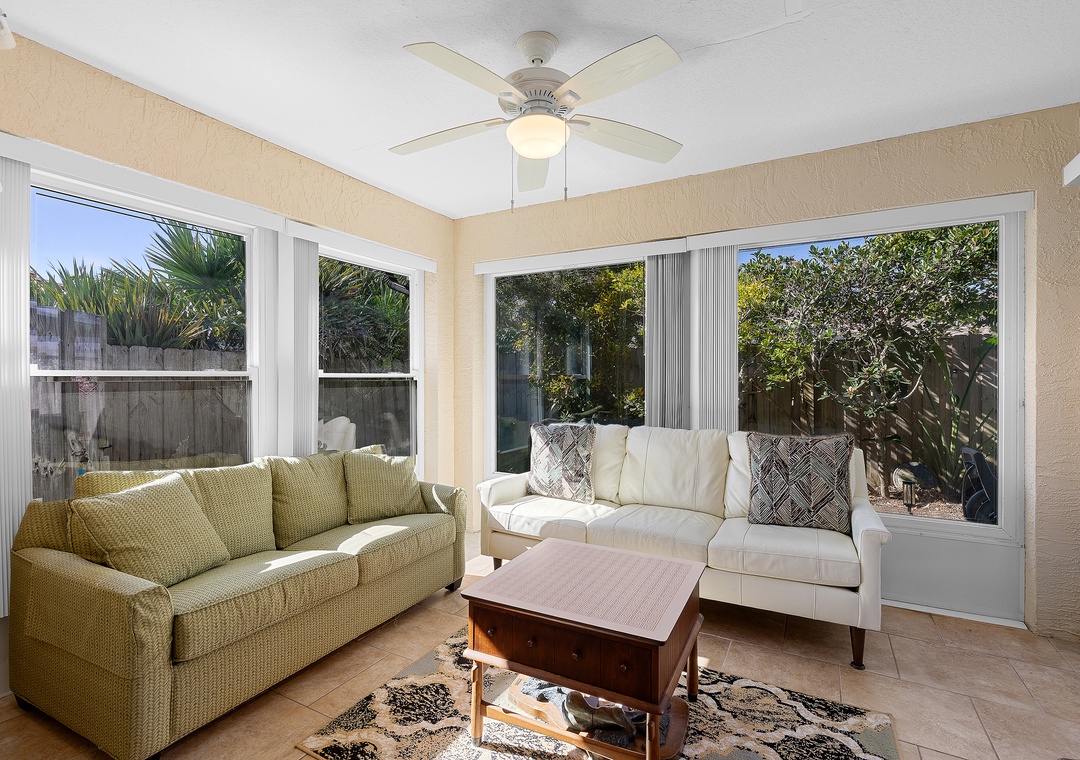 This easy beachside duplex is perfectly located across A1A from the non-drive section of New Smyrna Beach, just steps from the 29th Avenue beach access. With two bedrooms and two bathrooms, it comfortably accommodates up to six guests. The primary bedroom features a queen bed with an ensuite bathroom, while the guest room includes a daybed with a trundle that converts into a king-size bed. Additional sleeping options include a sleeper sofa in the sunroom, which opens directly onto the patio. The living area offers a cozy sectional and a Smart TV, making it a great place to relax after a day in the sun. The home also includes a fully equipped kitchen and in-unit washer and dryer for added convenience.