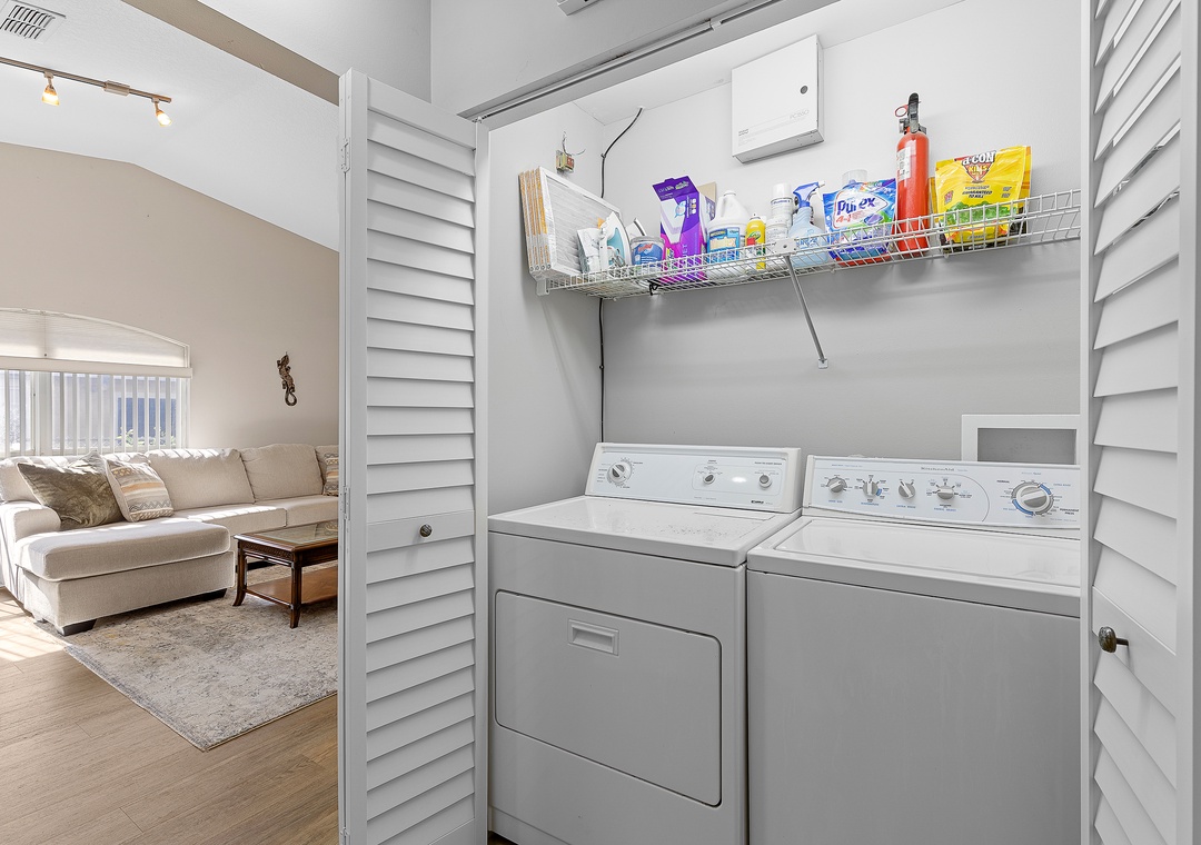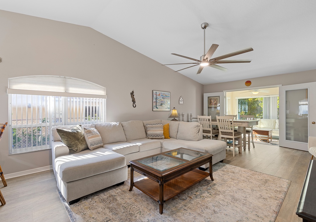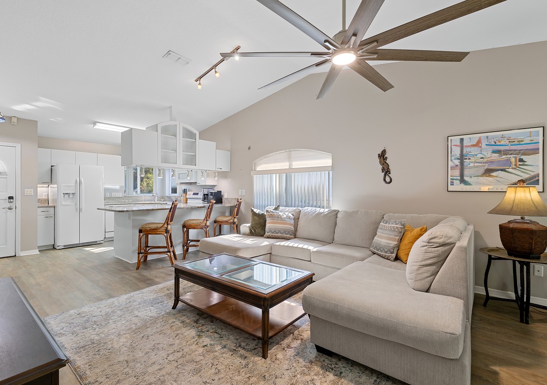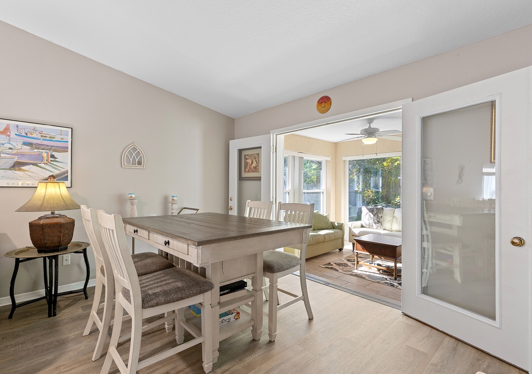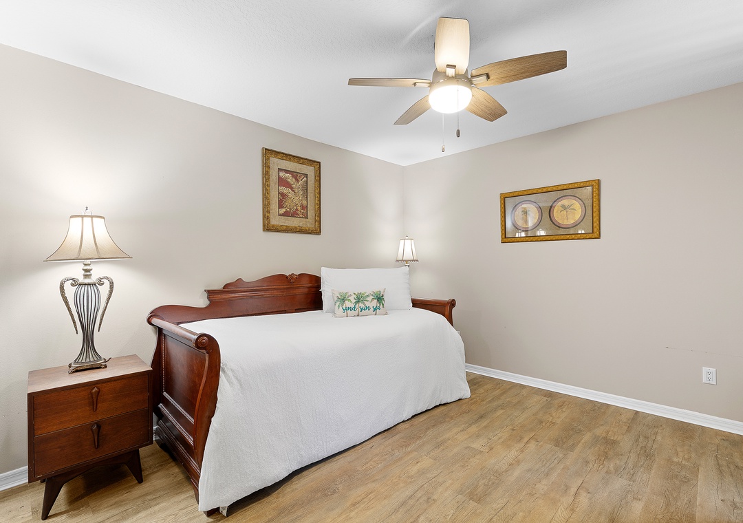 This easy beachside duplex is perfectly located across A1A from the non-drive section of New Smyrna Beach, just steps from the 29th Avenue beach access. With two bedrooms and two bathrooms, it comfortably accommodates up to six guests. The primary bedroom features a queen bed with an ensuite bathroom, while the guest room includes a daybed with a trundle that converts into a king-size bed. Additional sleeping options include a sleeper sofa in the sunroom, which opens directly onto the patio. The living area offers a cozy sectional and a Smart TV, making it a great place to relax after a day in the sun. The home also includes a fully equipped kitchen and in-unit washer and dryer for added convenience.