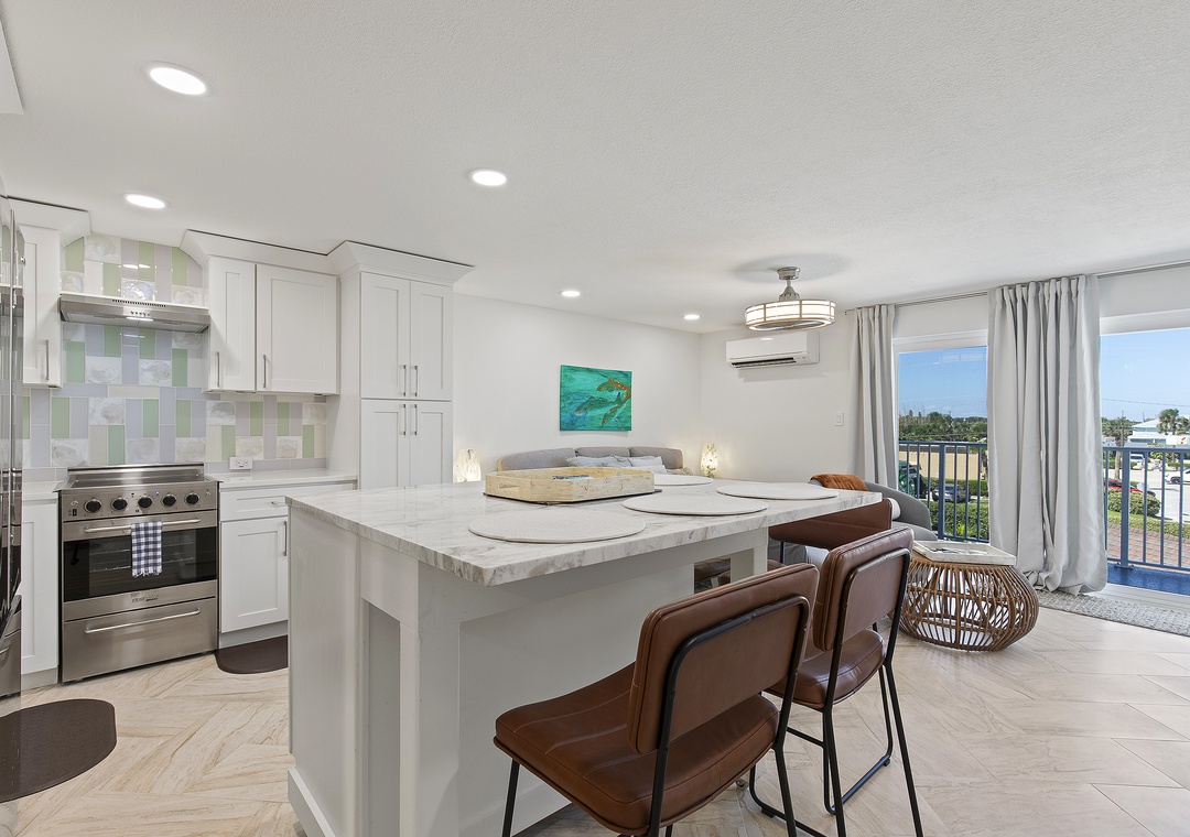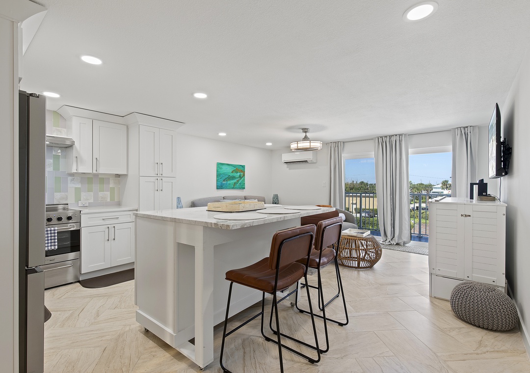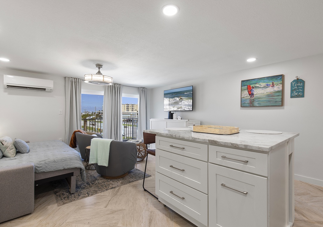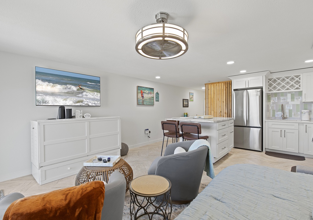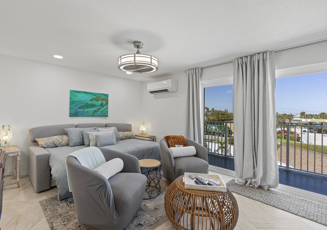 Inside, modern coastal décor and thoughtful touches create a relaxing retreat. The open living space features a queen-size pullout bed, two cozy chairs for lounging, and a full kitchen equipped for all your vacation cooking needs. Bright and airy, this studio blends style and function, making it a perfect choice for couples or solo travelers looking to enjoy the best of New Smyrna Beach. Step out onto your balcony for a morning coffee with an ocean view or unwind after a day in the sun - your seaside getaway awaits at Mariner’s Cove.