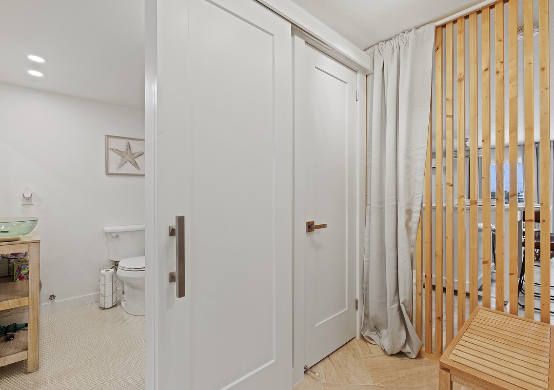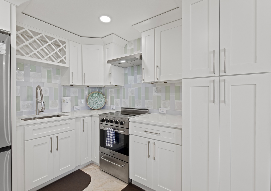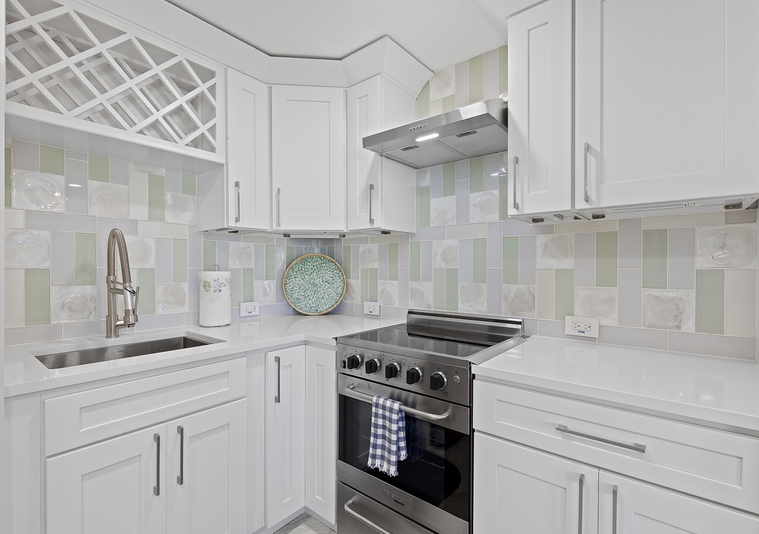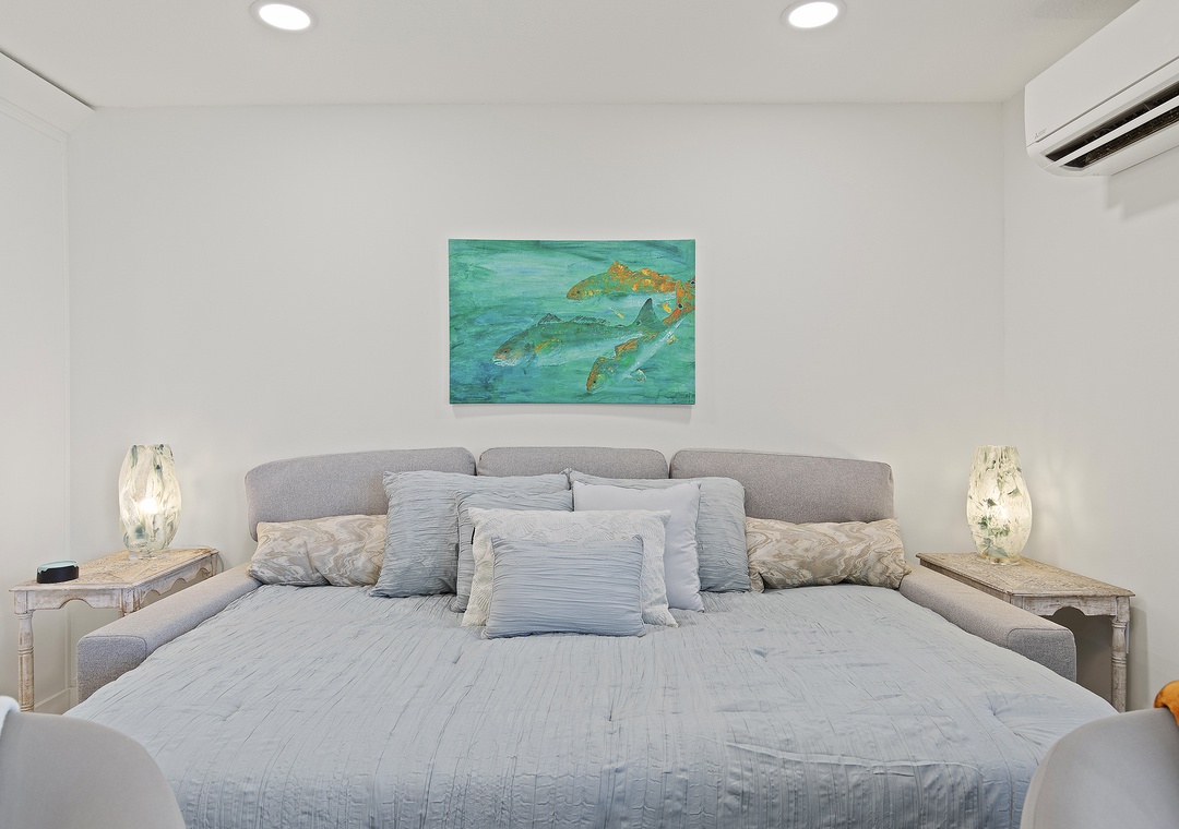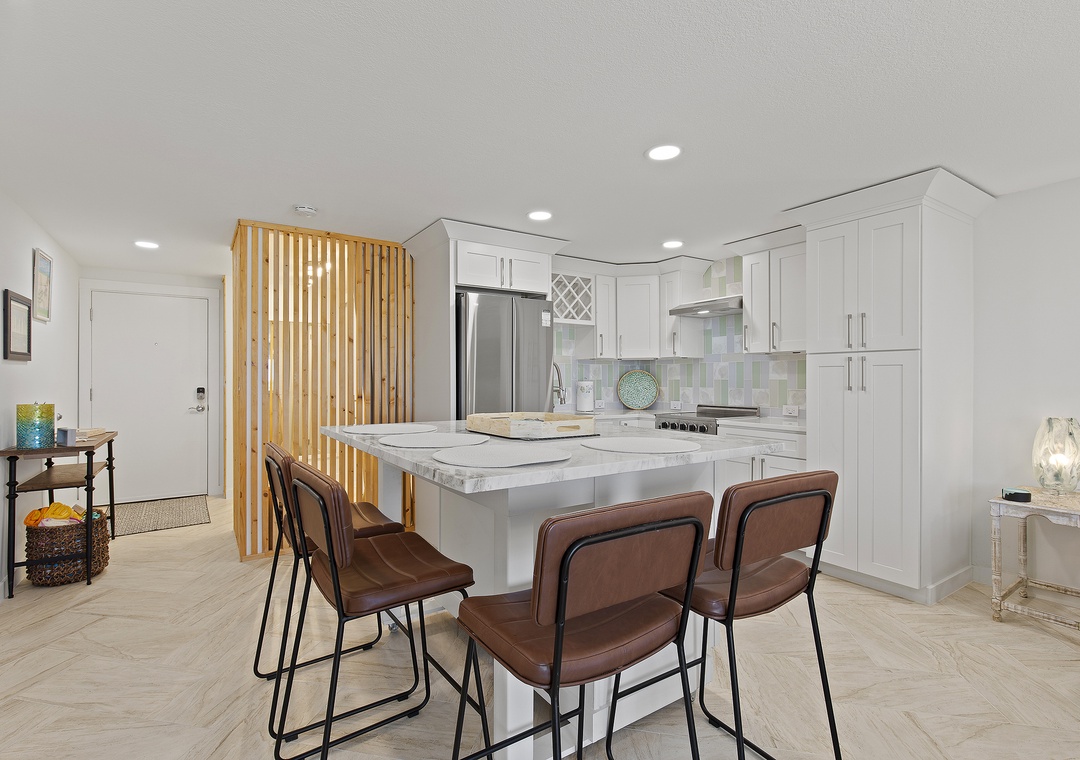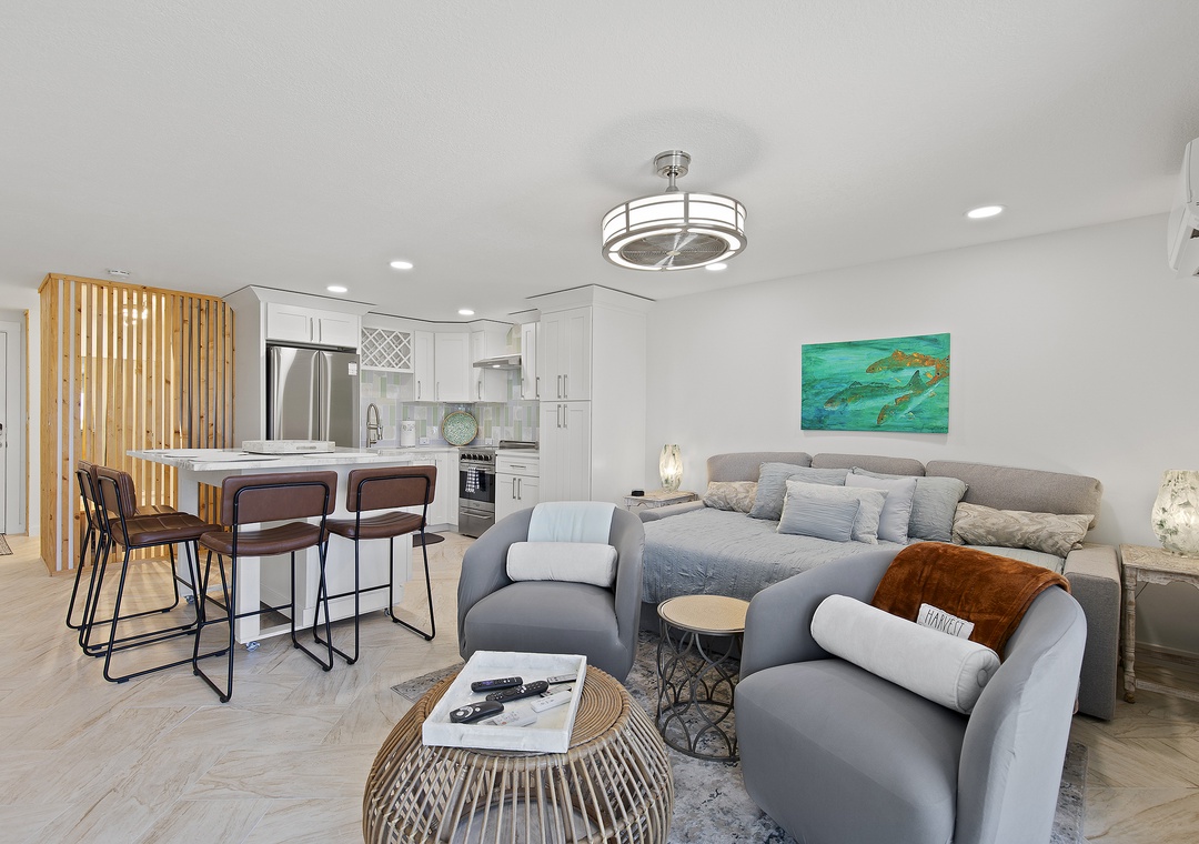 Inside, modern coastal décor and thoughtful touches create a relaxing retreat. The open living space features a queen-size pullout bed, two cozy chairs for lounging, and a full kitchen equipped for all your vacation cooking needs. Bright and airy, this studio blends style and function, making it a perfect choice for couples or solo travelers looking to enjoy the best of New Smyrna Beach. Step out onto your balcony for a morning coffee with an ocean view or unwind after a day in the sun - your seaside getaway awaits at Mariner’s Cove.