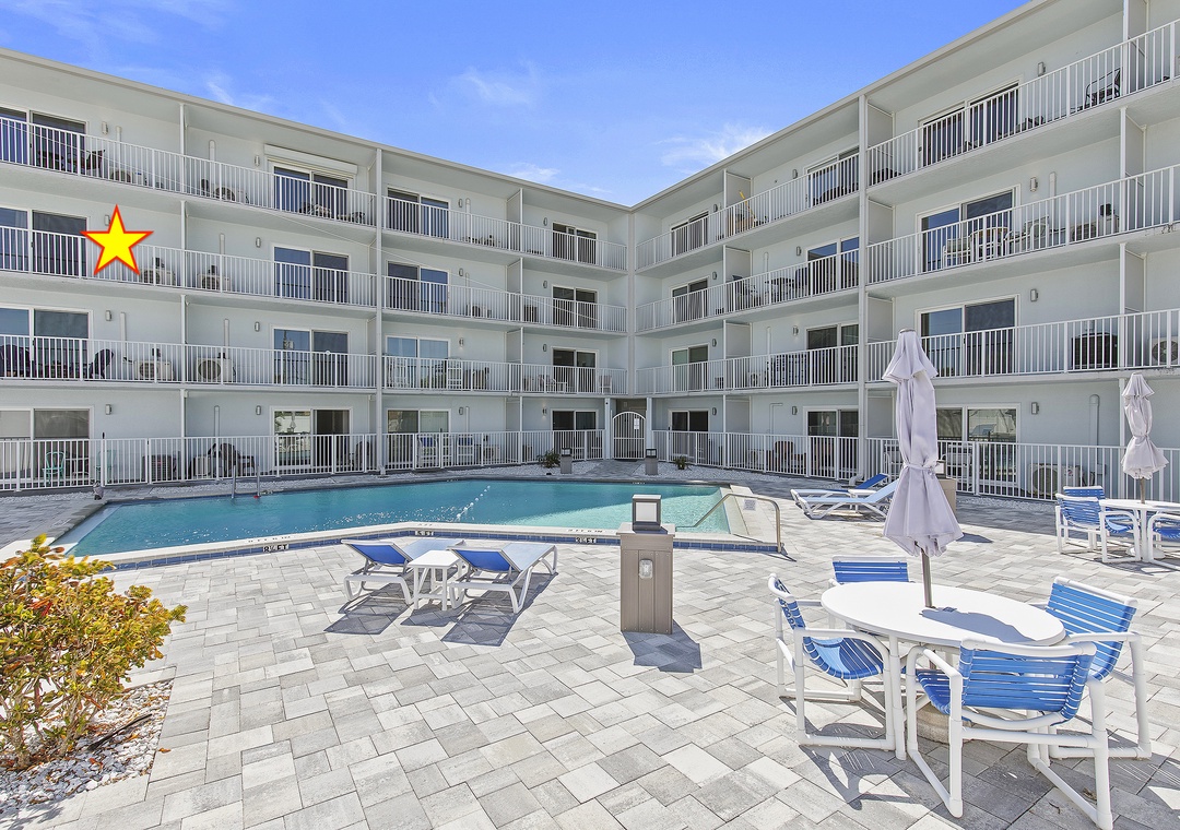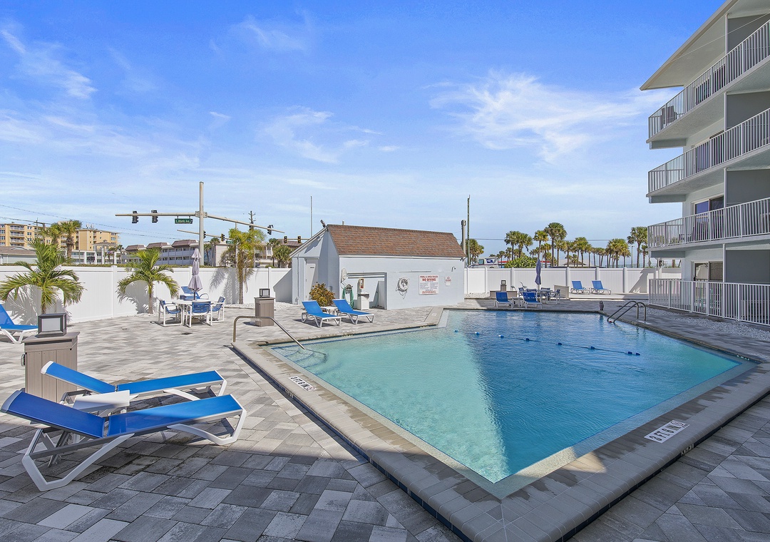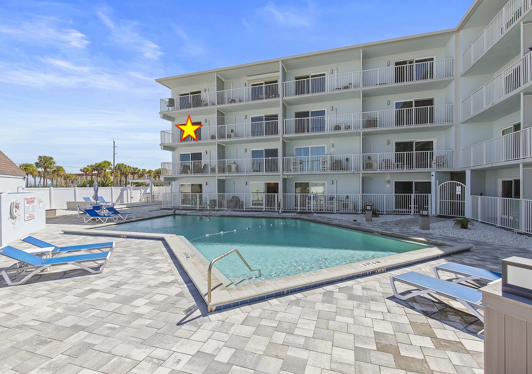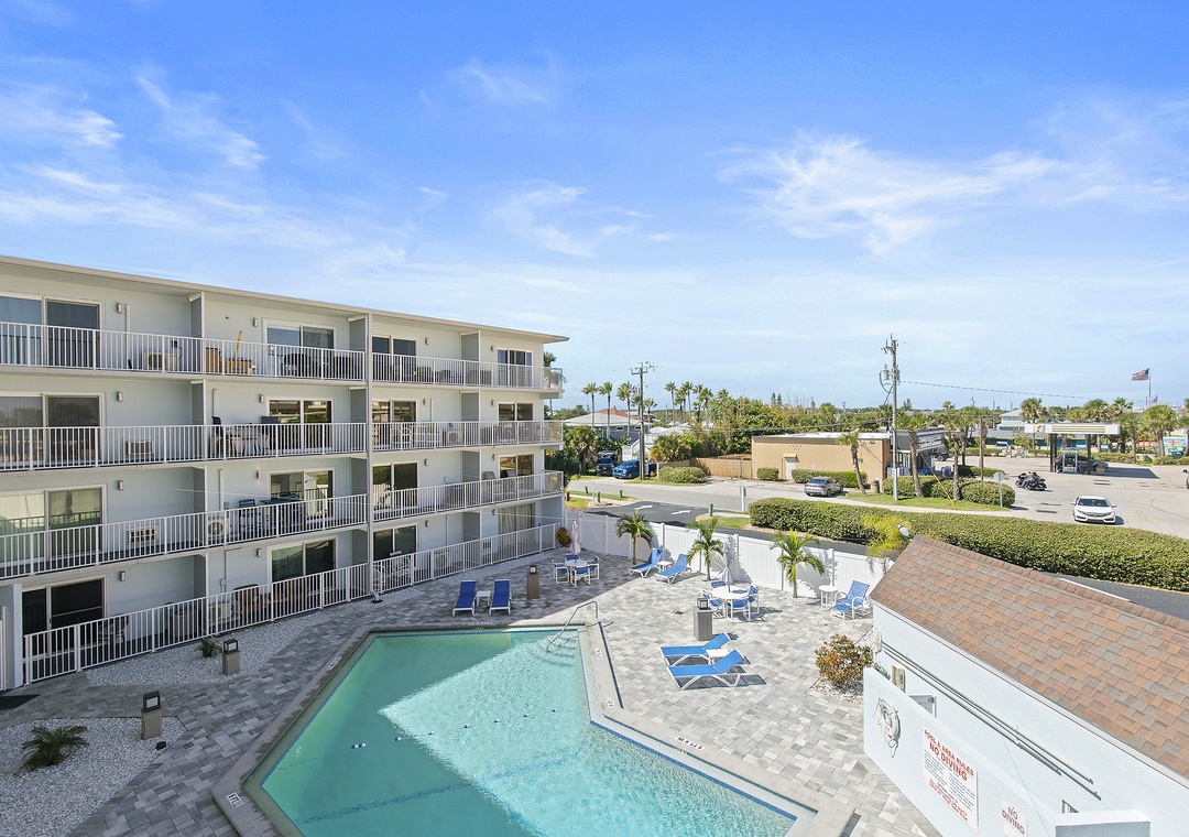 The complex layout offers convenient amenities and a relaxed coastal vibe: common laundry areas, a fenced community pool with updated deck and pavers, grilling area, and assigned plus guest parking. The studios feature open layouts that maximize space and offer ocean views from private balconies.