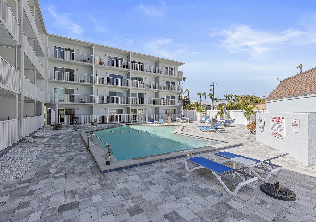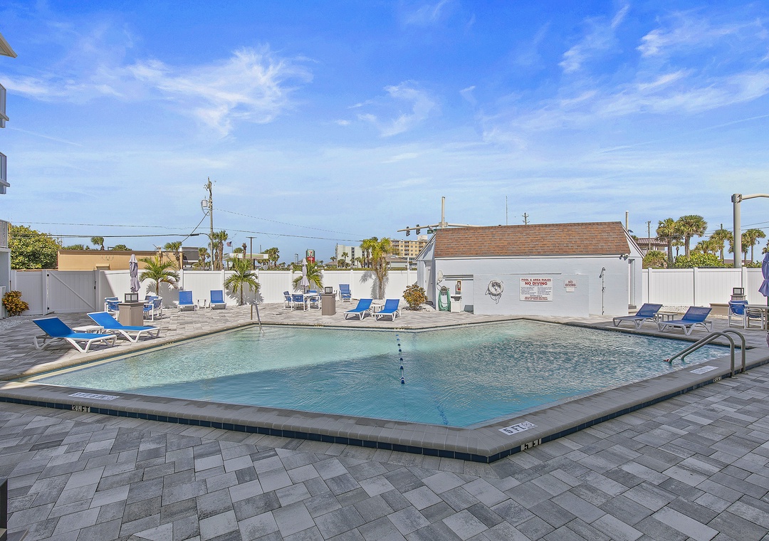 The complex layout offers convenient amenities and a relaxed coastal vibe: common laundry areas, a fenced community pool with updated deck and pavers, grilling area, and assigned plus guest parking. The studios feature open layouts that maximize space and offer ocean views from private balconies.