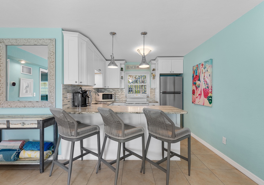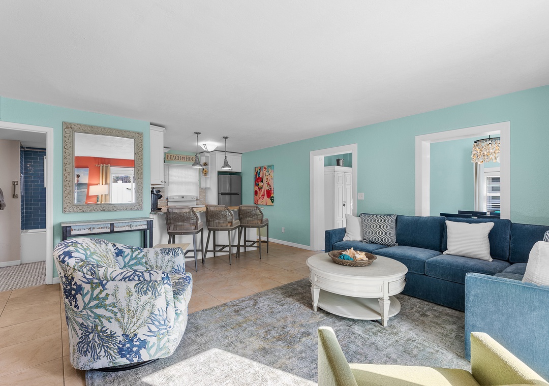 4-bedroom, 3-bathroom Key Lime Green beach home with a private heated pool just steps from the pristine Atlantic shore. This pet-friendly retreat accommodates up to 12 guests, offering two spacious living areas and two fully stocked kitchens with updated granite countertops. The laid-back beachy décor and ample seating in the living rooms create an ideal setting for family gatherings or cozy movie nights. Two sleeper sofas supplement sleep spaces.