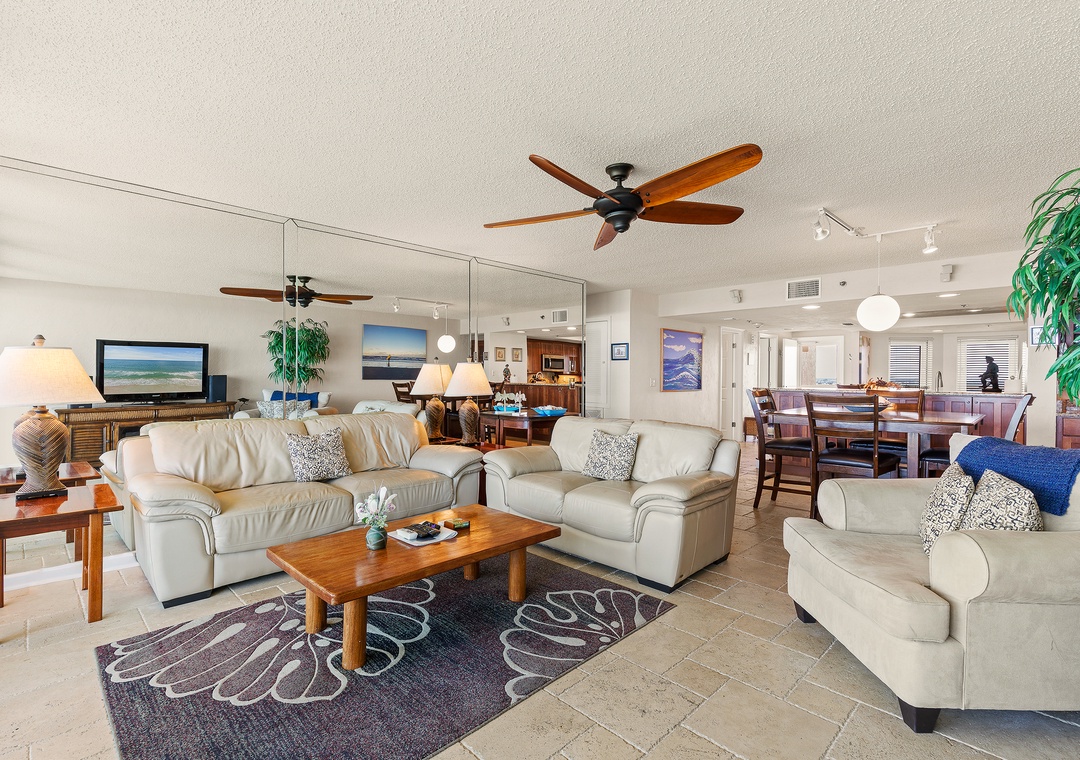 Inside, the open-concept living and dining area features wall-to-wall sliding glass doors that keep the ocean in view from nearly every angle. Relax on the comfortable seating, enjoy a movie on the flat-screen TV, or gather around the dining table for meals, games, or remote work with free Wi-Fi.