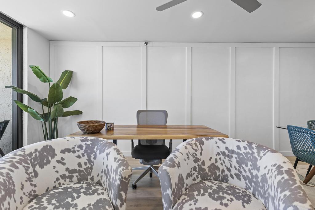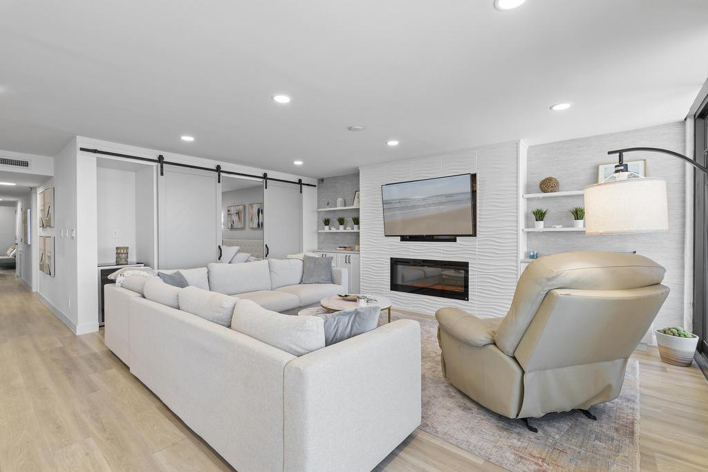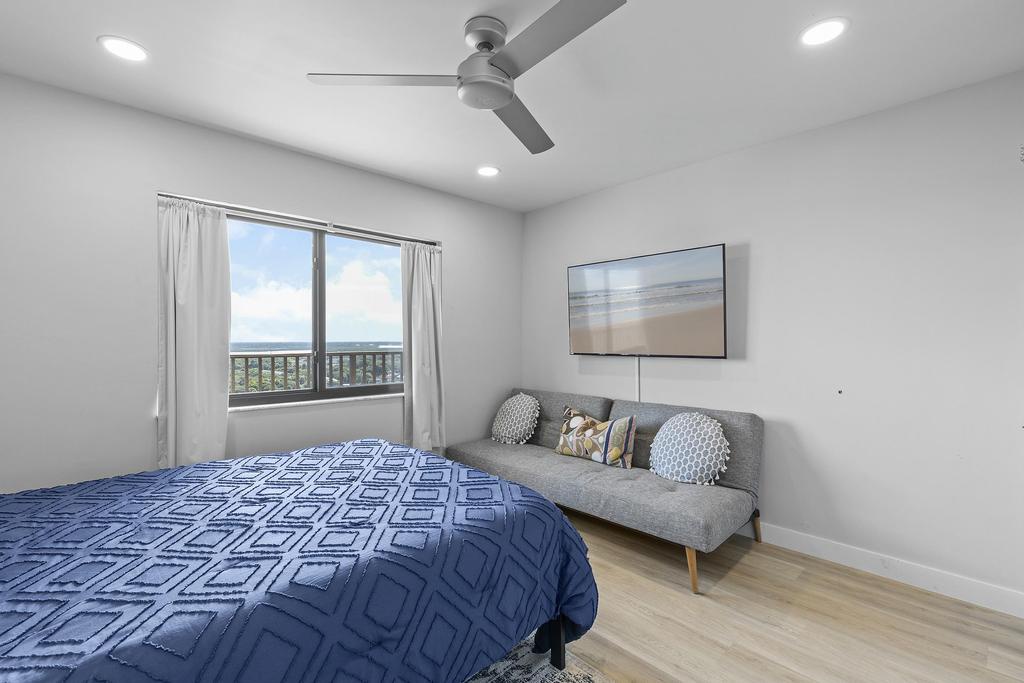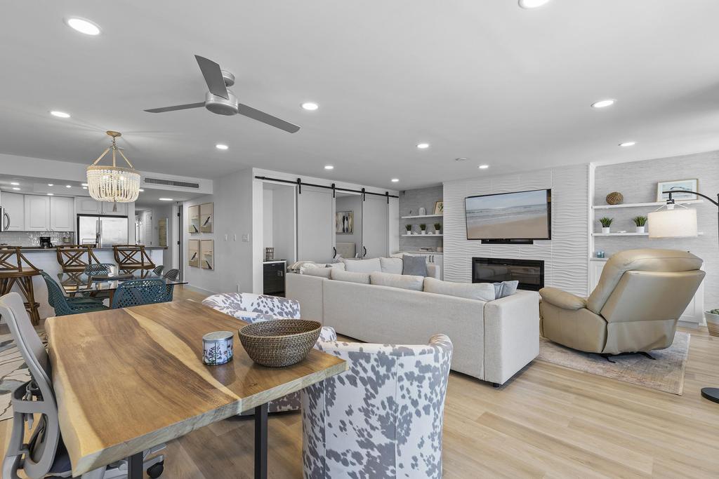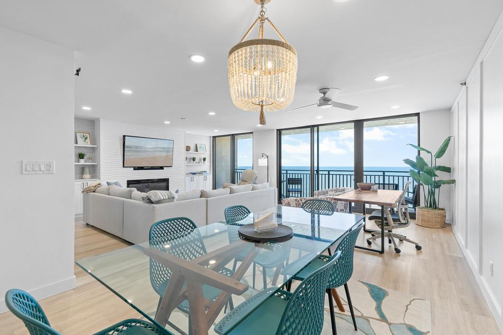 In the living room, custom low-voltage recessed lighting creates a warm, ambient glow, while a sleek fireplace adds both style and comfort—perfect for cozy evenings after a day at the beach. Additional comforts include a fully equipped kitchen with stainless steel appliances, in-unit washer and dryer for added convenience, and plenty of space for dining and lounging. Whether you’re planning a romantic getaway, a trip with friends, or a relaxing beachside workcation, this oceanfront gem offers everything you need for an unforgettable stay in New Smyrna Beach.
