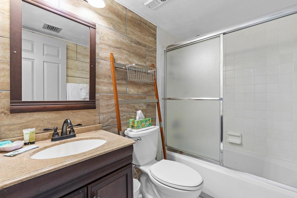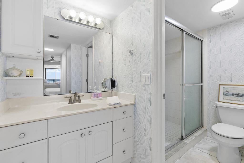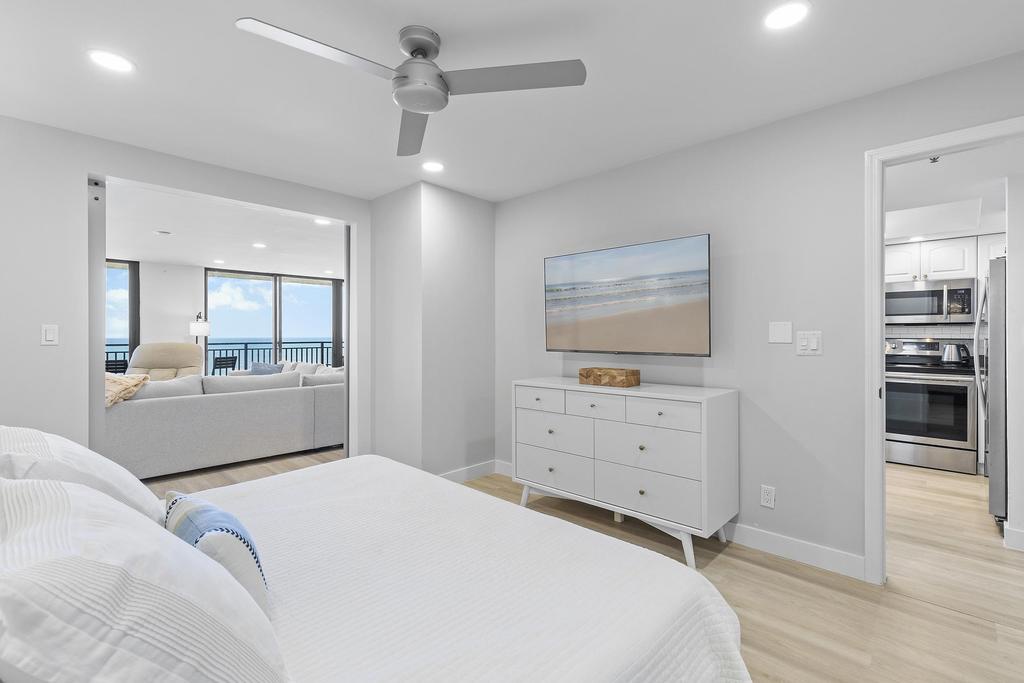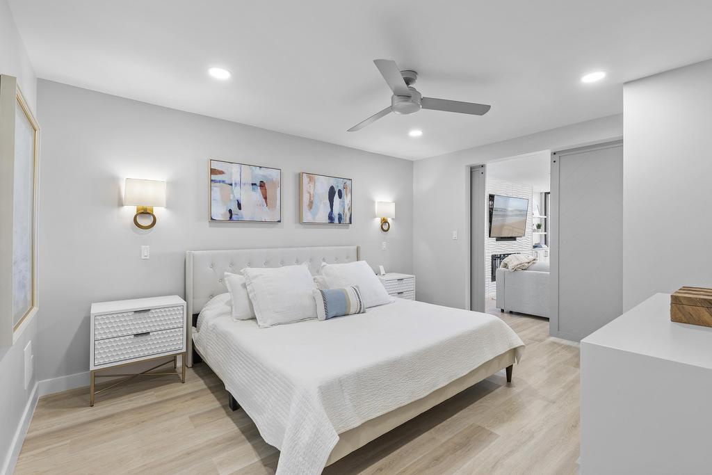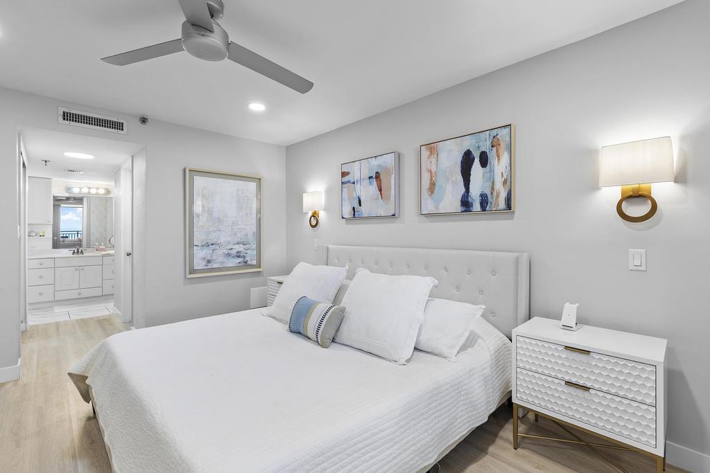 The thoughtfully designed layout includes a spacious primary suite that features charming barn doors and a view that lets you watch the waves without leaving your king-sized bed. The en-suite bathroom offers convenience and privacy, while the guest bedroom, outfitted with a plush queen bed, is equally inviting and well-appointed. With tasteful coastal décor and plenty of natural light throughout, every corner of this condo feels like a true retreat.