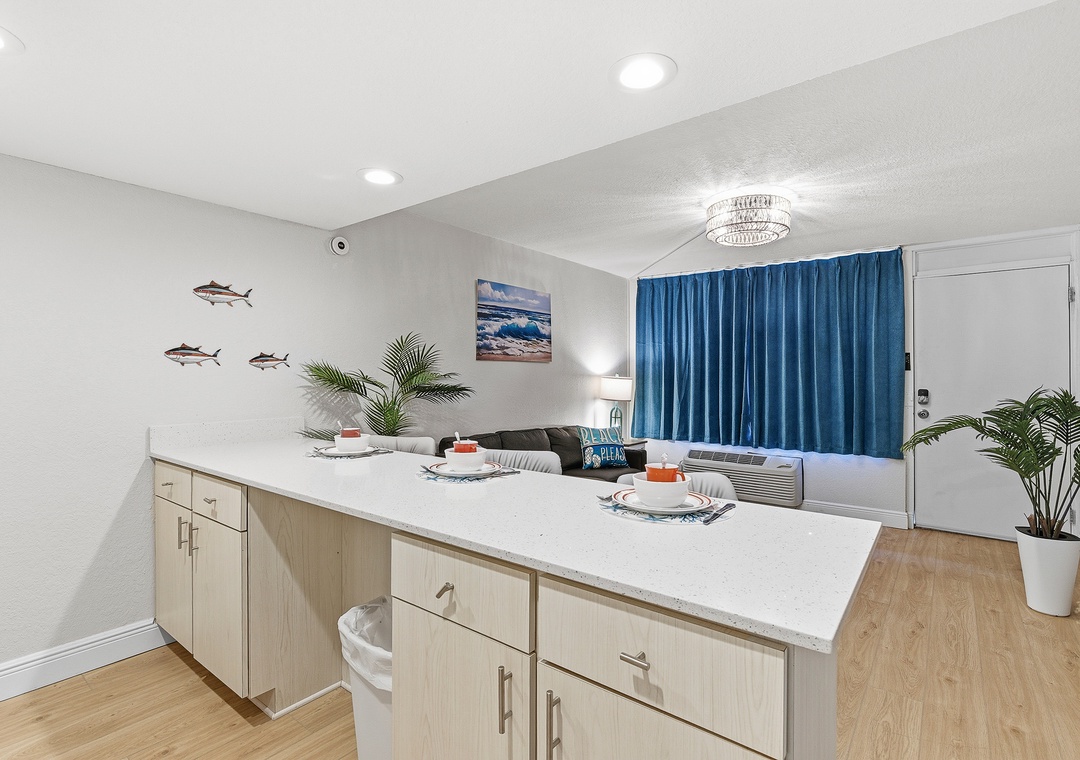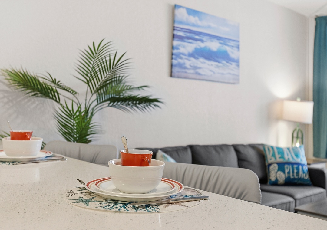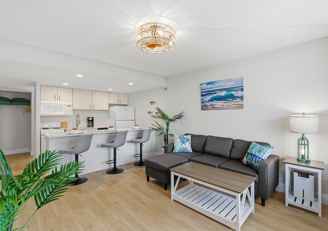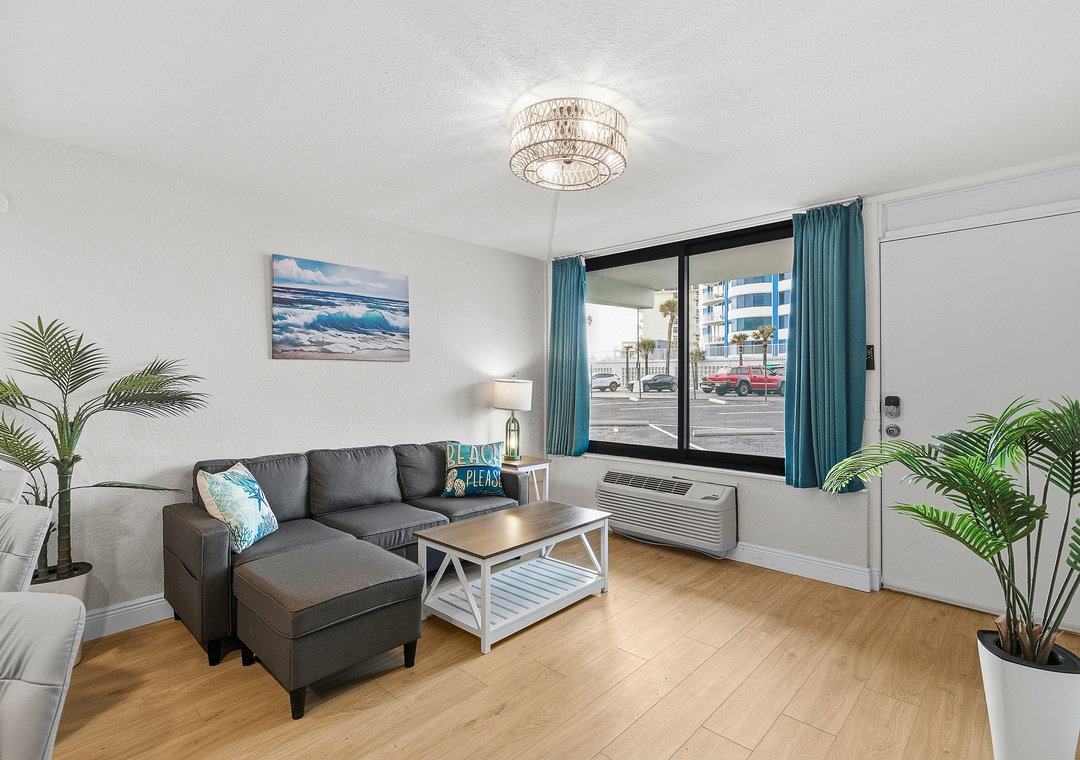 Welcome to this ground-floor one-bedroom, two-bathroom condo in Daytona Beach — a comfortable and stress-free escape perfect for couples, friends, or a small family getaway. No stairs, no hassle; just park, drop your bags, and head straight for the beach. The bedroom features two queen beds separated by a half-wall divider, offering a touch of privacy while keeping the layout open and easygoing. A sleeper sofa in the living area allows the condo to comfortably accommodate up to six guests. Two full bathrooms — one with a tub/shower combination and one with a stand-up shower — make it easy for everyone to get ready without the wait, and the full kitchen with bar seating for three is perfect for morning coffee or evening drinks after a long day in the sun.