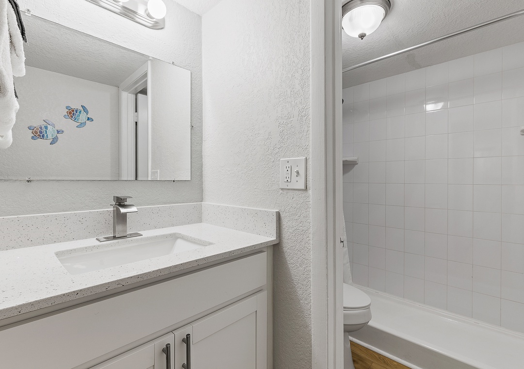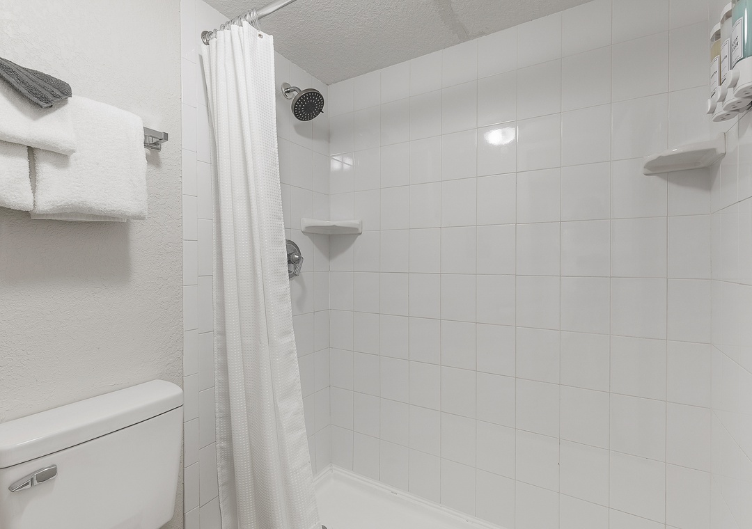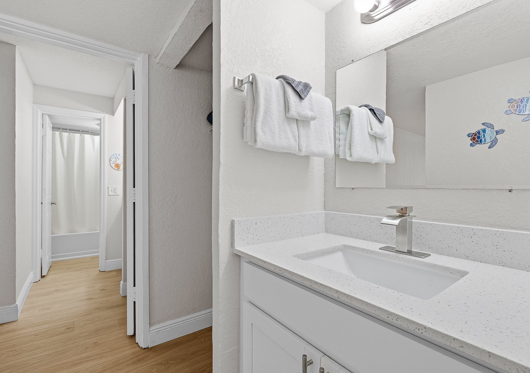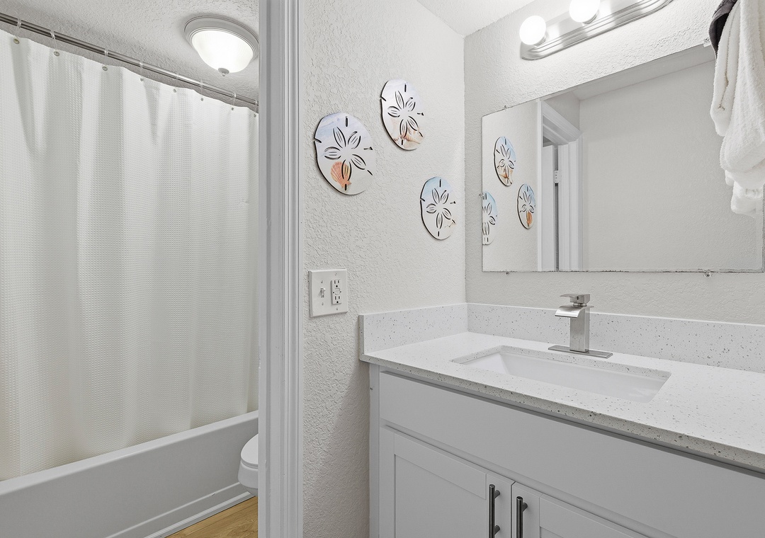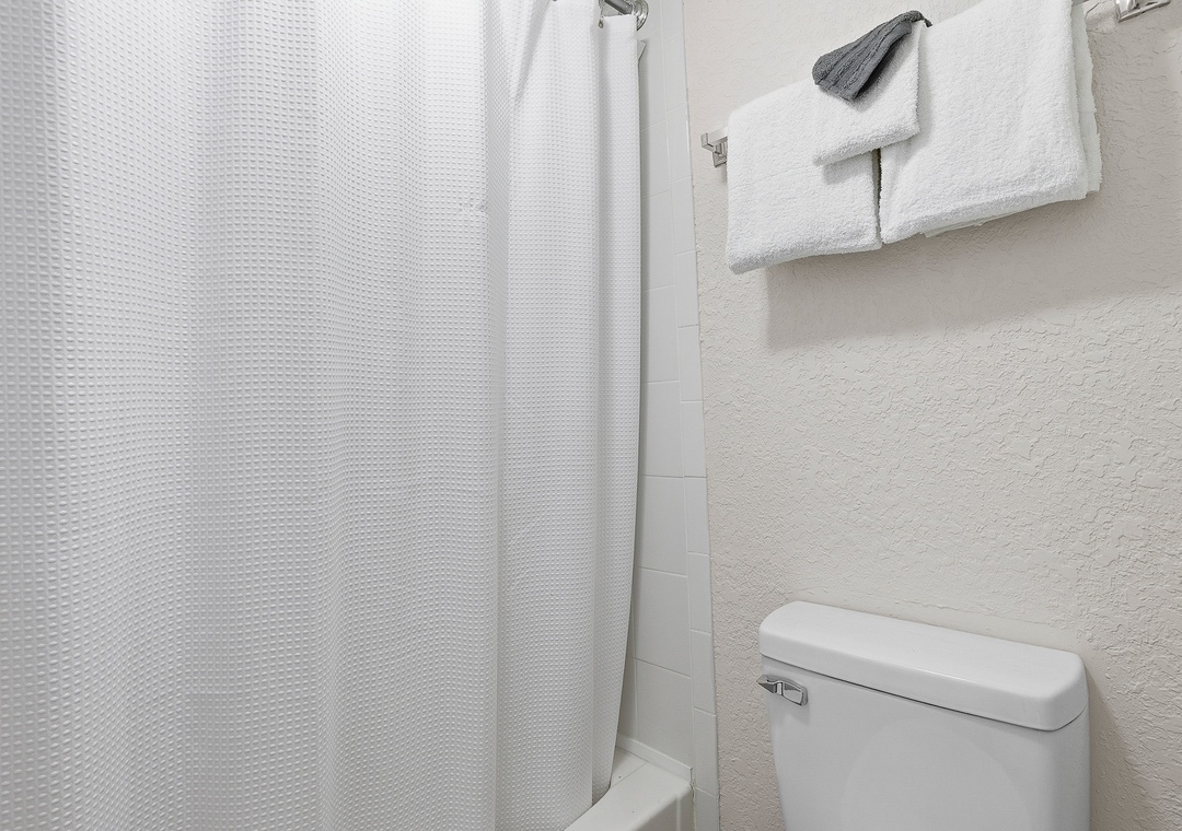 Welcome to this ground-floor one-bedroom, two-bathroom condo in Daytona Beach — a comfortable and stress-free escape perfect for couples, friends, or a small family getaway. No stairs, no hassle; just park, drop your bags, and head straight for the beach. The bedroom features two queen beds separated by a half-wall divider, offering a touch of privacy while keeping the layout open and easygoing. A sleeper sofa in the living area allows the condo to comfortably accommodate up to six guests. Two full bathrooms — one with a tub/shower combination and one with a stand-up shower — make it easy for everyone to get ready without the wait, and the full kitchen with bar seating for three is perfect for morning coffee or evening drinks after a long day in the sun.