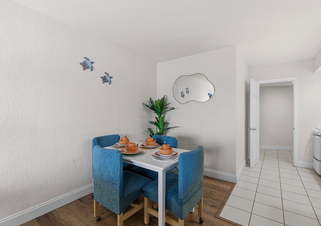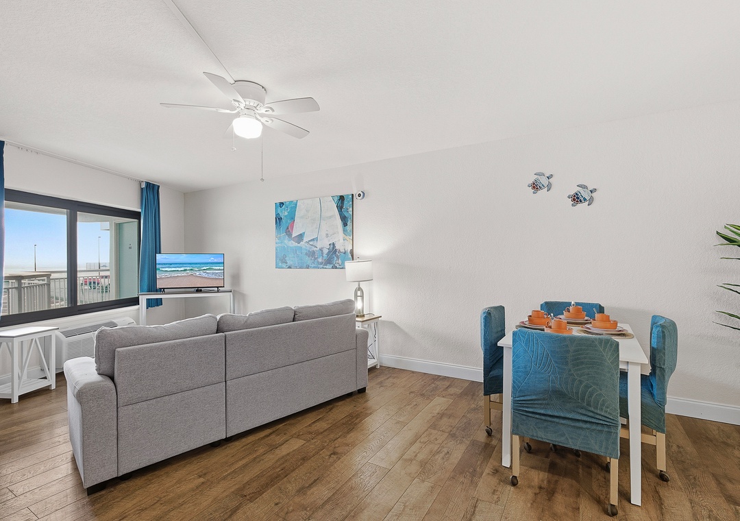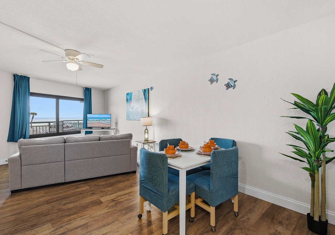 Welcome to this top-floor one-bedroom, two-bathroom condo offering beautiful ocean views in a quiet two-story building just minutes from the best of Daytona Beach. The bedroom features two queen beds, and the living area includes a sleeper sofa, allowing the condo to comfortably sleep up to six guests — making it a great fit for couples, friends, or a small family getaway. Two full bathrooms, one with a tub/shower combination and one with a stand-up shower, make it easy for everyone to get ready without the wait. The full kitchen is equipped for everything from quick breakfasts to beach snacks, and the dining table seats four — perfect for meals or mapping out your next beach day.