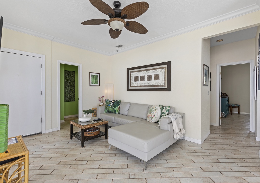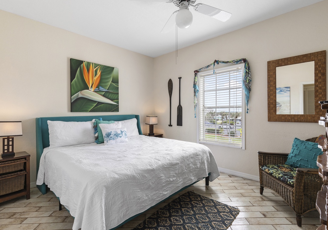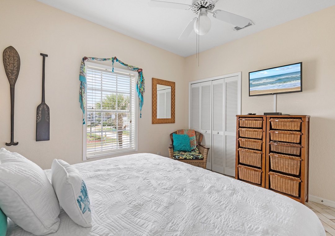 The living room, bathed in natural light from a wall of windows, invites you to relax on a large, comfy couch while watching your favorite show on the flat-screen TV. The primary bedroom offers a king bed, private patio access, and plenty of storage space, along with a nearby half bath. The second bedroom has two twin beds, a flat-screen TV, and lots of natural light, making it great for kids. Outside, enjoy the refreshing pool or take a short stroll to JB’s Fish Camp and Bethune Beach Park. This 14-unit condo complex, located near the Canaveral National Seashore, provides a peaceful and relaxing retreat away from the hustle and bustle.