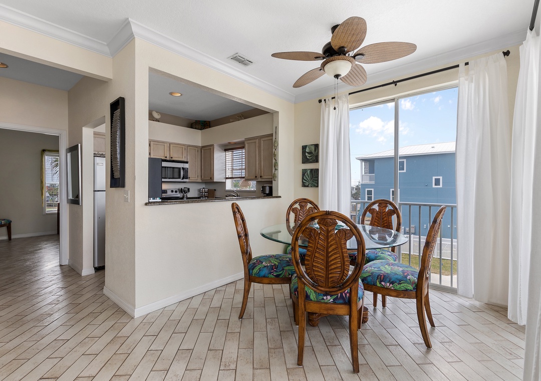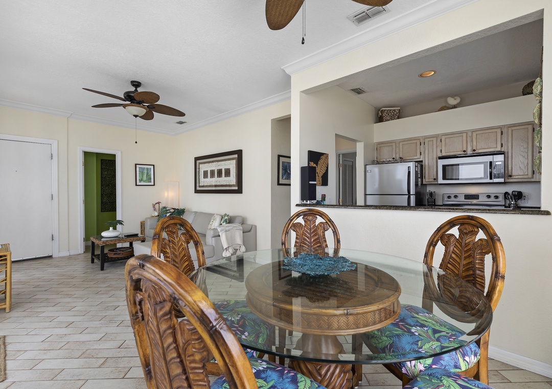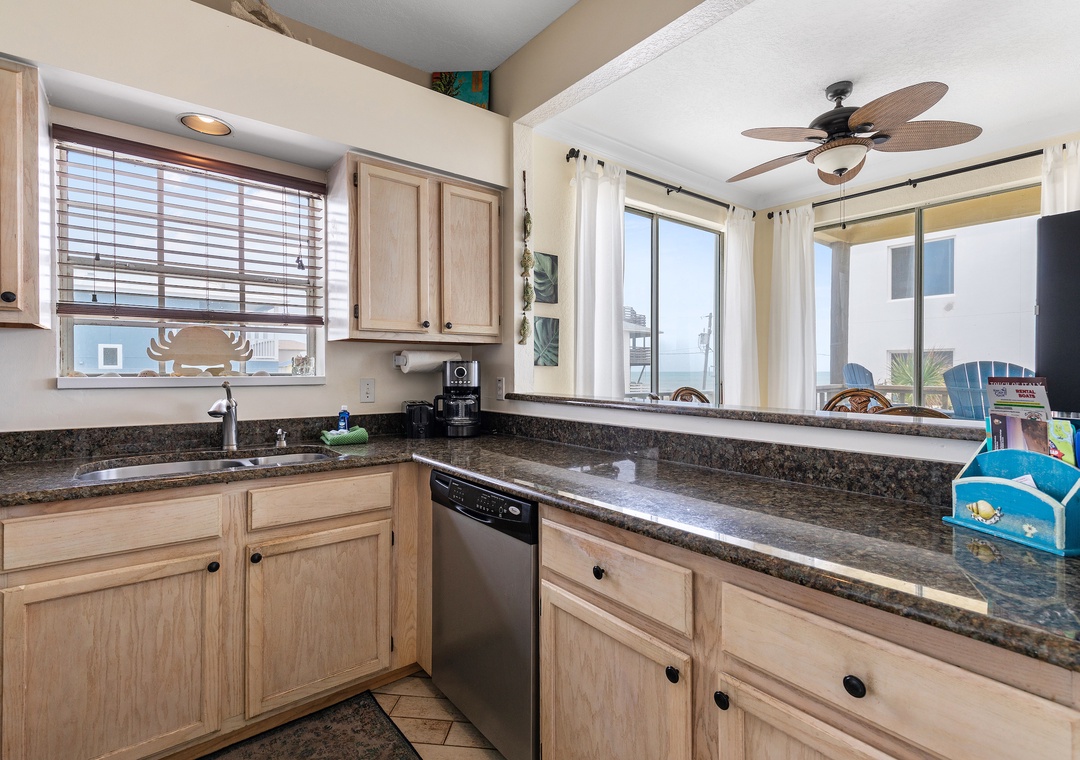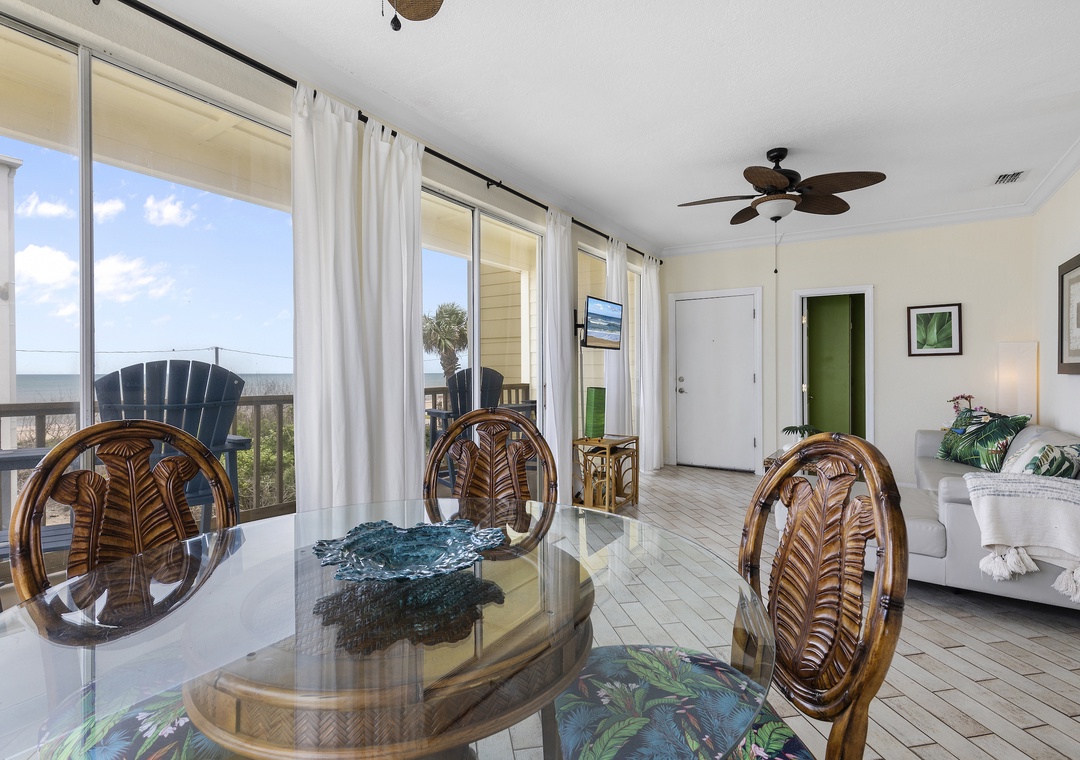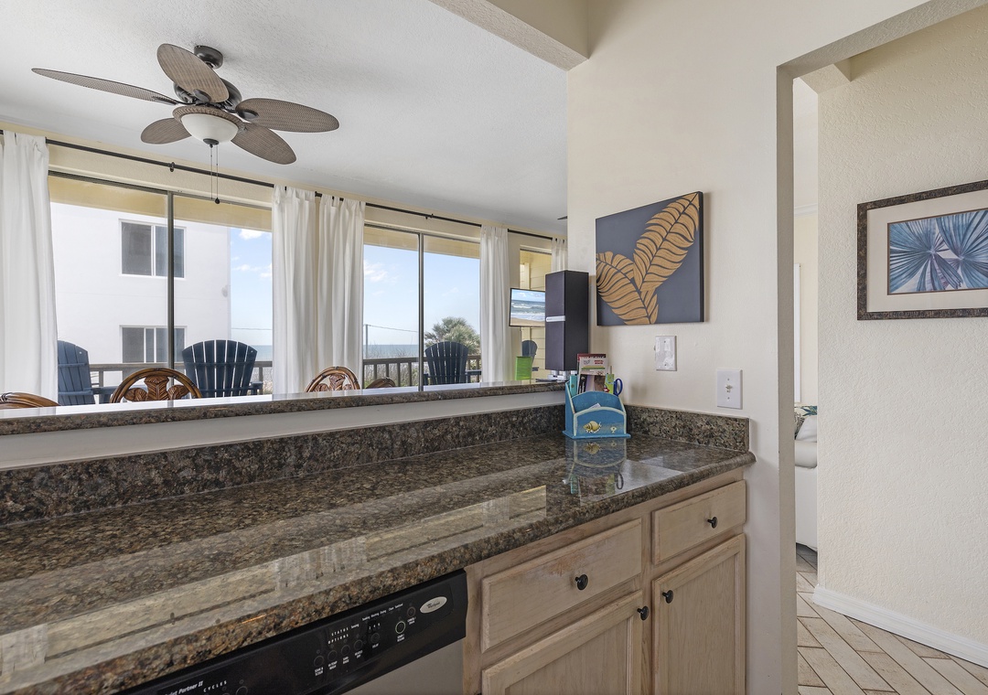 Ocean Club at Turtle Mound 101 is a charming ocean-view condo located in the tranquil Bethune Beach area of New Smyrna Beach. This spacious unit boasts 10-foot ceilings and an open layout that welcomes you with a newly renovated kitchen featuring granite countertops, stainless steel appliances, and ample storage. Fully equipped with all the kitchen gadgets you could need, it’s perfect for preparing meals for family or friends. Adjacent to the kitchen is a sunlit dining area with a glass-top table for six, ideal for meals, games, or catching up on the free internet, with views of the spacious patio.
