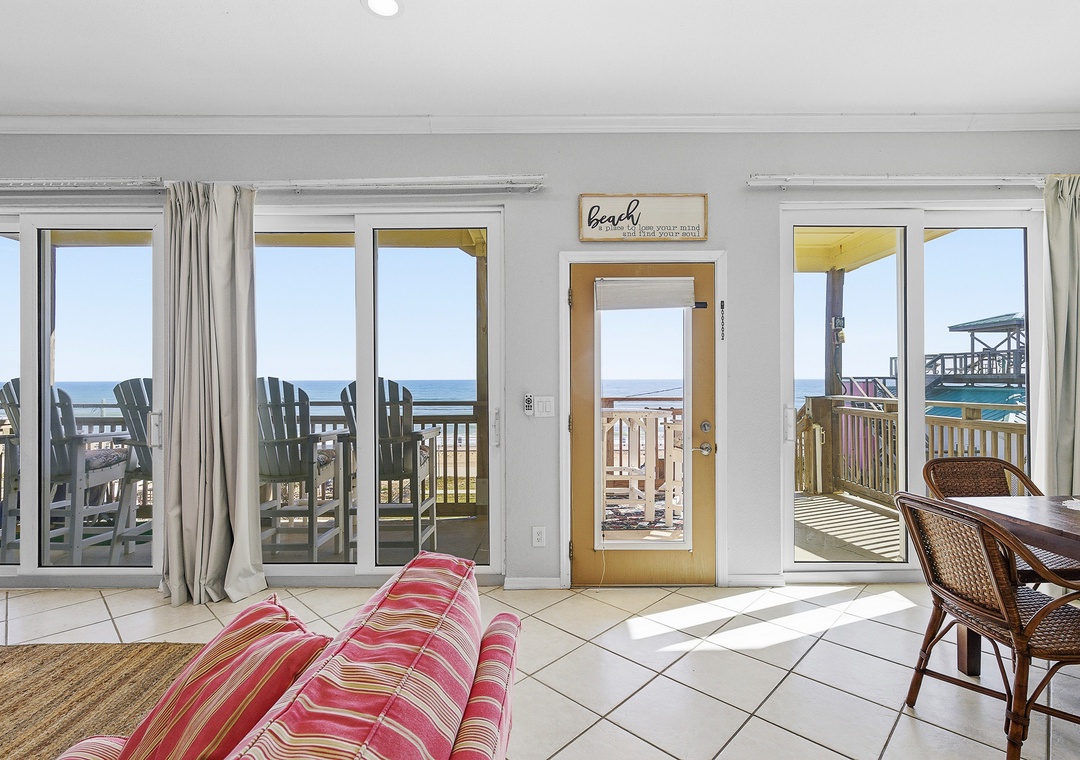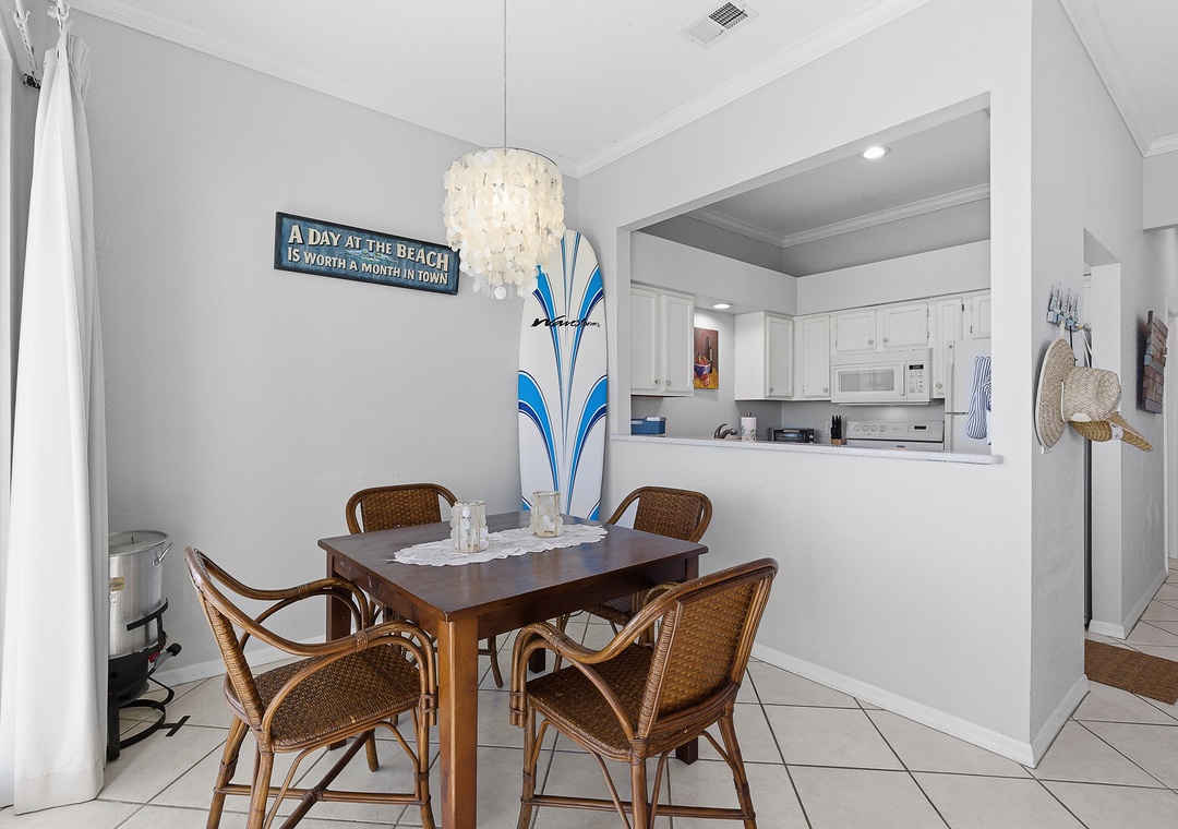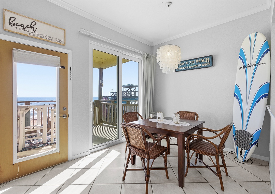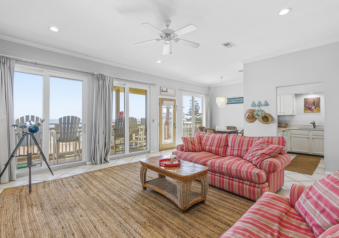 Ocean Club at Turtle Mound 205 is a charming ocean-view condo located in the tranquil Bethune Beach with coral colored sand and one of the best surfing spots in New Smyrna Beach. This spacious unit boasts 10-foot ceilings and a glass wall of nothing but views. This unit has a comfortable, relaxing feel. Fully equipped with all the kitchen gadgets you could need, it’s perfect for preparing meals for family or friends. Adjacent to the kitchen is a sunlit dining area and table for four, ideal for meals, games, or catching up on the free internet, with views of the spacious patio.