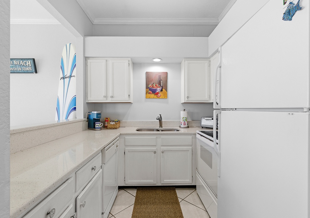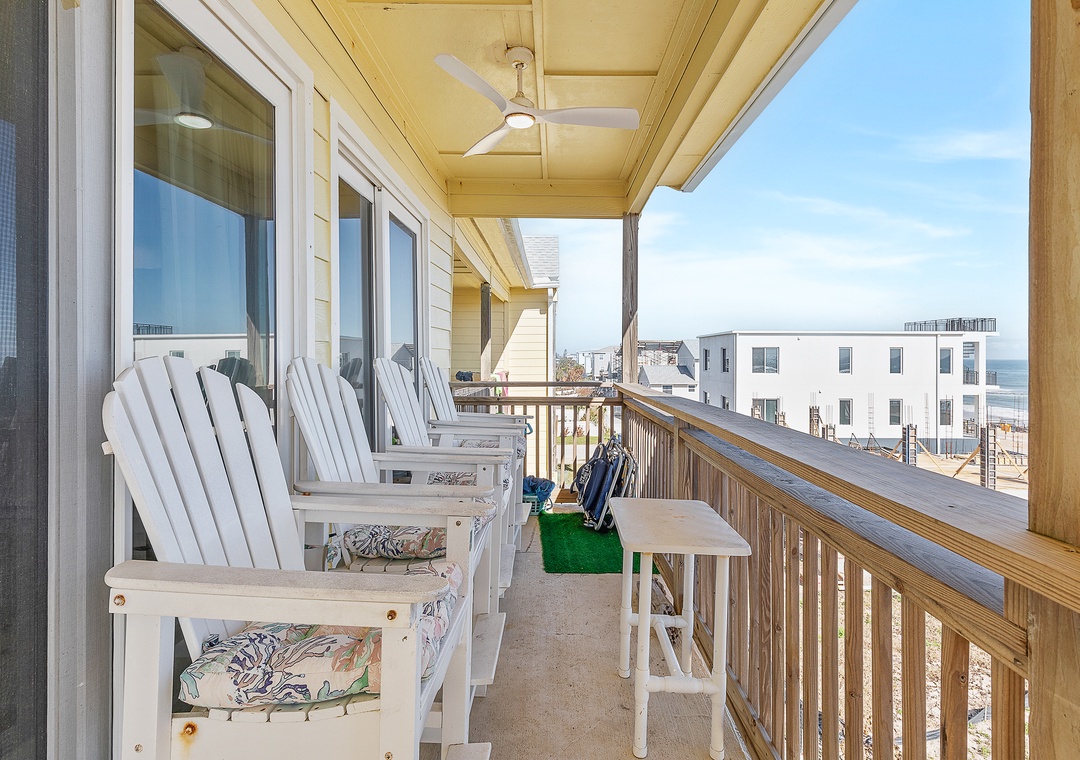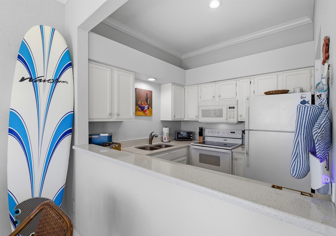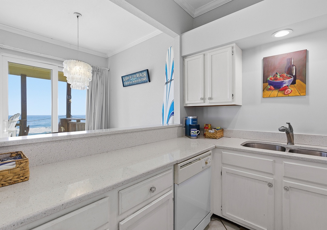 Ocean Club at Turtle Mound 205 is a charming ocean-view condo located in the tranquil Bethune Beach with coral colored sand and one of the best surfing spots in New Smyrna Beach. This spacious unit boasts 10-foot ceilings and a glass wall of nothing but views. This unit has a comfortable, relaxing feel. Fully equipped with all the kitchen gadgets you could need, it’s perfect for preparing meals for family or friends. Adjacent to the kitchen is a sunlit dining area and table for four, ideal for meals, games, or catching up on the free internet, with views of the spacious patio.