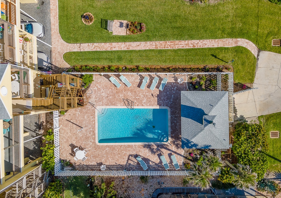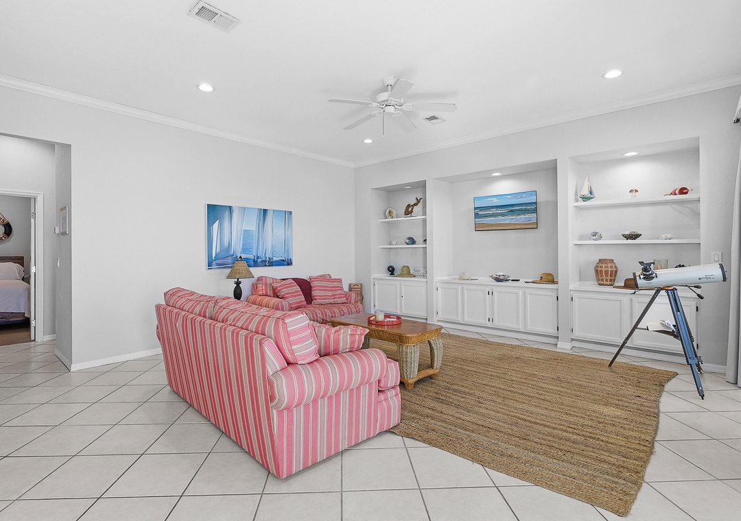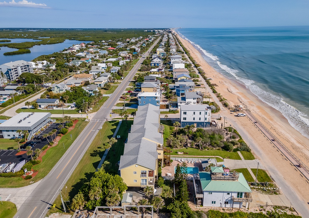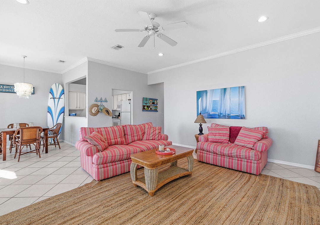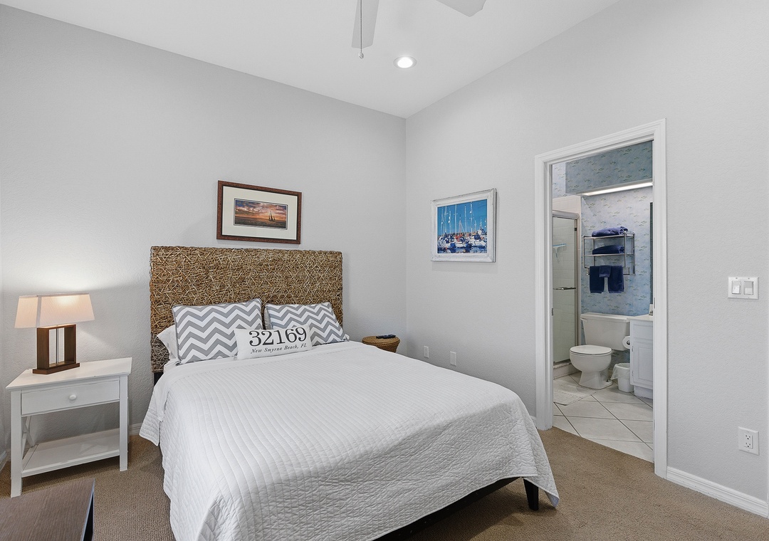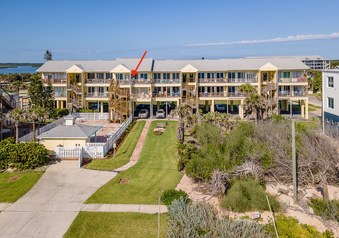 The living room, bathed in natural light from a wall of windows, invites you to relax on a large, comfy couch while watching your favorite show on the flat-screen TV. The primary bedroom offers a king bed and plenty of storage space. The second bedroom has two full size beds, a flat-screen TV, and lots of natural light, making it great for kids. Outside, enjoy the refreshing pool or take a short stroll to JB’s Fish Camp and Bethune Beach Park. This 14-unit condo complex, located near the Canaveral National Seashore, provides a peaceful and relaxing retreat away from the hustle and bustle.