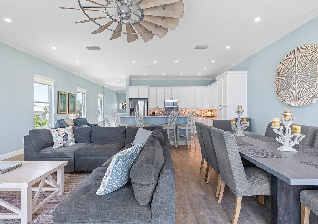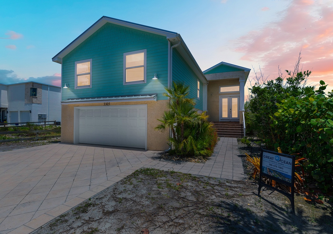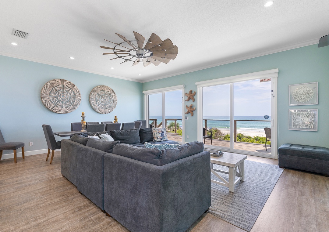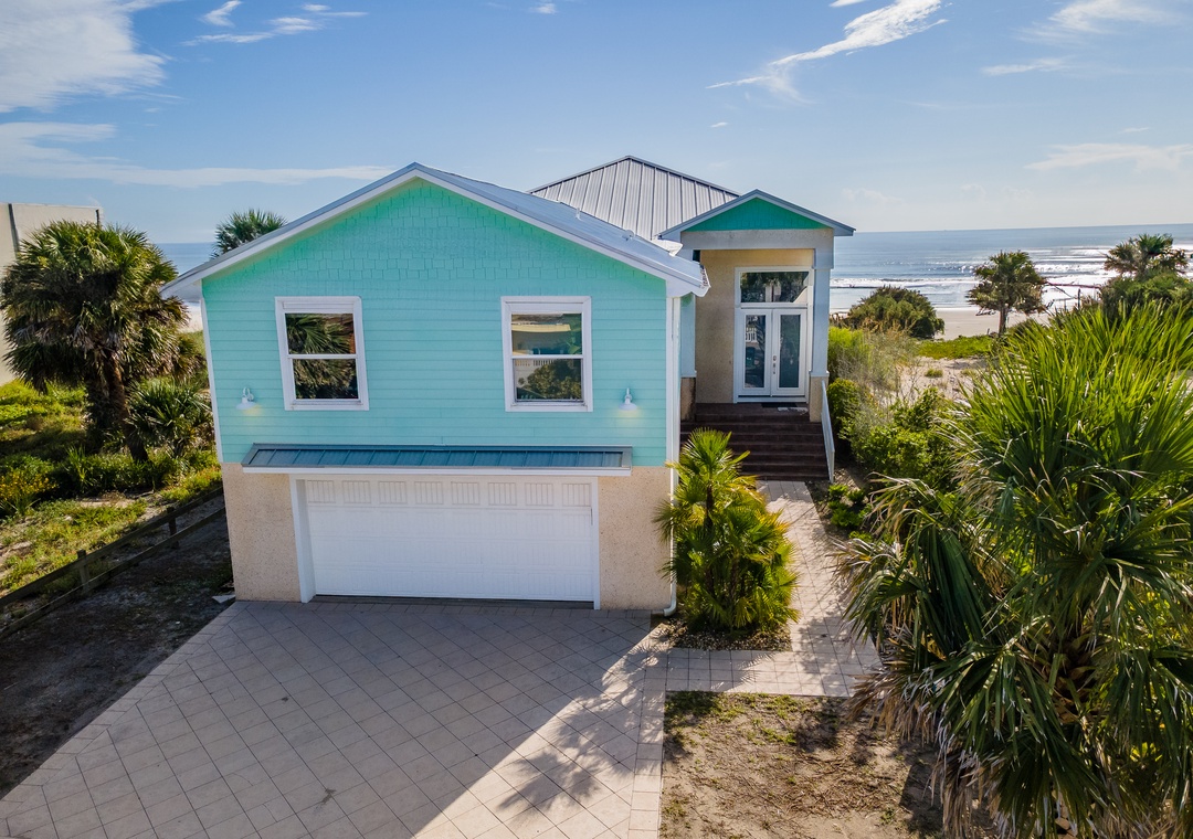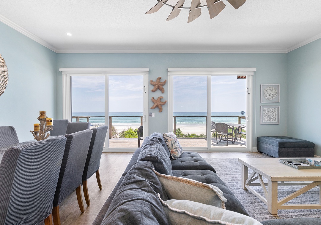 When you arrive at this NSB beach house, you'll find plenty of parking available. The garage is 21 feet deep and accommodates two cars; the driveway provides additional parking. Step inside and begin exploring the home's main level on the second floor. The kitchen, living room, and dining room all share an unobstructed view of the ocean horizon.