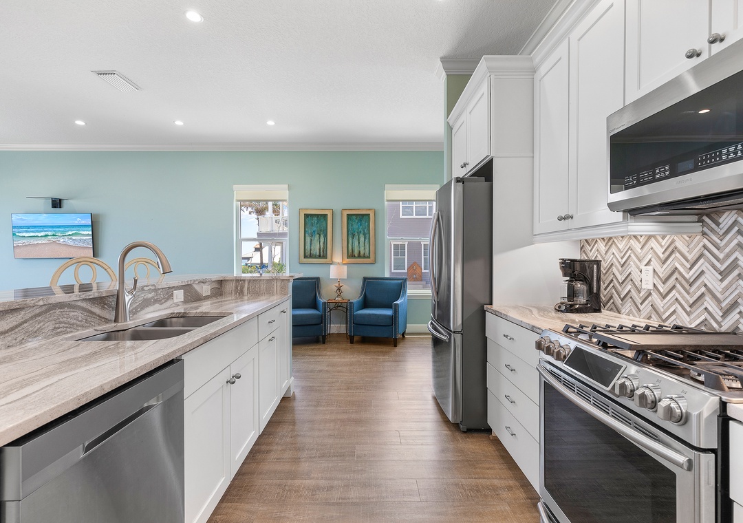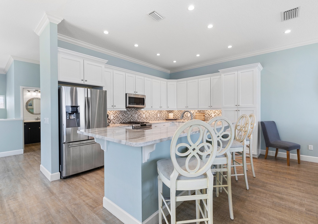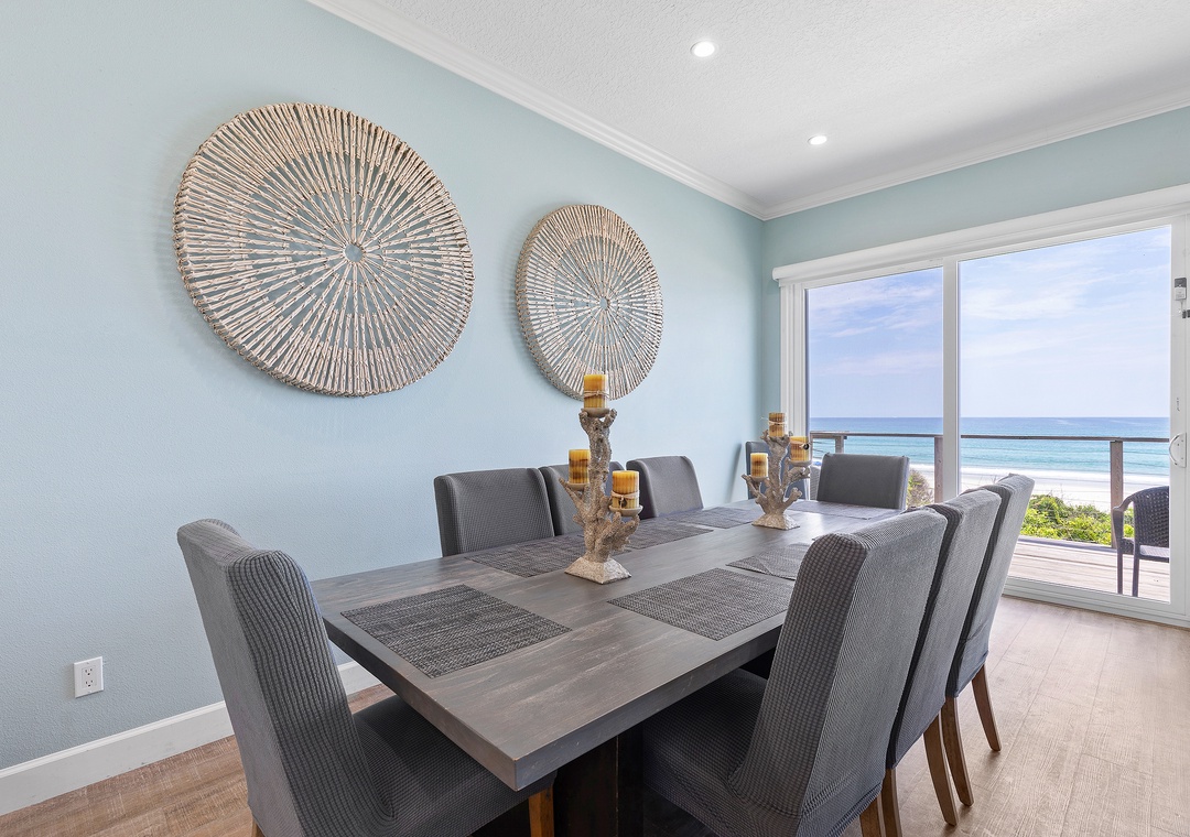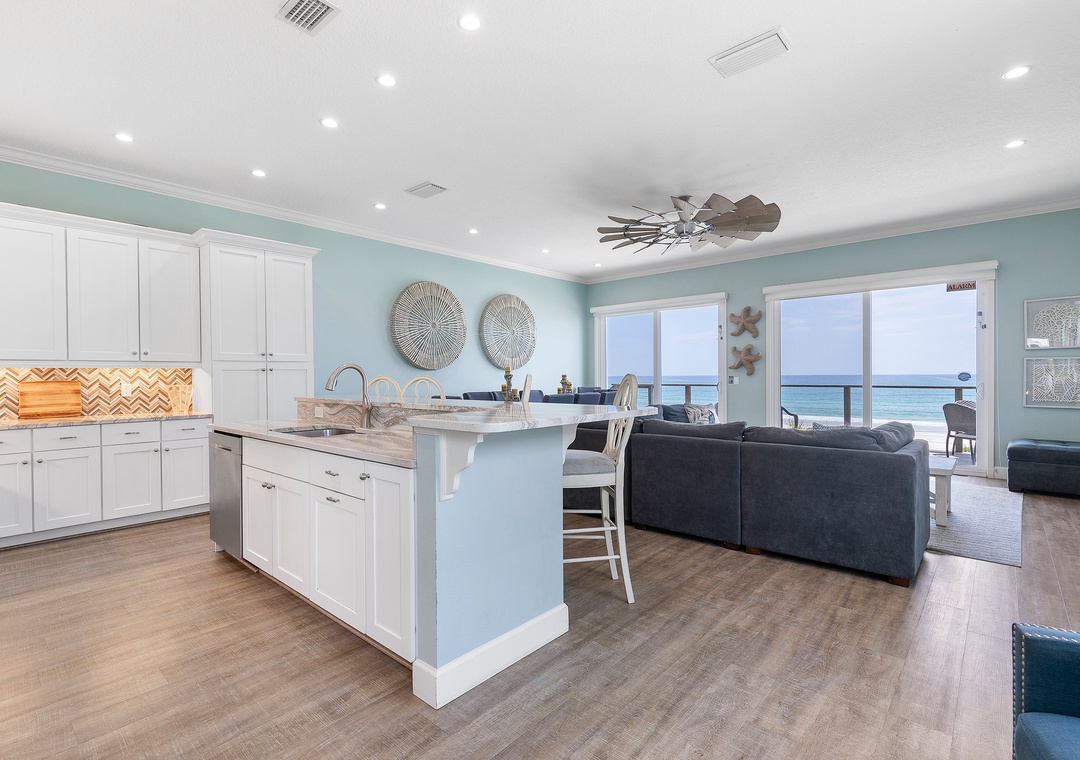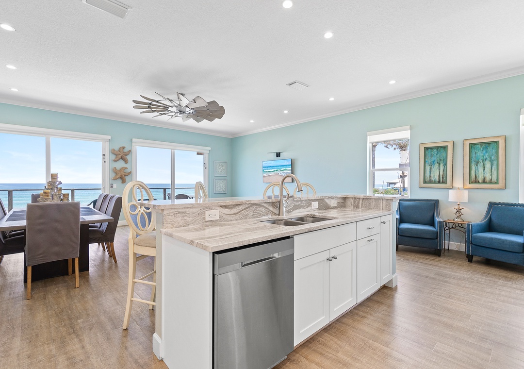 As you enjoy the gorgeous scenery, unpack your groceries in the updated kitchen. This space boasts of white cabinetry, stainless steel appliances, and marble countertops. You'll find it well stocked with dinnerware, cookware, a drip coffee maker, and all the essentials you need. Nobody will hesitate to wash dishes as the sink and island look onto the waves. When you're ready to eat, gather at the breakfast bar for 4 or the dining table for 8.